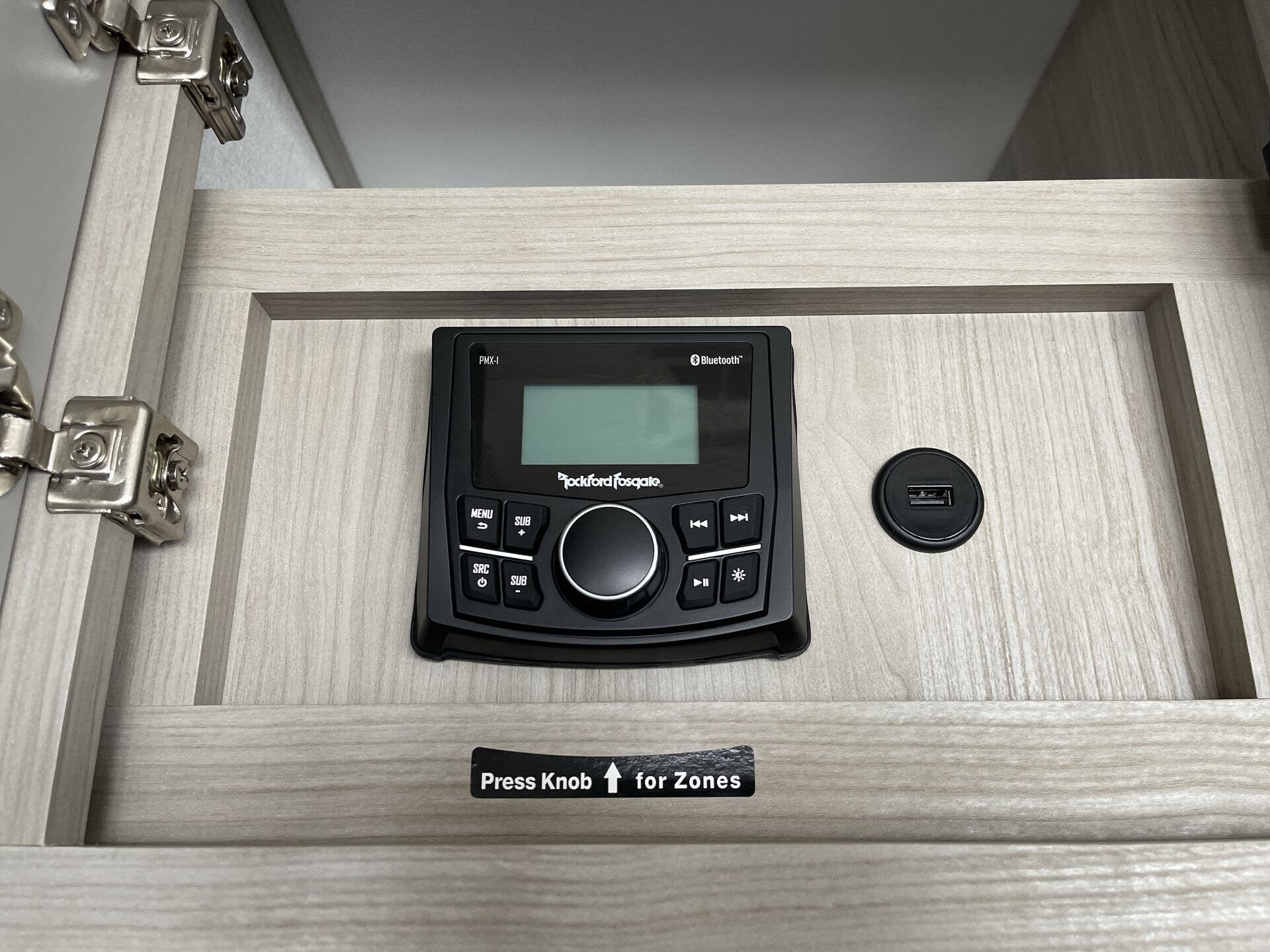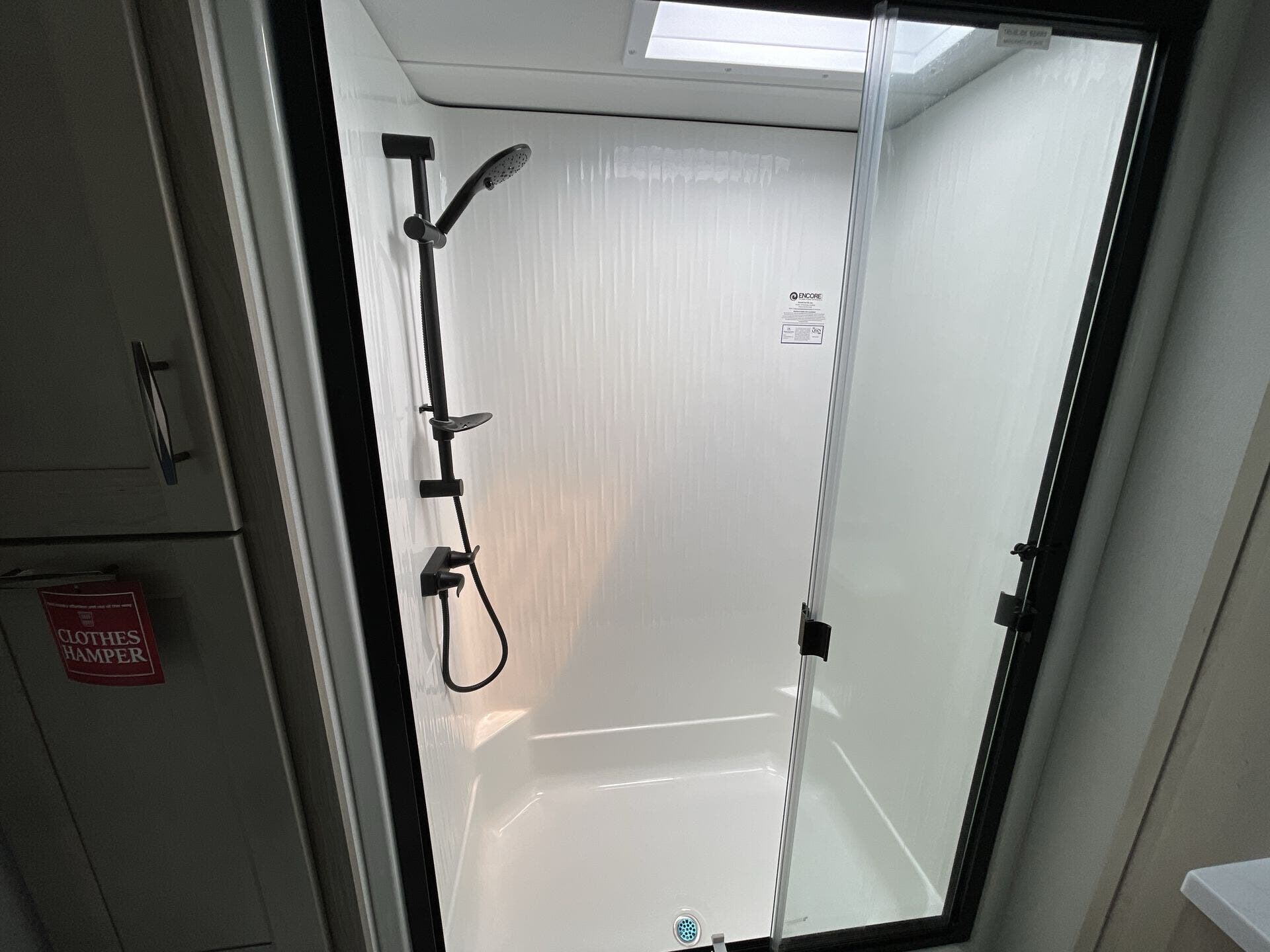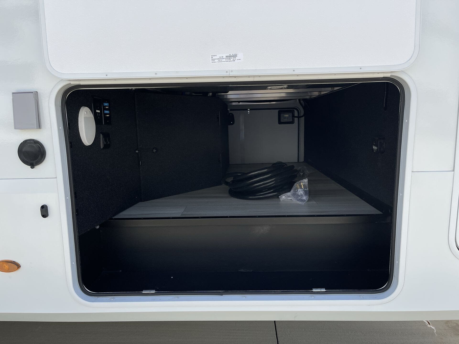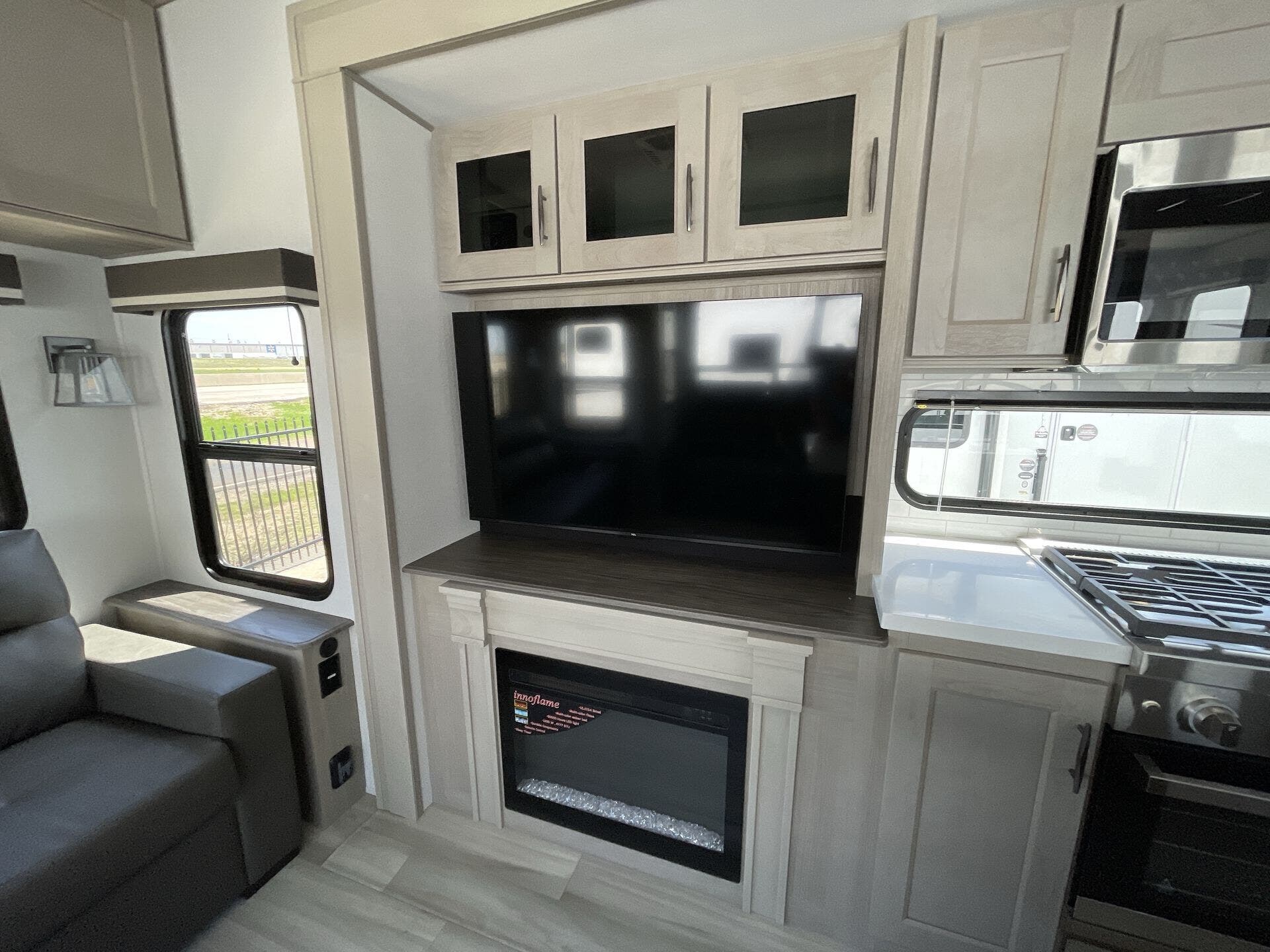 This RV is packed with modern amenities that enhance your camping experience. Stay cool during hot summer days with the efficient 15,000 BTU air conditioning unit, or enjoy a cozy evening with a built-in fireplace. Additional features like an exterior awning, exterior speakers for your favorite tunes, and an external shower for rinsing off after outdoor activities, make every moment enjoyable.
