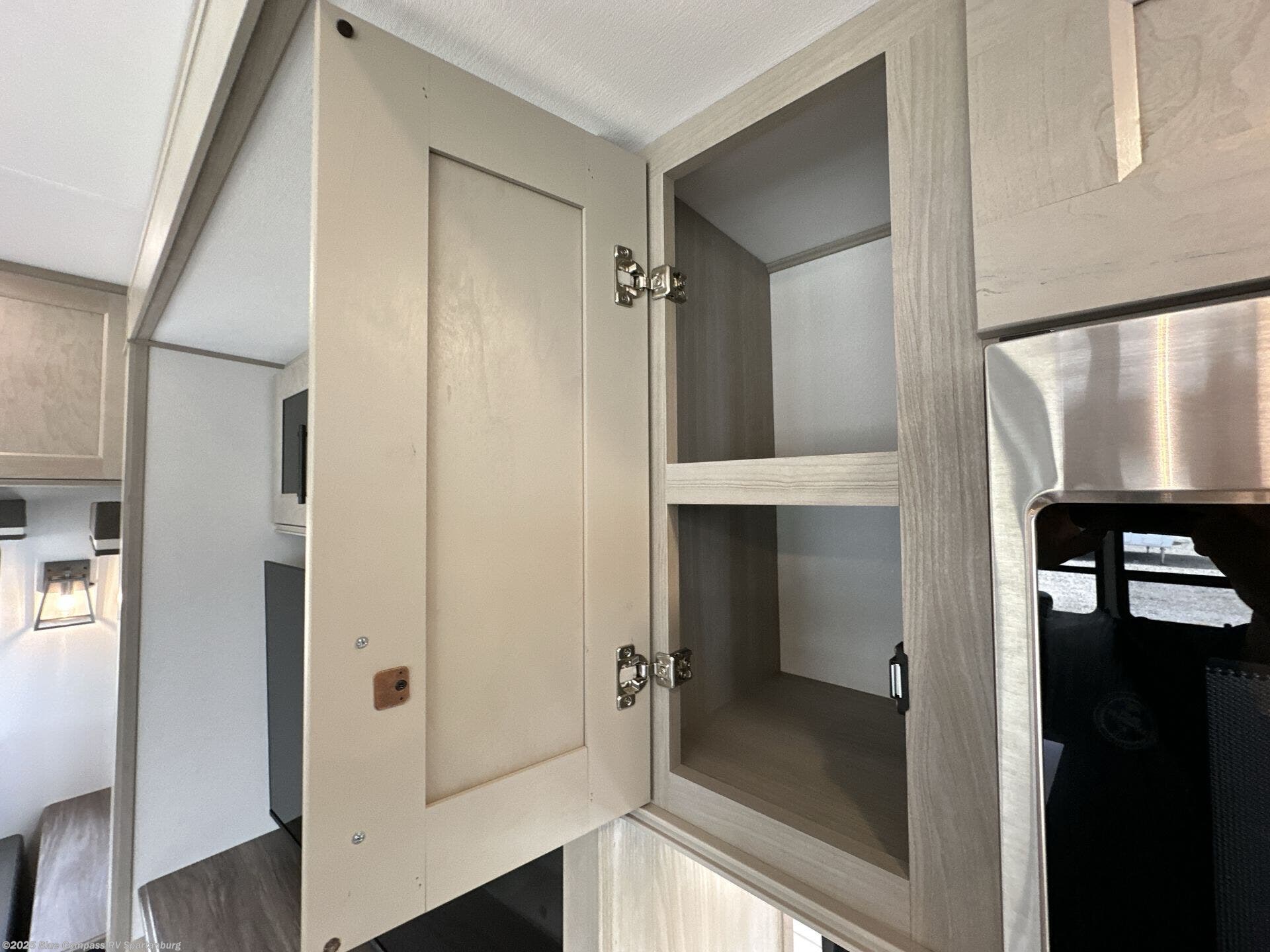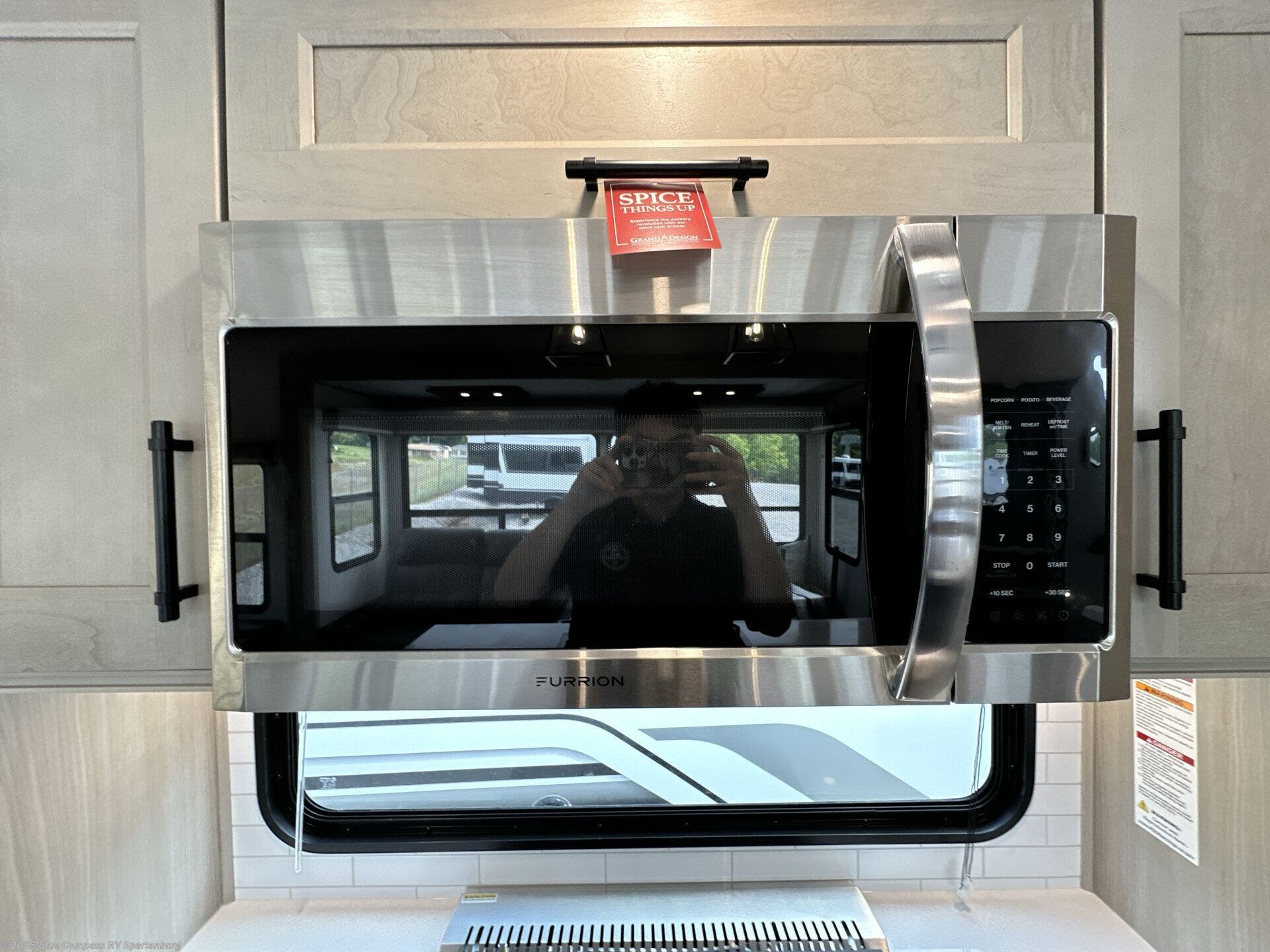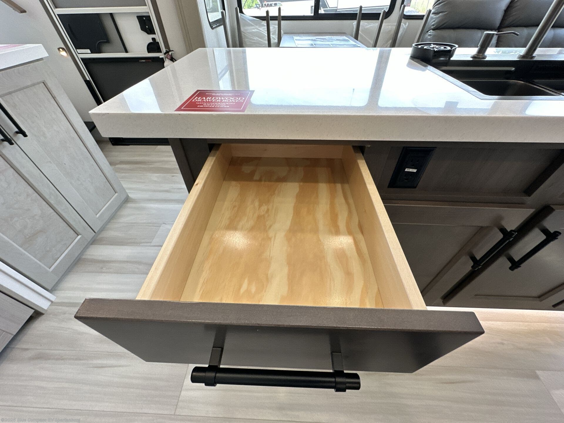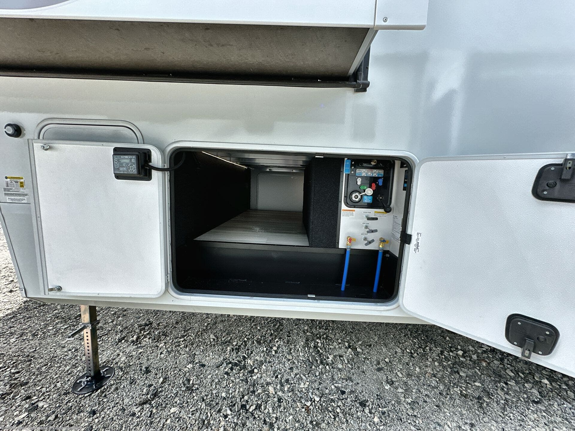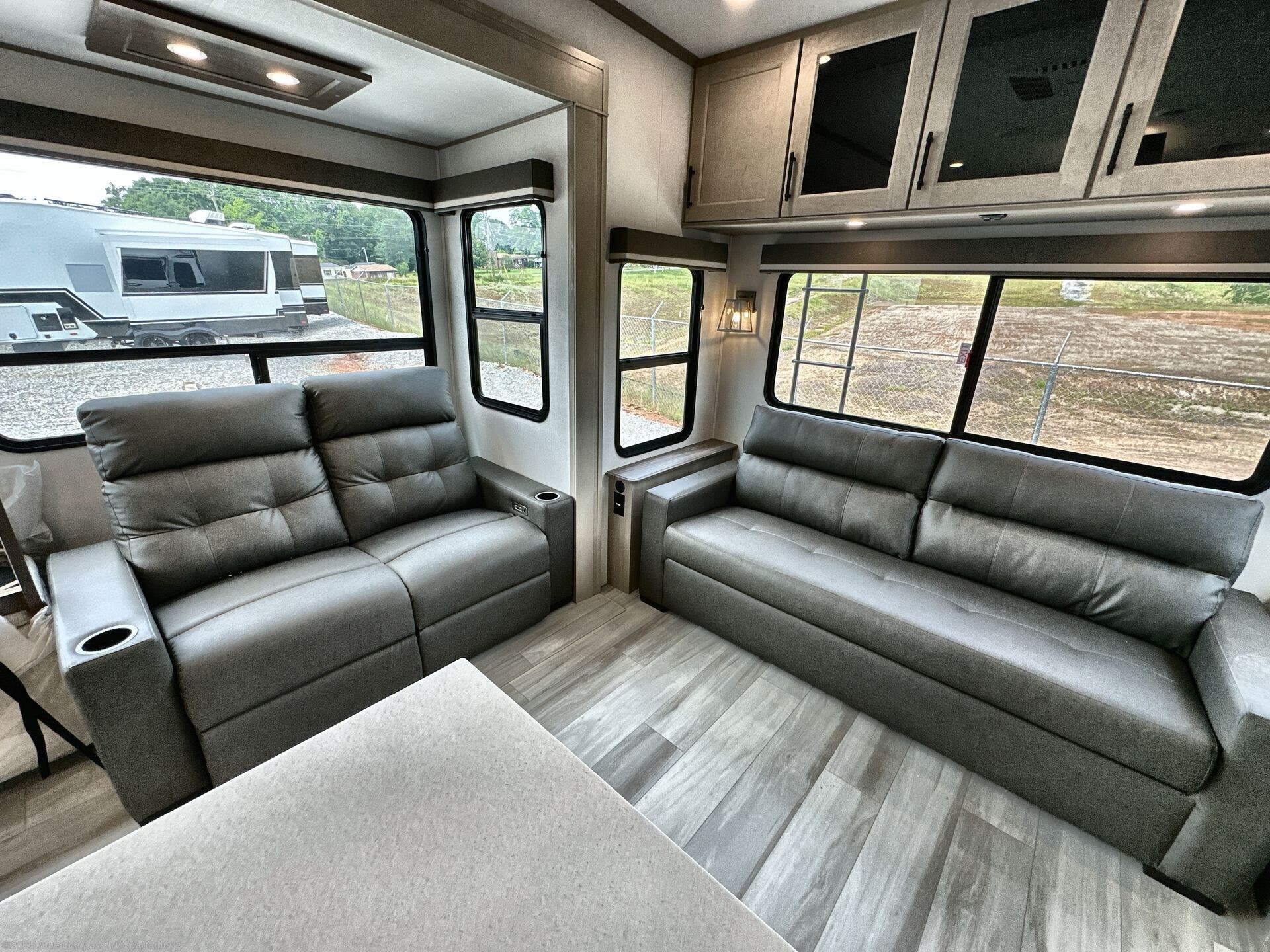 You'll feel right at home in this spacious fifth wheel with triple slides, a front master bedroom, and a kitchen island with extra counter space. The theatre seating is right across from the entertainment center which includes a 40" TV and fireplace, and there is a rear tri-fold sofa if you have any guests staying over. This model includes a hutch in the kitchen with cabinets above to store you nice dishes, plus there is a large pantry with washer and dryer prep if you plan to go full-time. Head to the dual entry bath that includes a linen closet and a spacious shower, and check out the front master bedroom with its queen bed, and slide out wardrobe. You can choose the optional king bed if you enjoy a bit more room in bed!