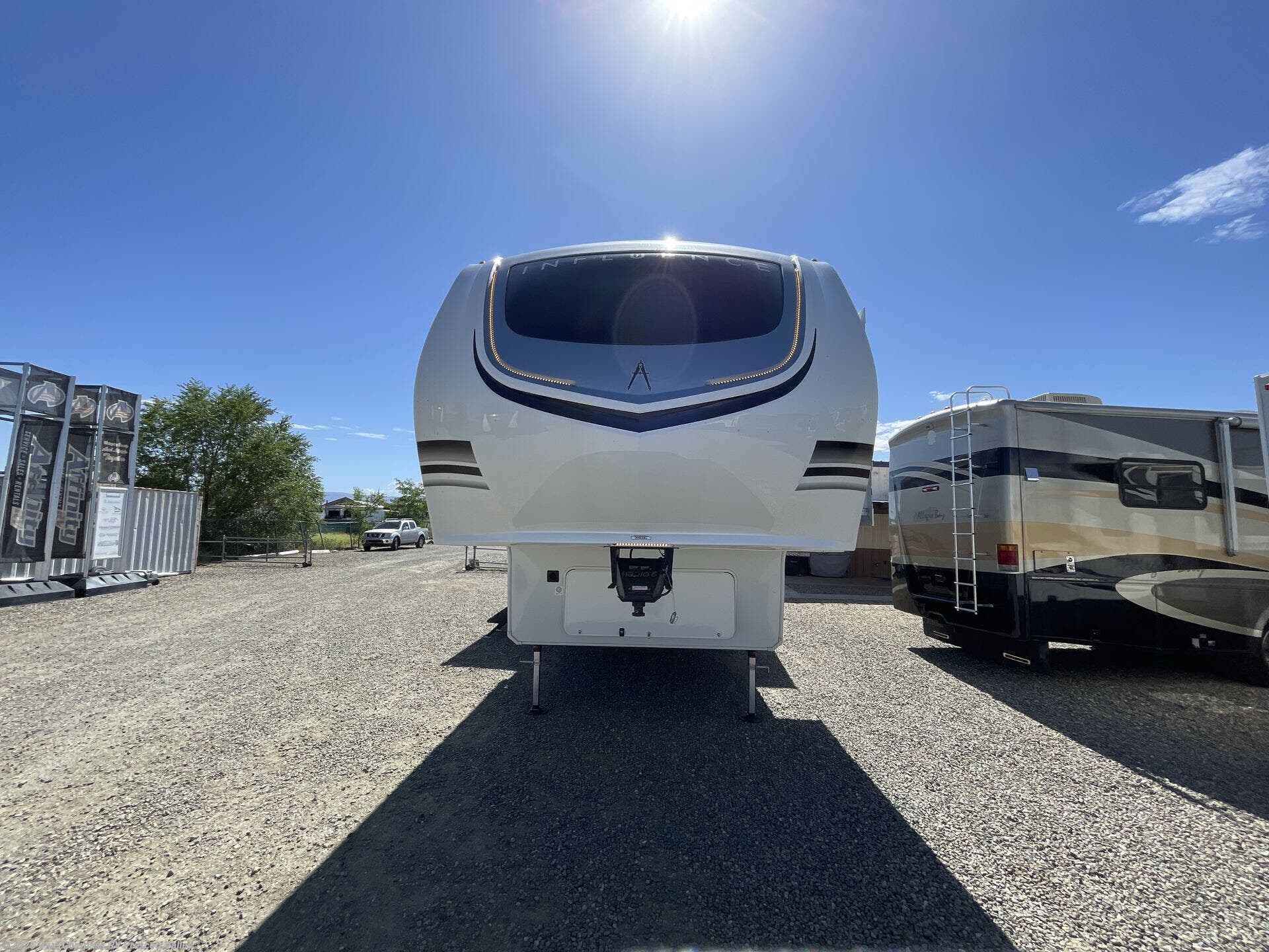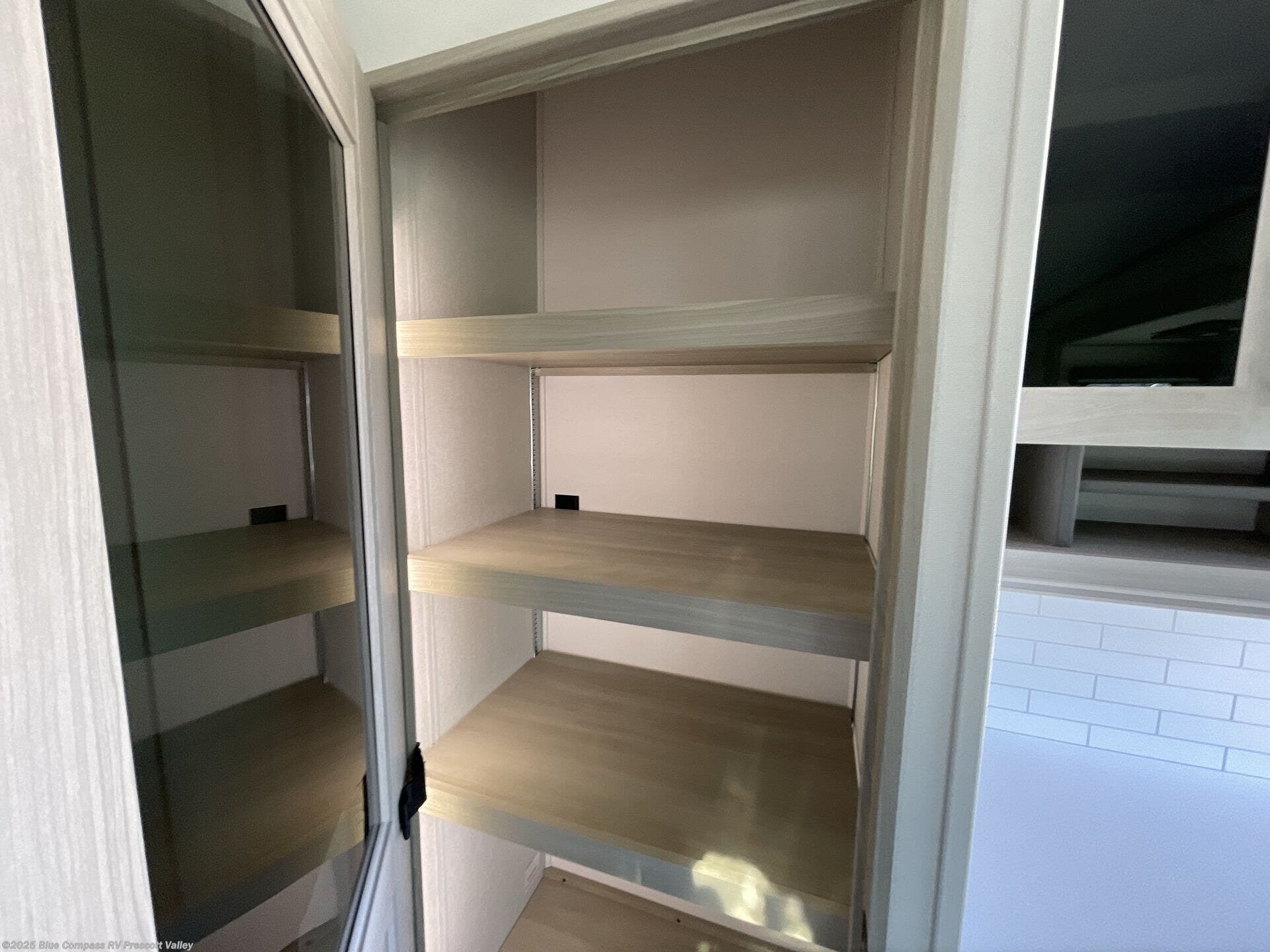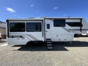 You'll feel right at home in this spacious fifth wheel with triple slides, a front master bedroom, and a kitchen island with extra counter space. The theatre seating is right across from the entertainment center which includes a 40" TV and fireplace, and there is a rear tri-fold sofa if you have any guests staying over. This model includes a hutch in the kitchen with cabinets above to store you nice dishes, plus there is a large pantry with washer and dryer prep if you plan to go full-time. Head to the dual entry bath that includes a linen closet and a spacious shower, and check out the front master bedroom with its queen bed, and slide out wardrobe. You can choose the optional king bed if you enjoy a bit more room in bed!