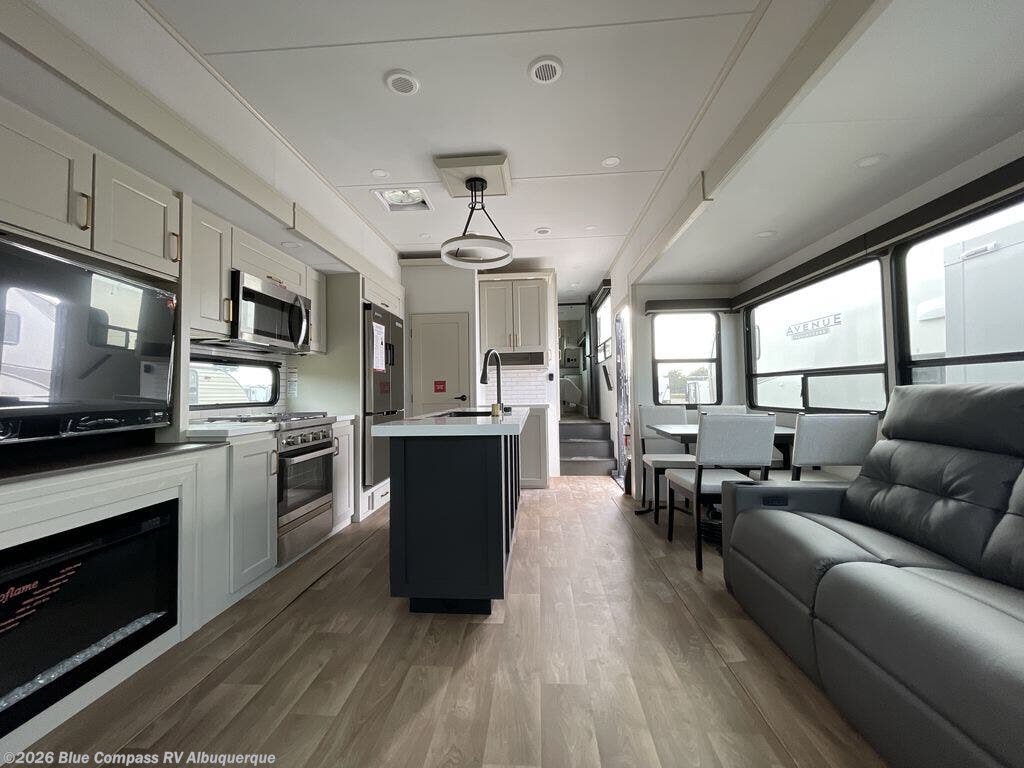 You'll feel right at home in this spacious fifth wheel with triple slides, a front master bedroom, and a kitchen island with extra counter space. The theatre seating is right across from the entertainment center which includes a 40" TV and fireplace, and there is a rear tri-fold sofa if you have any guests staying over. This model includes a hutch in the kitchen with cabinets above to store you nice dishes, plus there is a large pantry with washer and dryer prep if you plan to go full-time. Head to the dual entry bath that includes a linen closet and a spacious shower, and check out the front master bedroom with its queen bed, and slide out wardrobe. You can choose the optional king bed if you enjoy a bit more room in bed!