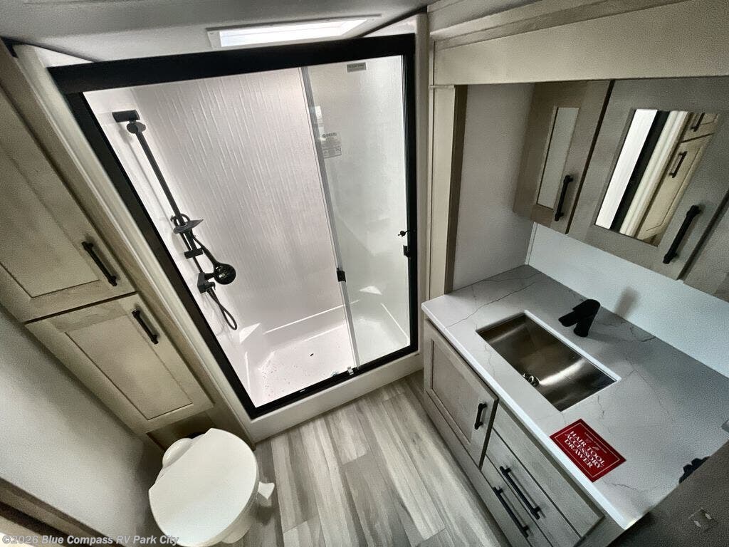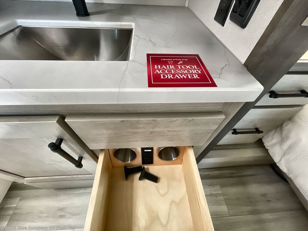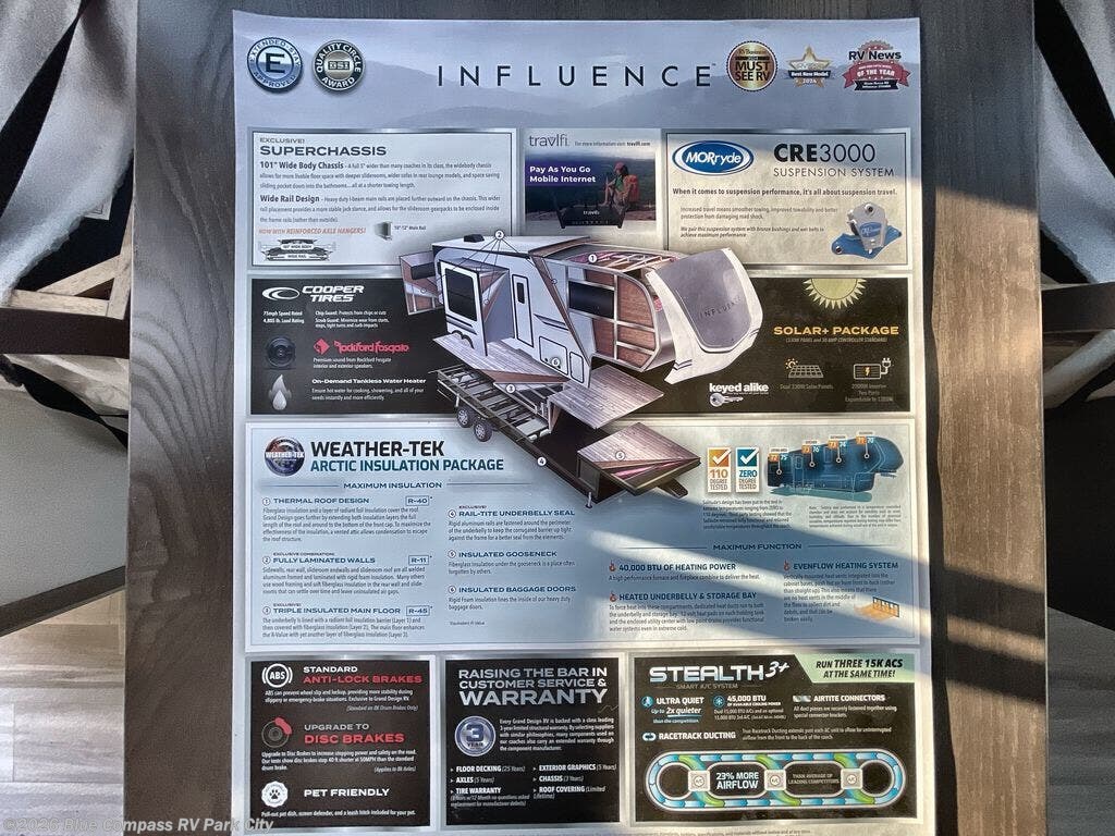 Any Grand Design Influence fifth wheel features five-sided aluminum cage construction with a walk-on roof and a fully enclosed underbelly with heated tanks and storage for all weather camping. For peace of mind, the MORryde CRE3000 Suspension system will provide safe and smooth towing, and the 101" widebody construction offers all the room you need and that is before multiple slides are fully engaged. You will appreciate the Keyed-Alike locks, slam-latch baggage doors with magnetic door catches, exterior security light, and SolidStep entry steps. On the inside, Congoleum flooring, premium roller shades for privacy, a hallway handrail for safety, and nightstands with USB ports to keep all of your electronics fully charged. You will also love the On Demand tankless water heater when showering, plus the added heat and ambiance from an electric fireplace, and so much more!