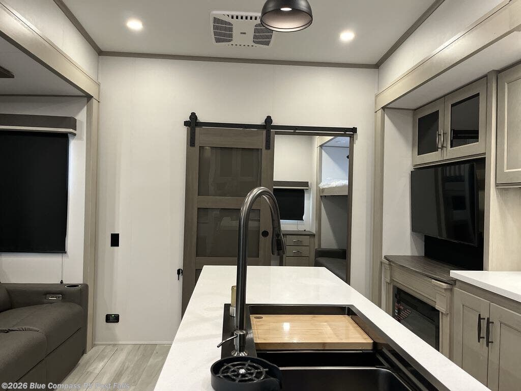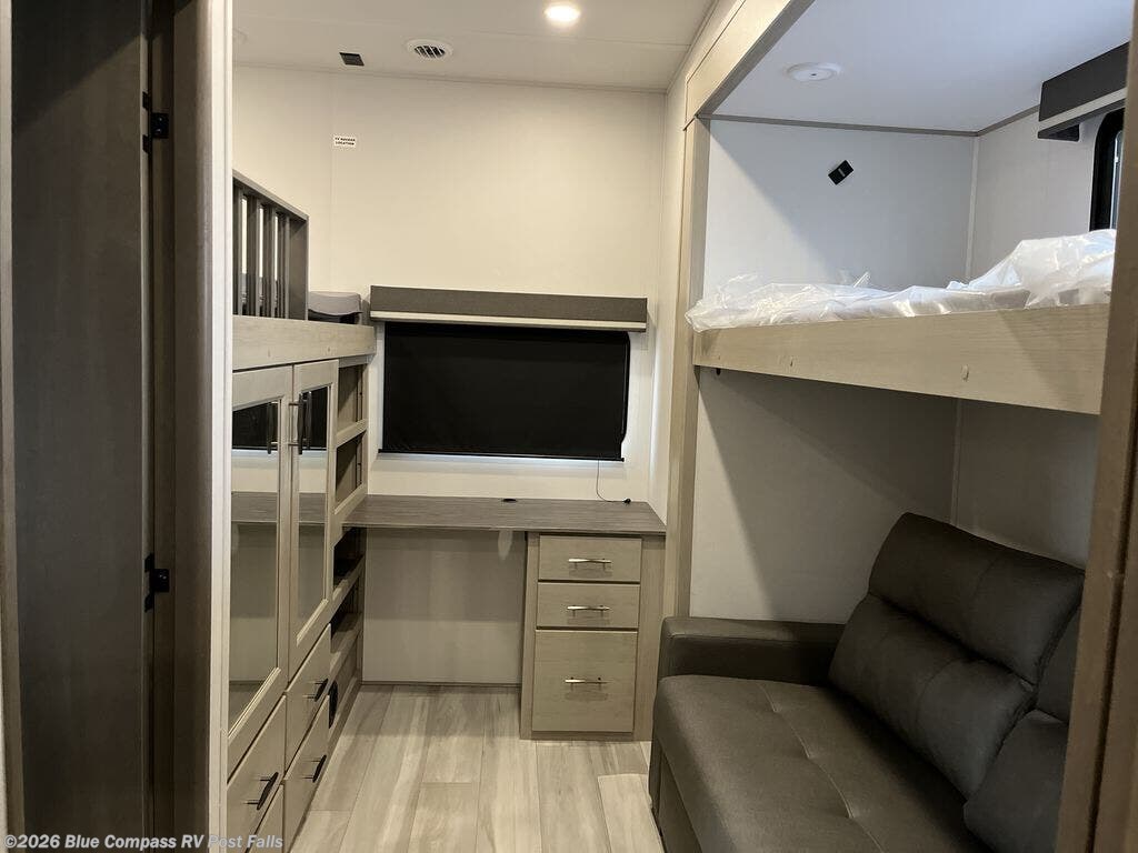 Grab the whole gang and head out in this fifth wheel featuring a private bunkhouse that sleeps five. This unit also features dual entry doors for added convenience with one set leading into a half bath, and quad slides for even more space in this widebody layout. The combined kitchen and living area featuring dual opposing slides offer space to dine and relax including theater seating for two opposite the entertainment center and fireplace. The chef in your group will appreciate the amenities for dreaming up dishes to feed everyone, and the outside griddle, sink and beverage cooler provides even more options. In front, a private bedroom and full bath with a queen bed or optional king, your choice. You can even add a washer and dryer with a space in front prepped for both if you like.