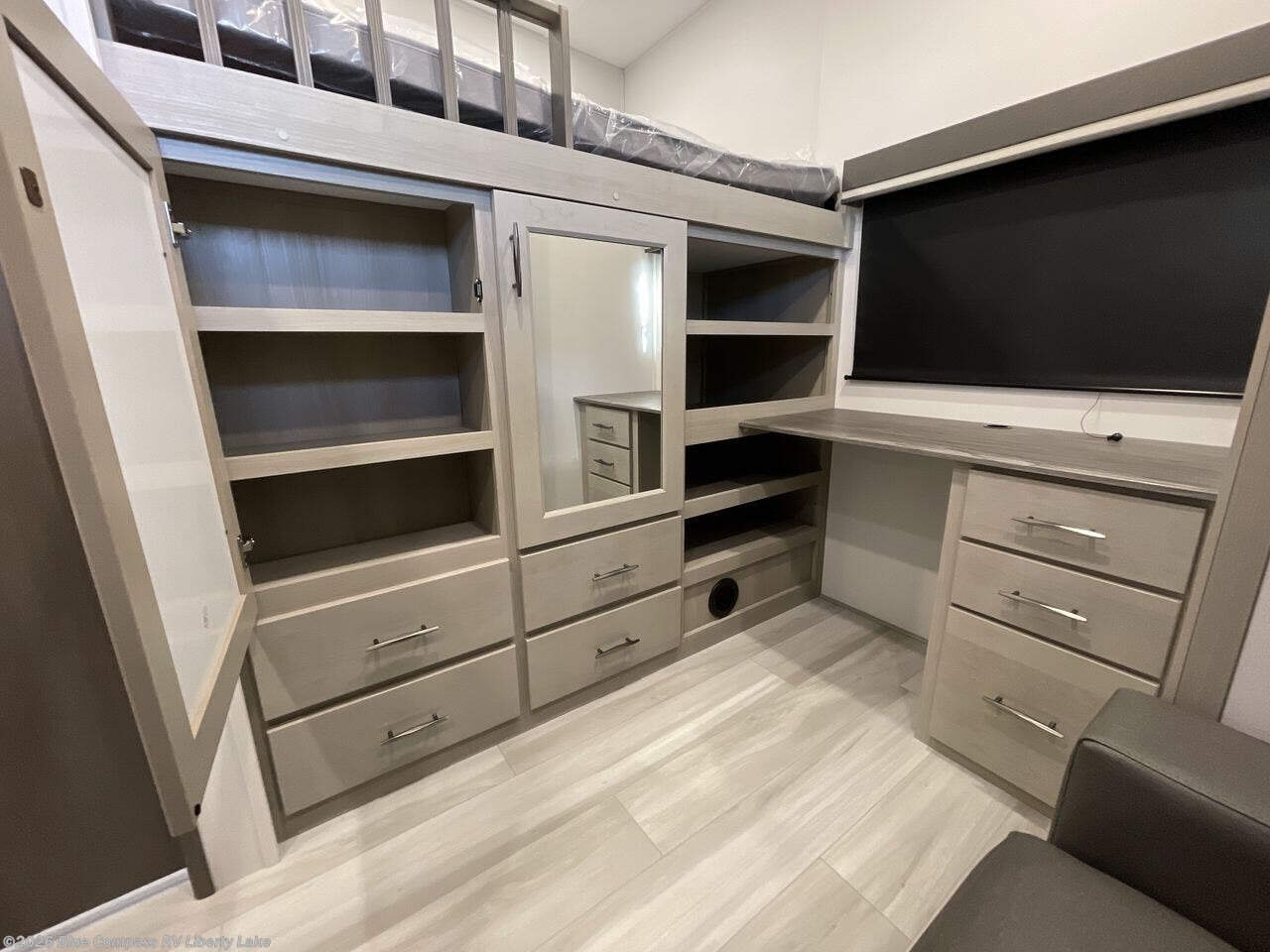 Grab the whole gang and head out in this fifth wheel featuring a private bunkhouse that sleeps five. This unit also features dual entry doors for added convenience with one set leading into a half bath, and quad slides for even more space in this widebody layout. The combined kitchen and living area featuring dual opposing slides offer space to dine and relax including theater seating for two opposite the entertainment center and fireplace. The chef in your group will appreciate the amenities for dreaming up dishes to feed everyone, and the outside griddle, sink and beverage cooler provides even more options. In front, a private bedroom and full bath with a queen bed or optional king, your choice. You can even add a washer and dryer with a space in front prepped for both if you like.