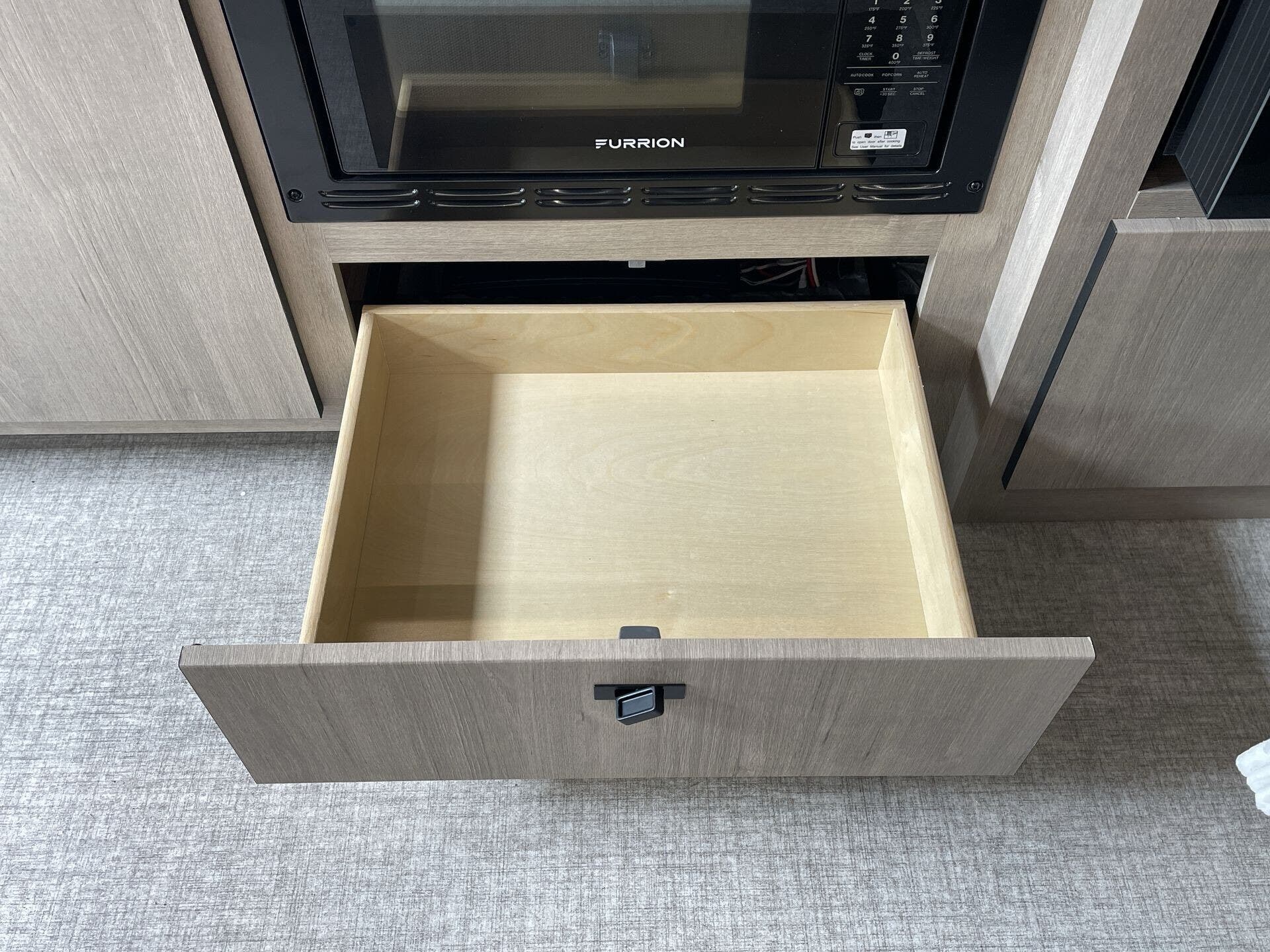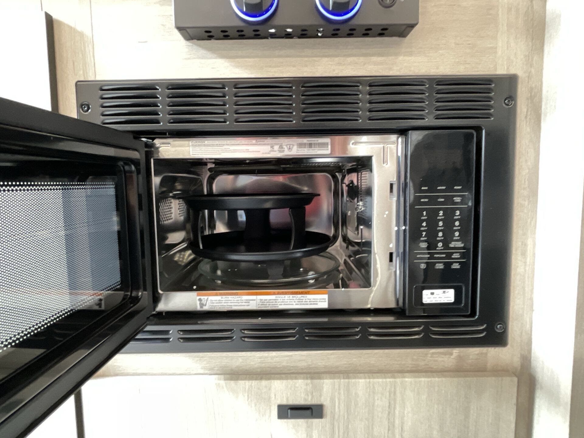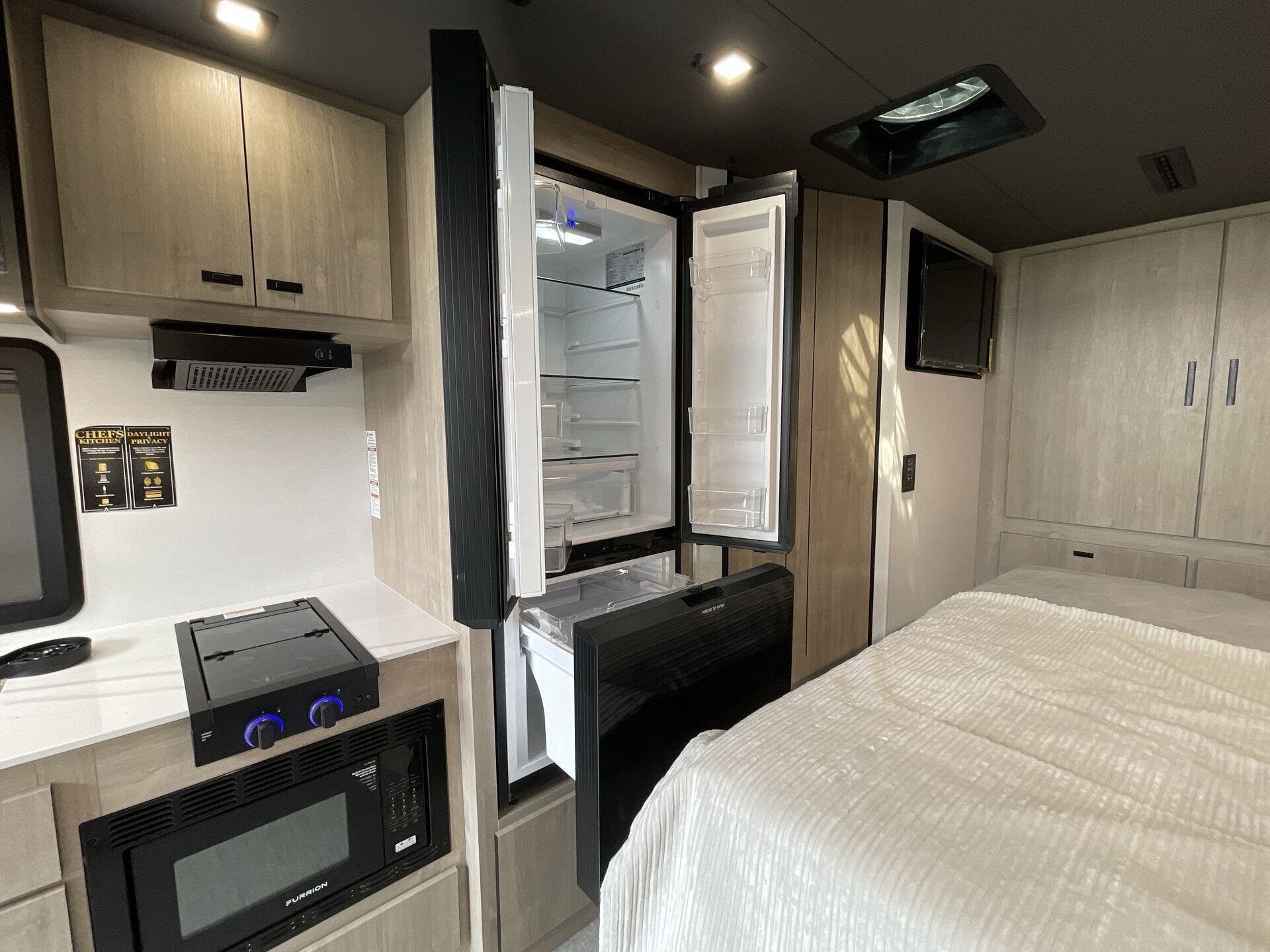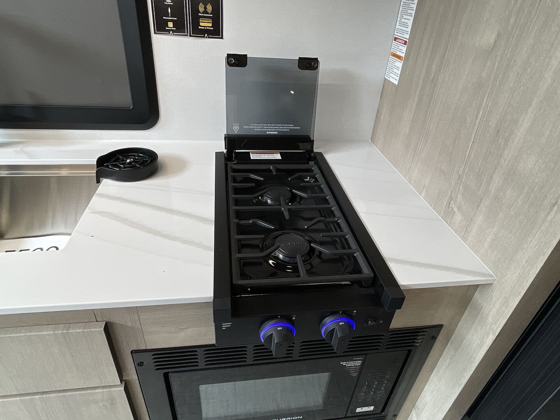 The Grand Design Lineage is loaded with an extensive list of features that enhance your travel experience. Prepare delicious meals on the go with its high-quality kitchen amenities, including a microwave, oven, stove top burner, and refrigerator. Stay comfortable with the 15,000 BTUs air conditioning and enjoy hot showers thanks to the water heater.