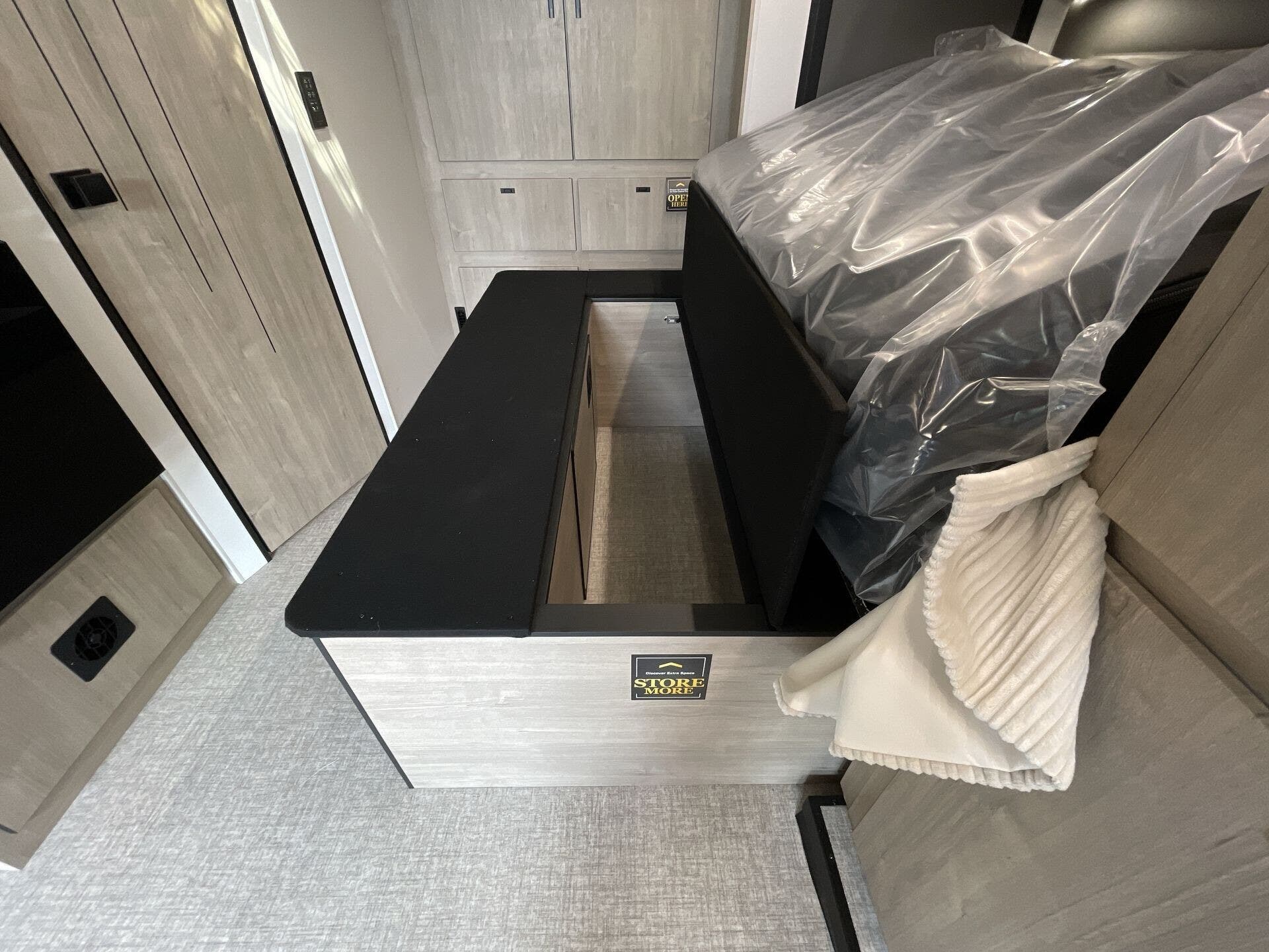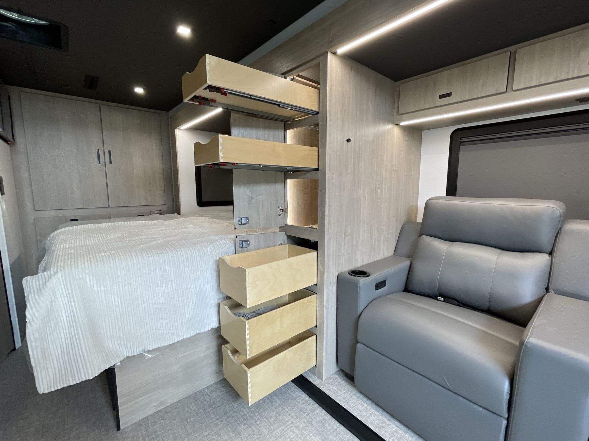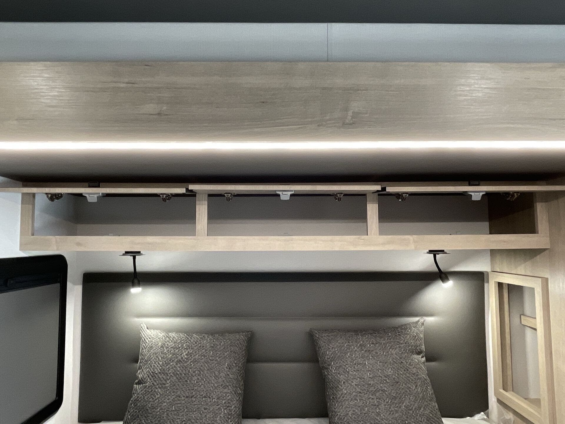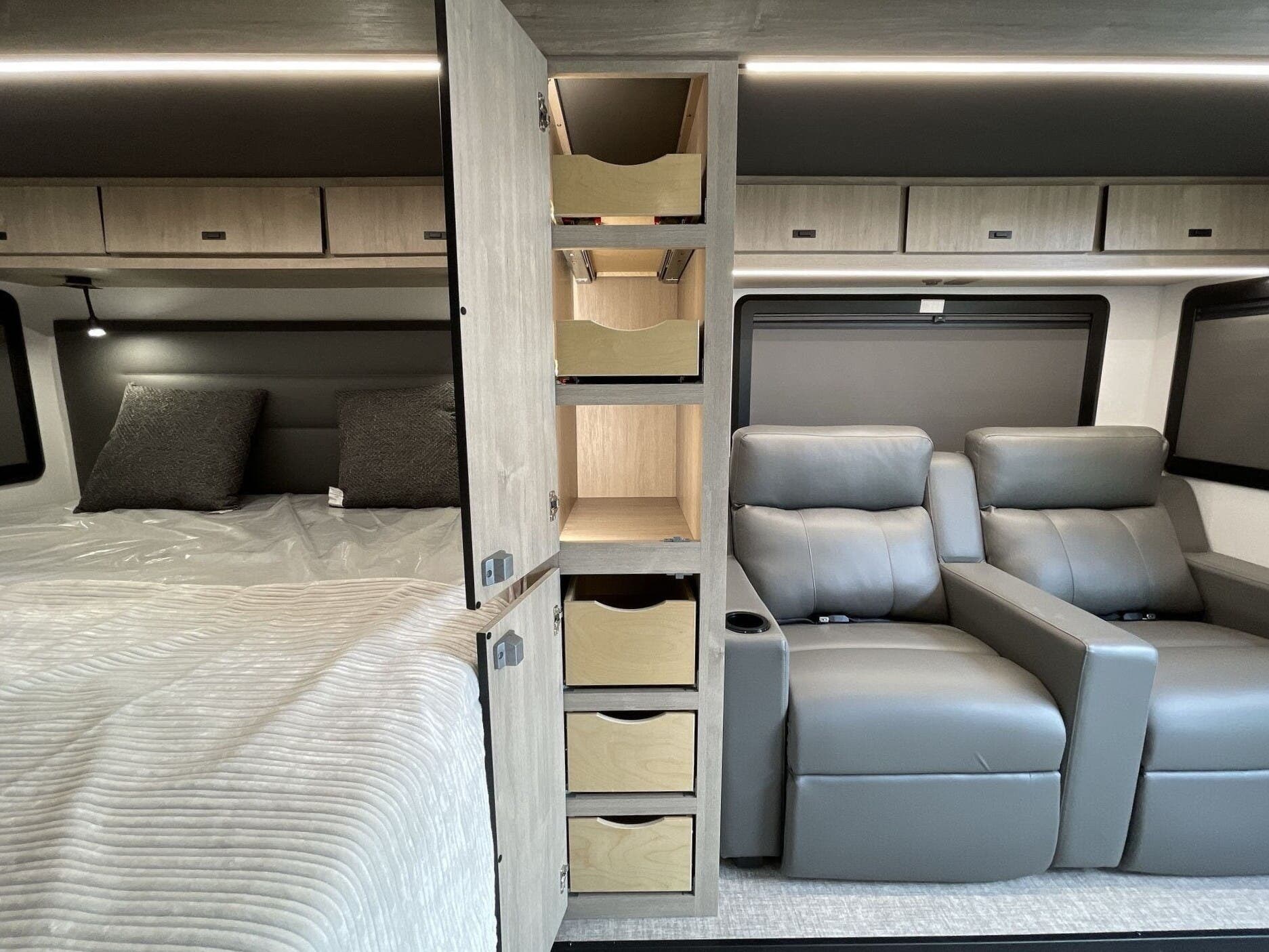 Relax in comfort with Rocker recliners and spacious bunk beds, alongside a king-size bed for a restful night’s sleep. The interior also features a handy medicine cabinet and ample storage throughout, ensuring everything you need is within reach.