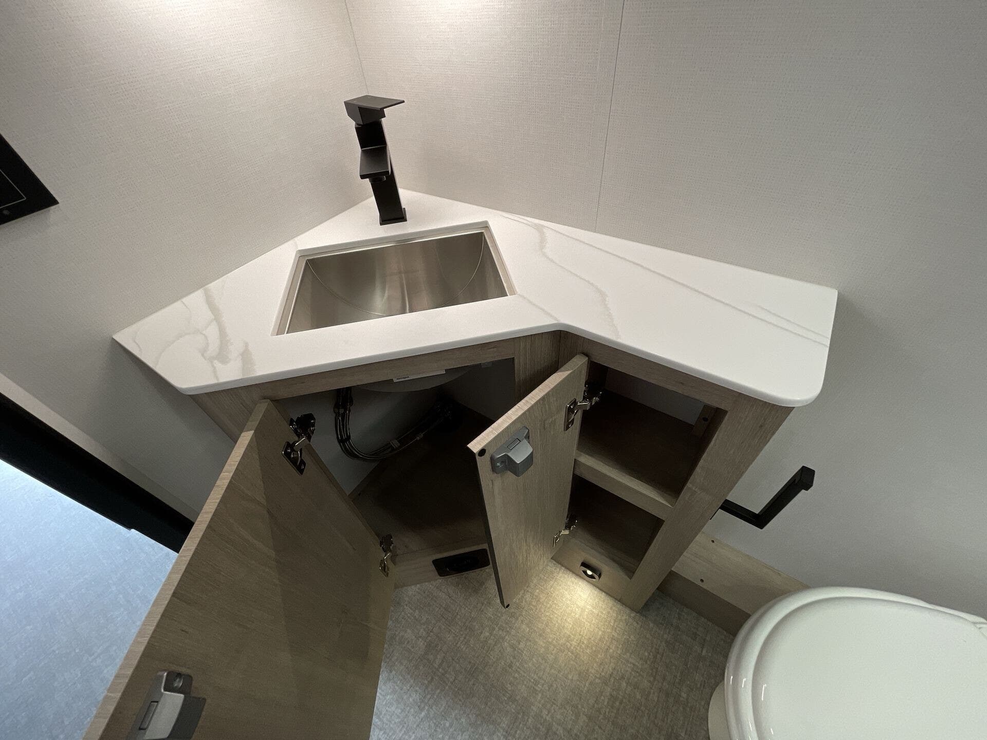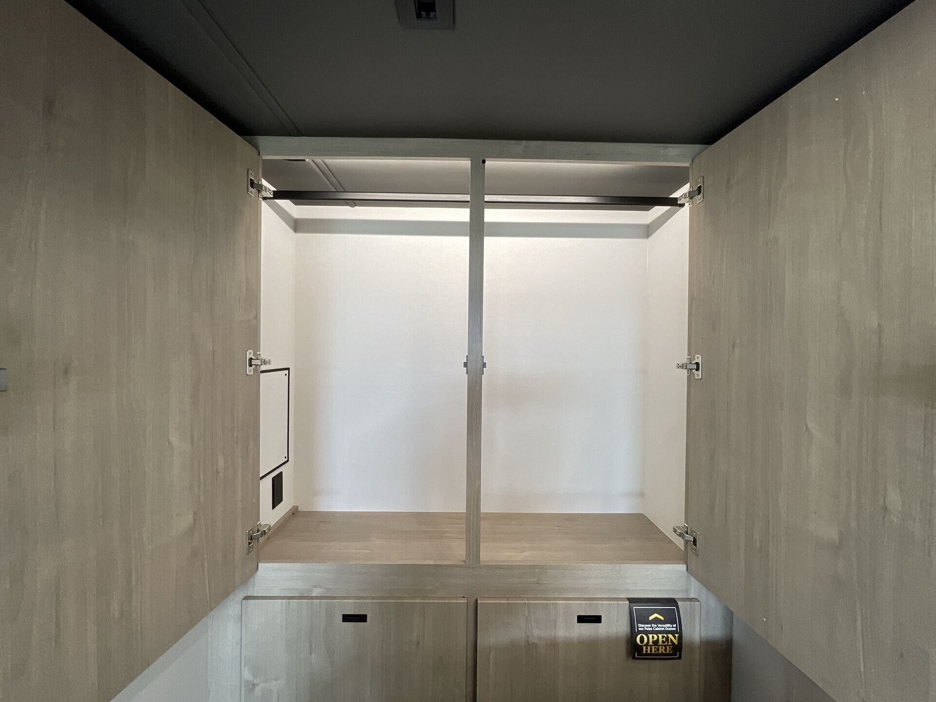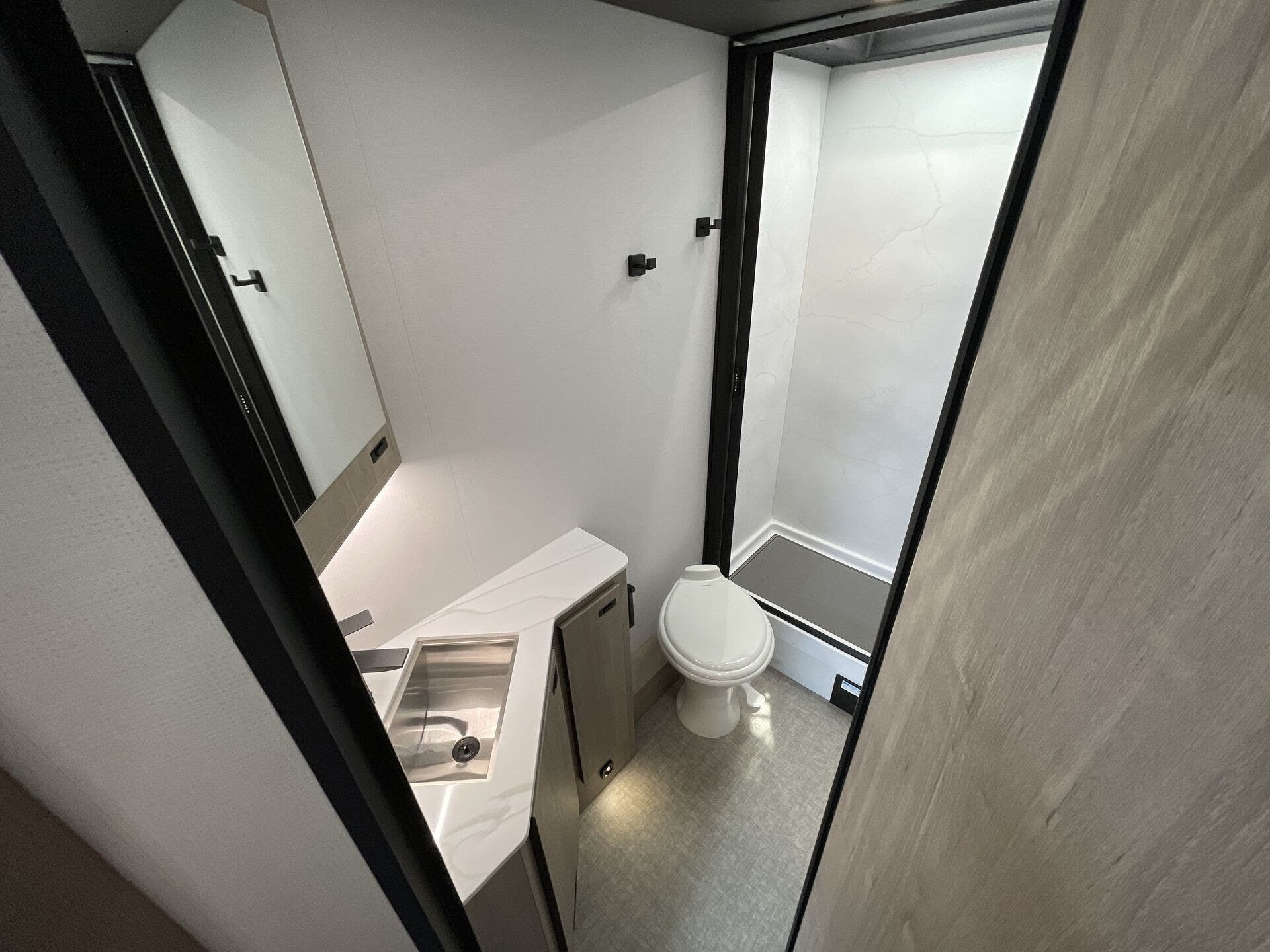 Relax in comfort with Rocker recliners and spacious bunk beds, alongside a king-size bed for a restful night’s sleep. The interior also features a handy medicine cabinet and ample storage throughout, ensuring everything you need is within reach.