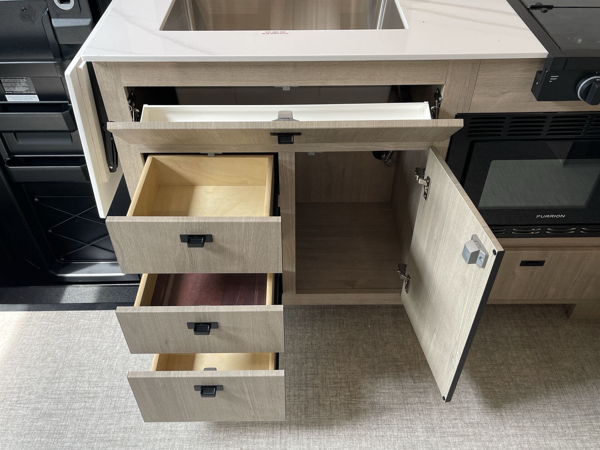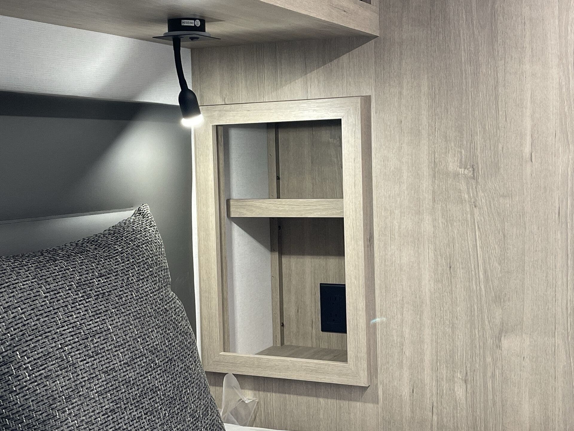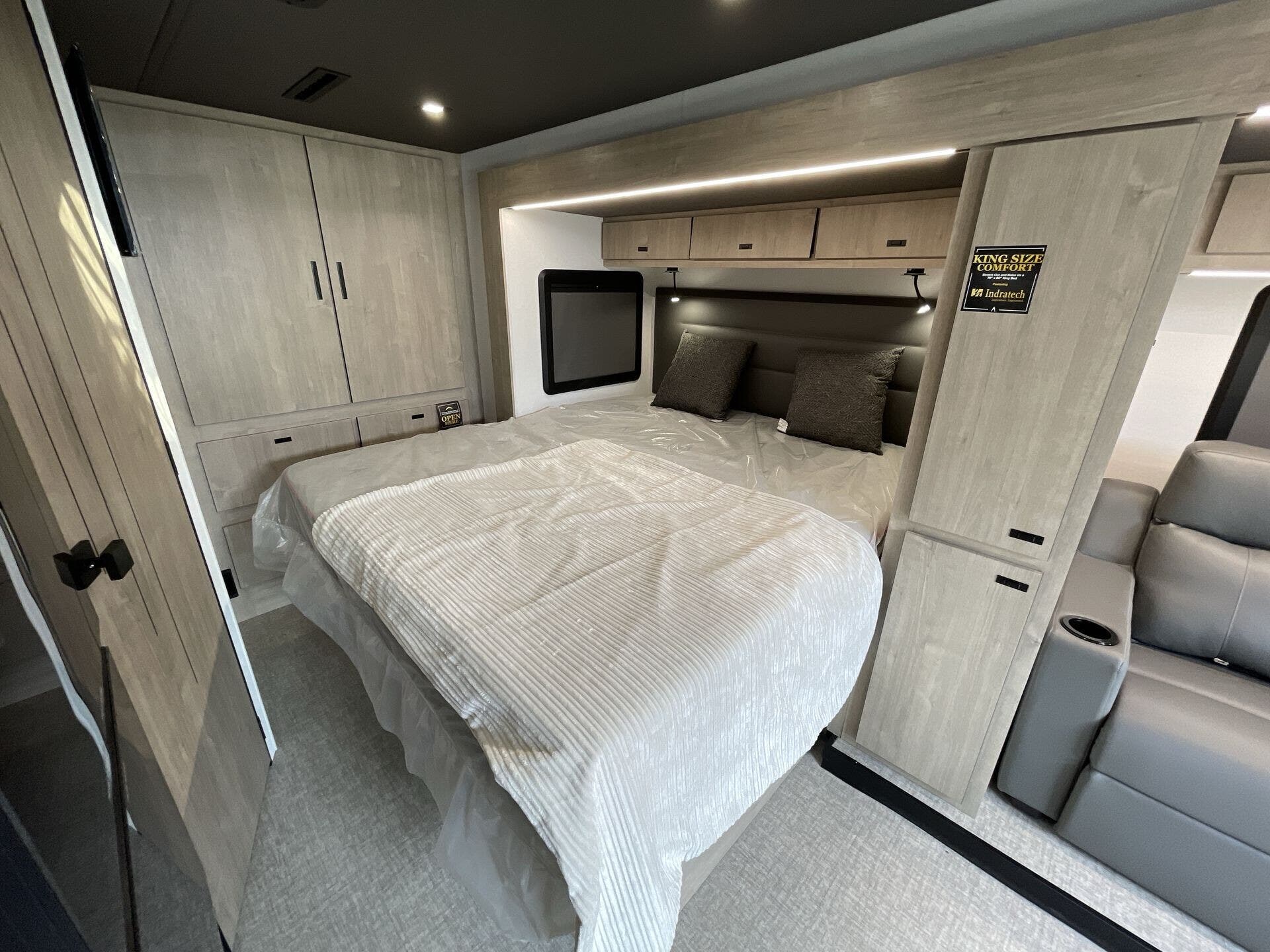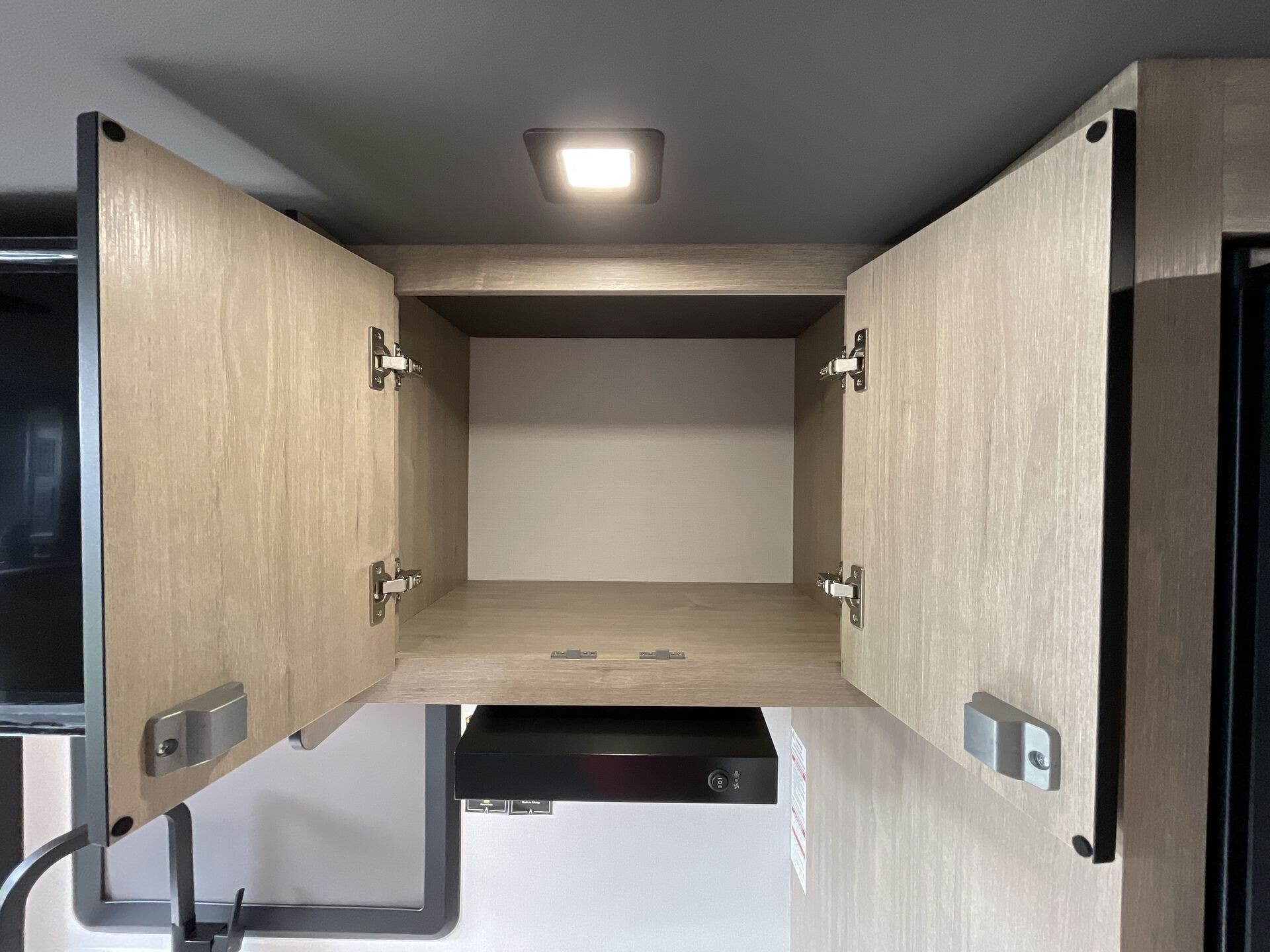 Relax in comfort with Rocker recliners and spacious bunk beds, alongside a king-size bed for a restful night’s sleep. The interior also features a handy medicine cabinet and ample storage throughout, ensuring everything you need is within reach.
