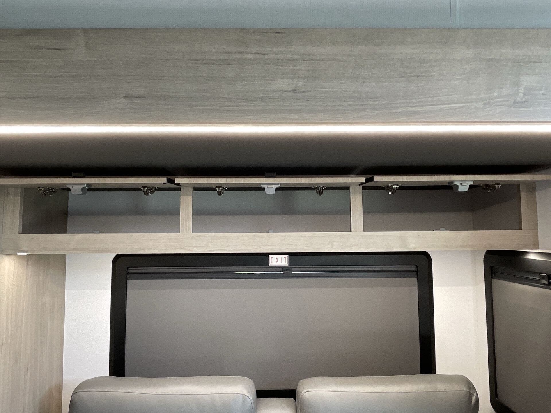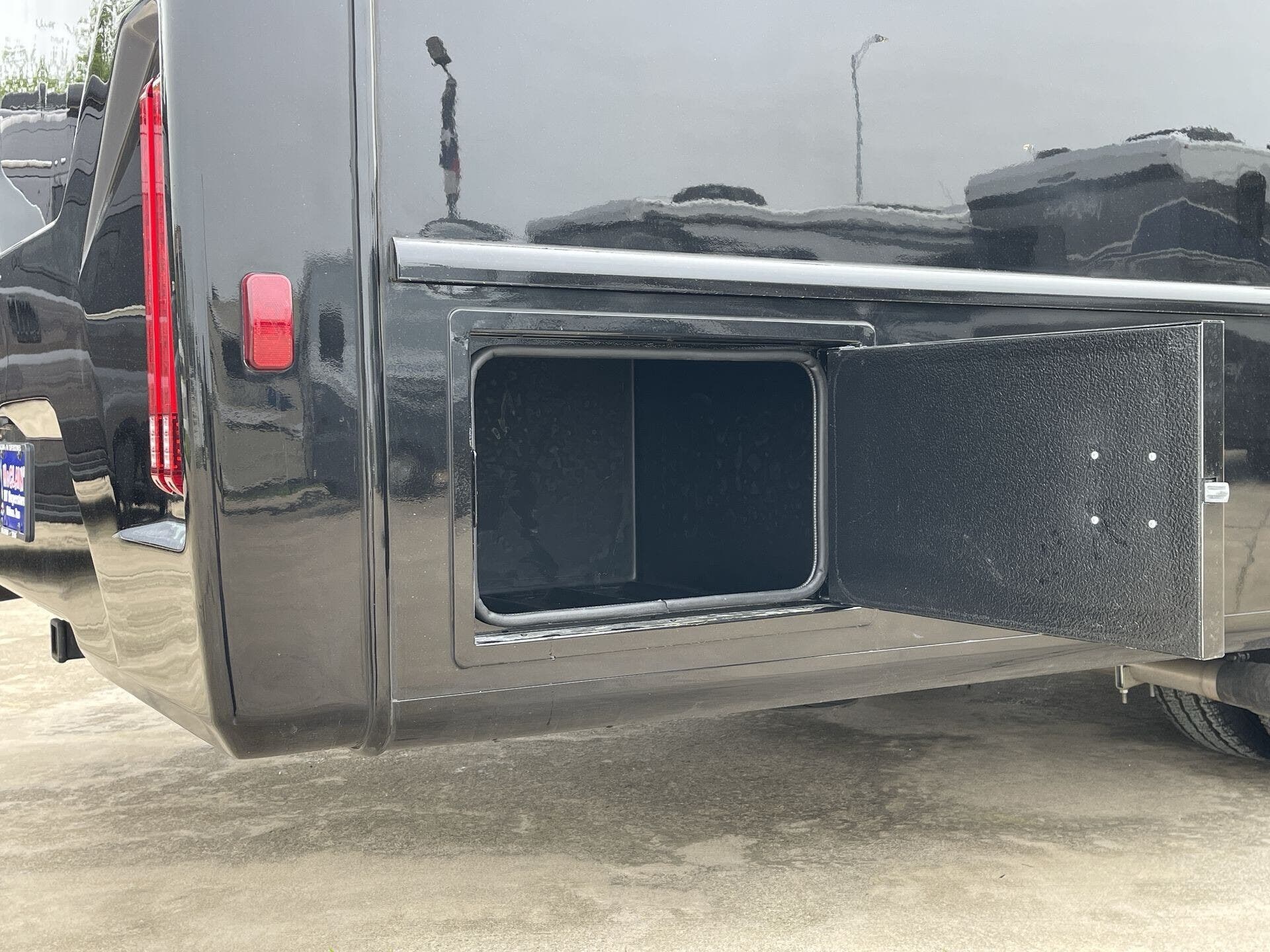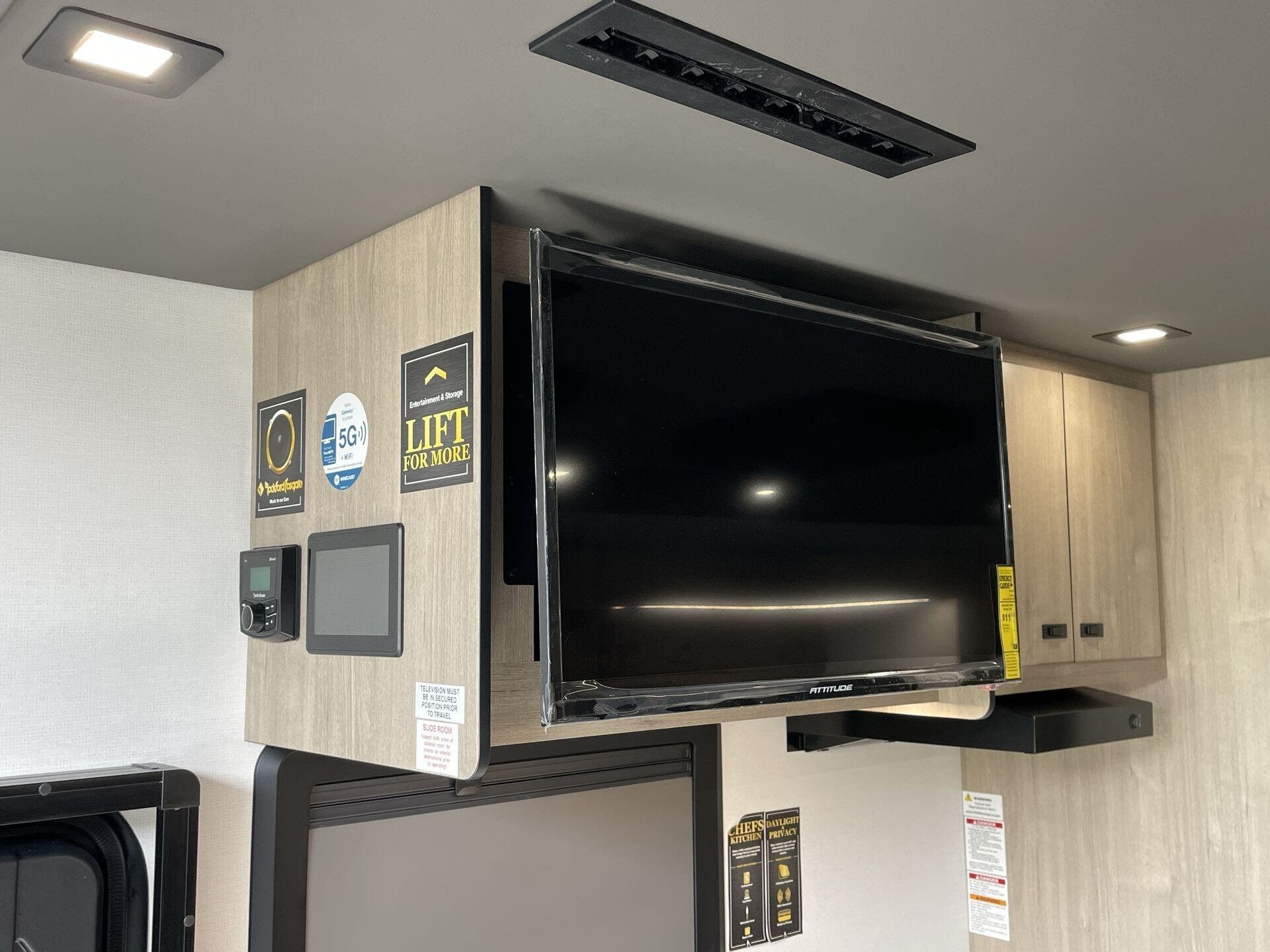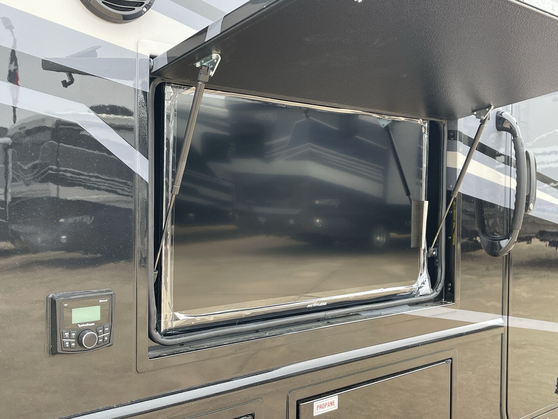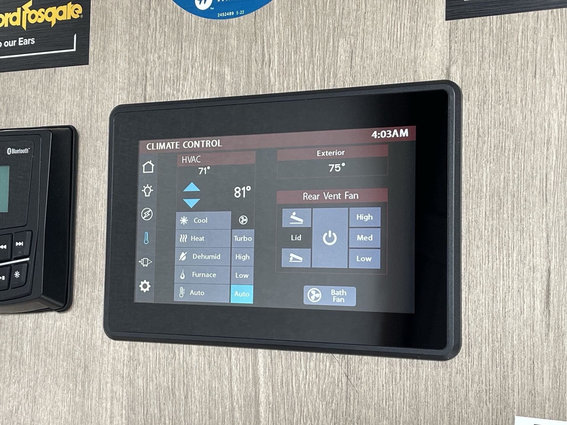The RV is equipped with modern amenities such as satellite radio, GPS navigation, and a power roof vent. Safety is paramount, featuring CO, LP, and smoke detectors to keep you protected during your adventures. A backup monitor will help you in tight parking situations, making your travels hassle-free.