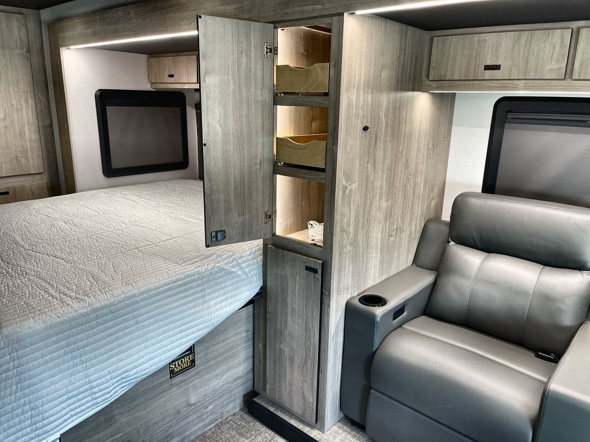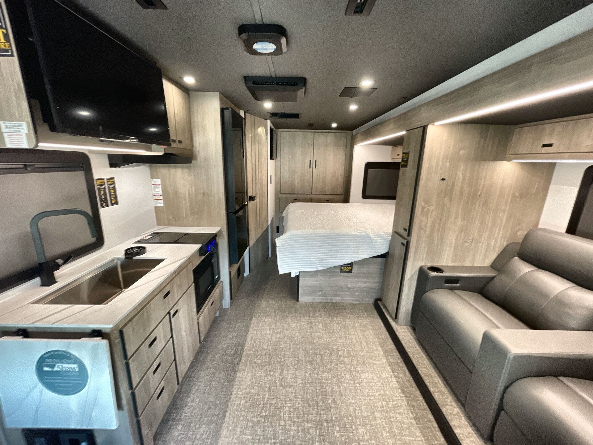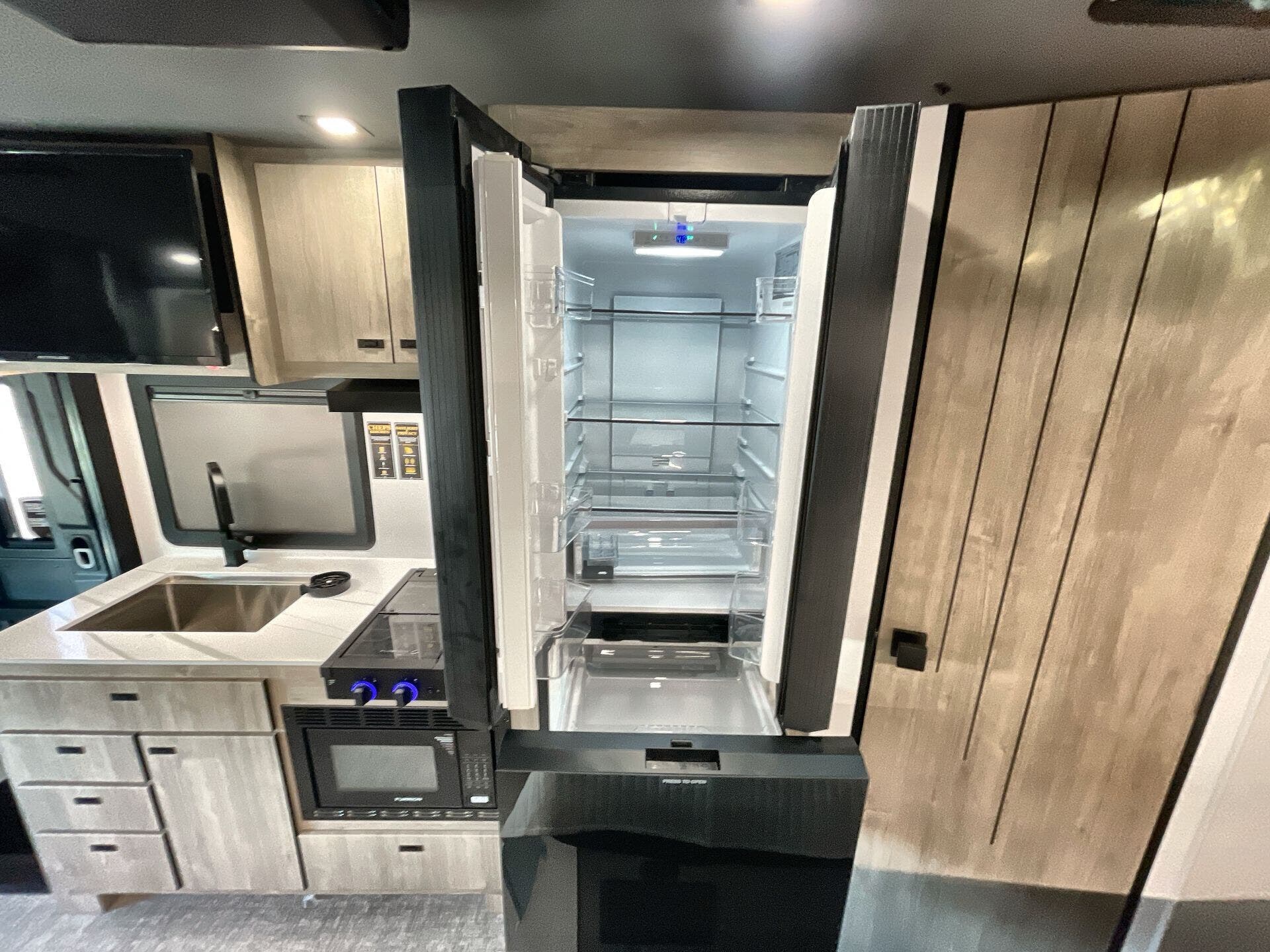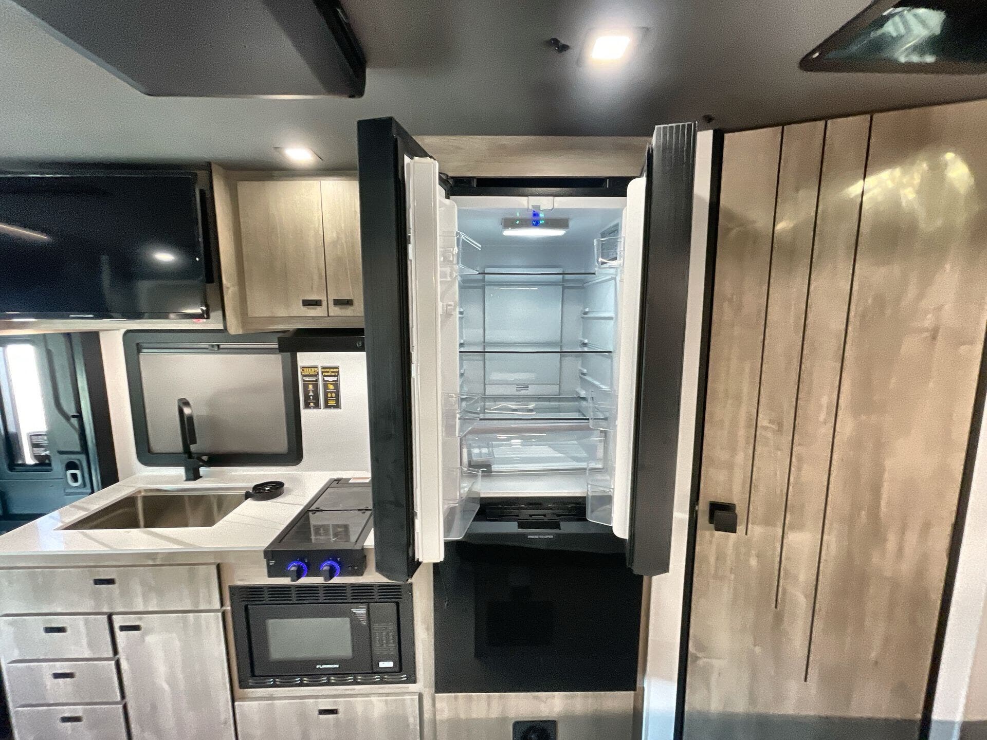 Inside, enjoy a bright, open-concept interior with residential-style furnishings, expansive panoramic windows, and thoughtful touches throughout. The well-appointed kitchen features solid-surface countertops, a deep stainless steel sink, and a premium appliance suite for ambitious cooks on the road. The living area provides reclining theater seats and an entertainment center with a smart TV and a cozy fireplace, creating a welcoming home-away-from-home ambiance. In the bedroom, a private queen bed with under-bed storage and dual wardrobes offers restful nights, while the bathroom showcases a walk-in shower and a linen closet for convenient daily routines.