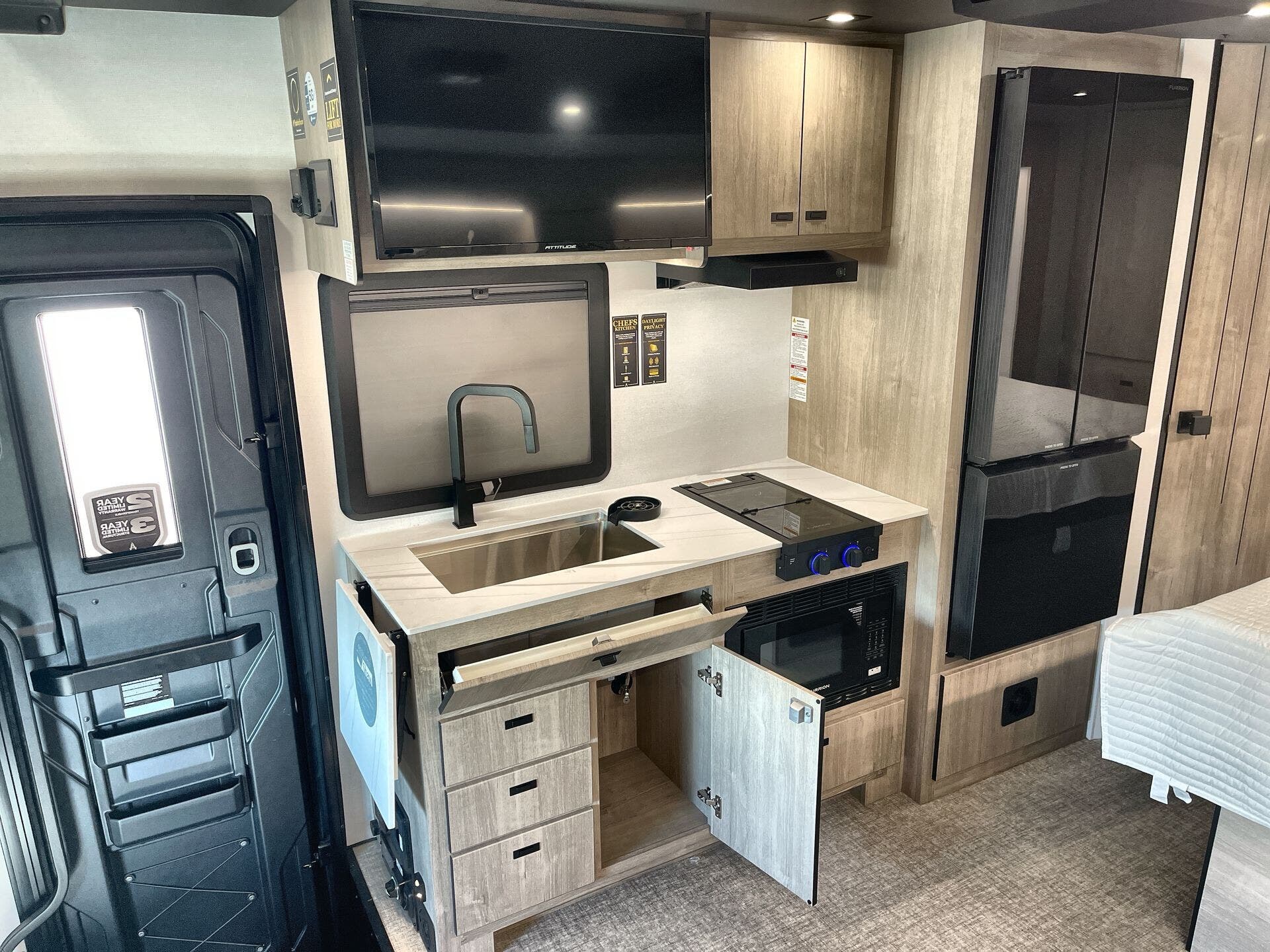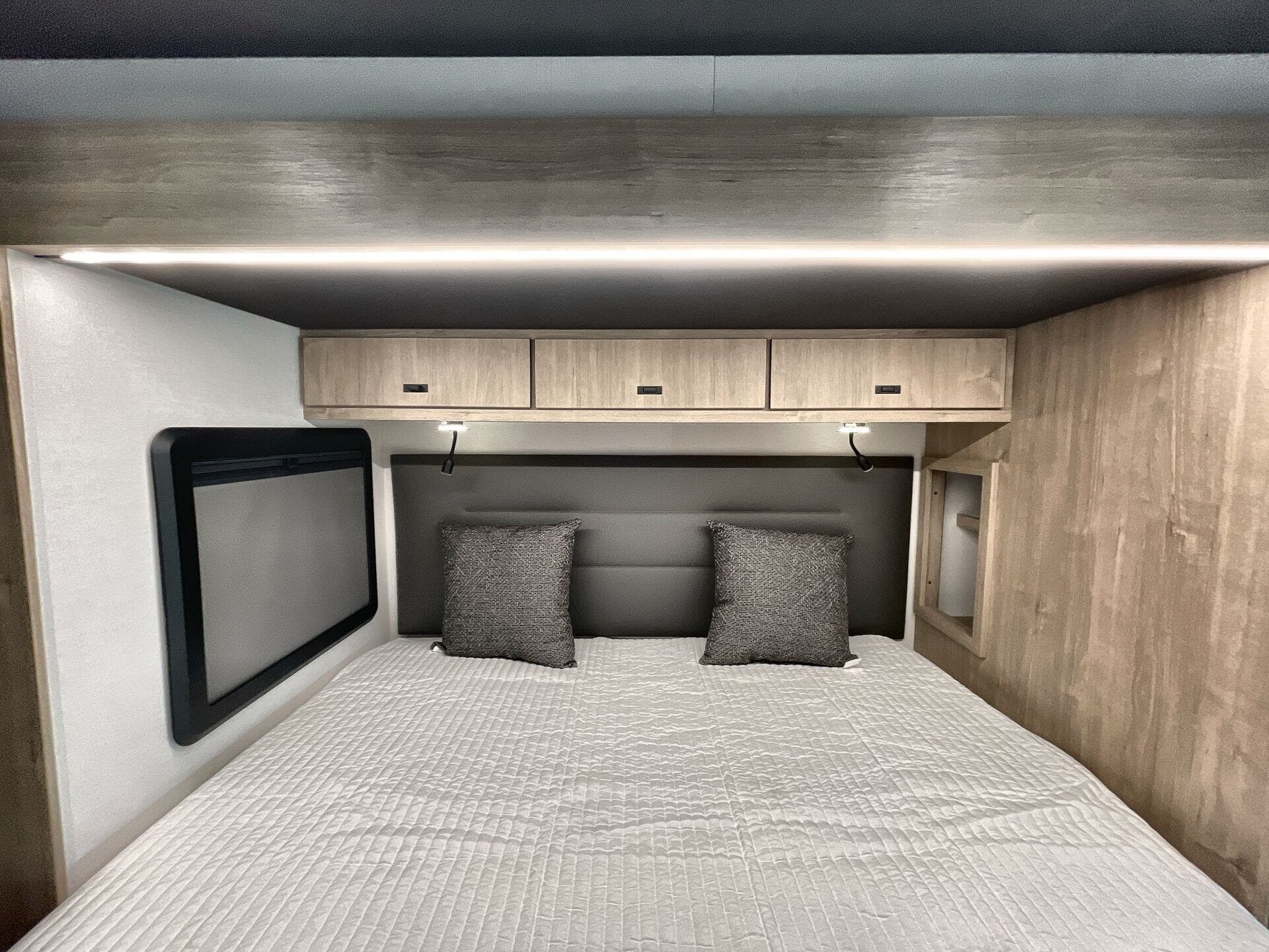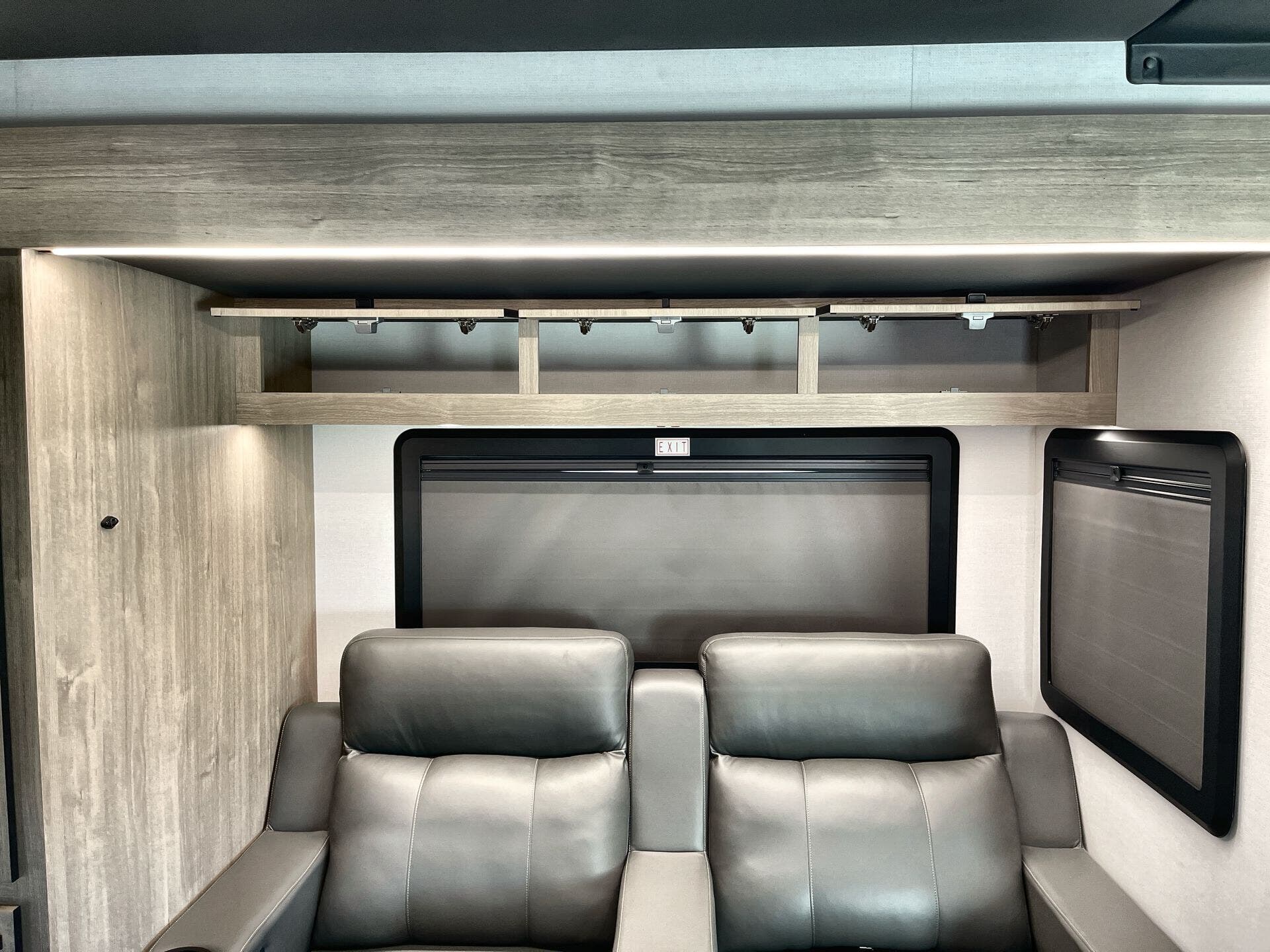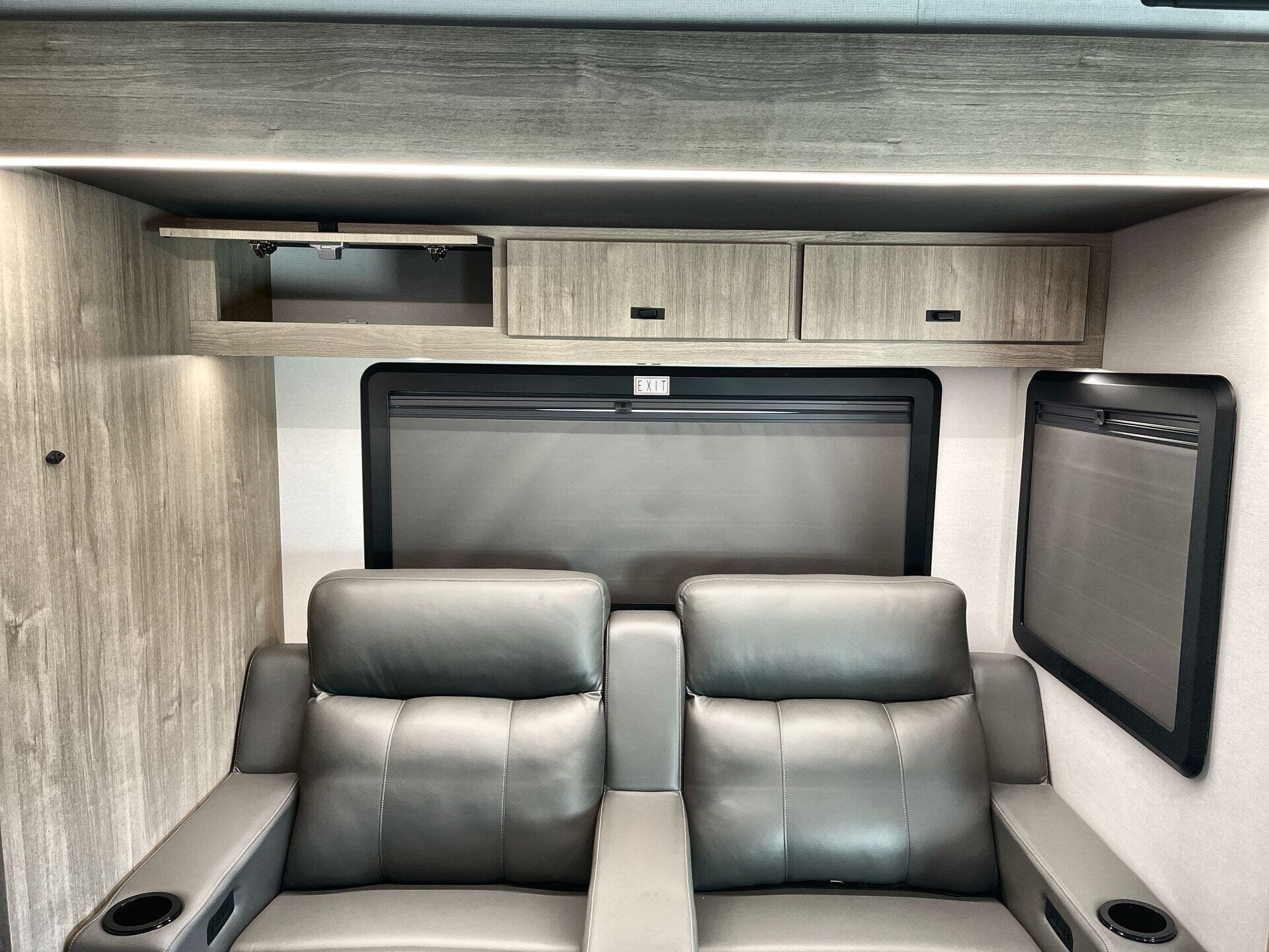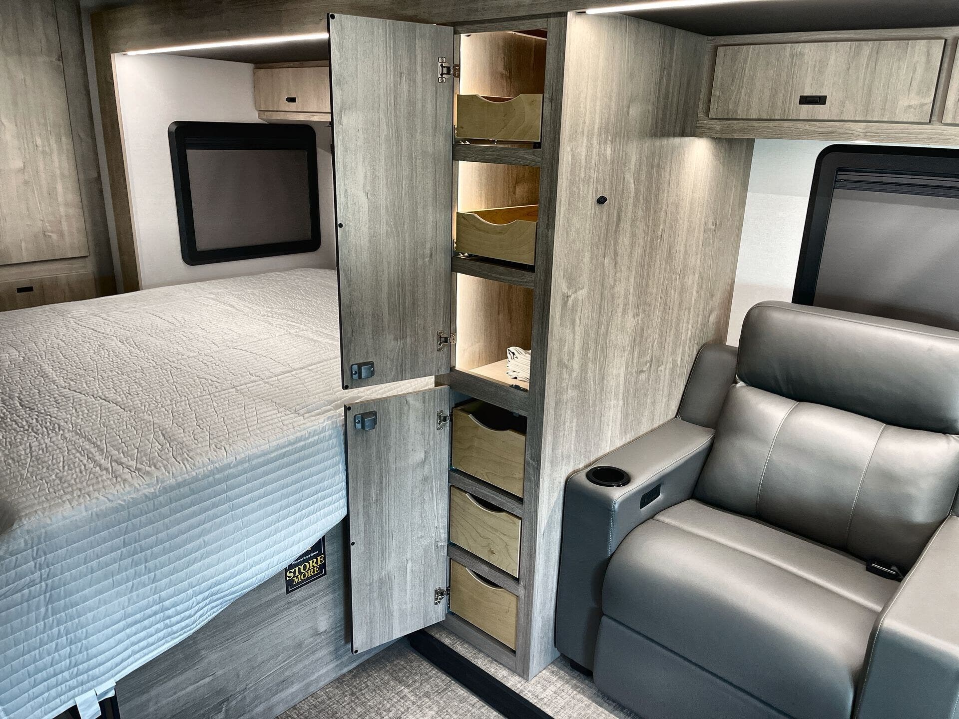 Inside, enjoy a bright, open-concept interior with residential-style furnishings, expansive panoramic windows, and thoughtful touches throughout. The well-appointed kitchen features solid-surface countertops, a deep stainless steel sink, and a premium appliance suite for ambitious cooks on the road. The living area provides reclining theater seats and an entertainment center with a smart TV and a cozy fireplace, creating a welcoming home-away-from-home ambiance. In the bedroom, a private queen bed with under-bed storage and dual wardrobes offers restful nights, while the bathroom showcases a walk-in shower and a linen closet for convenient daily routines.