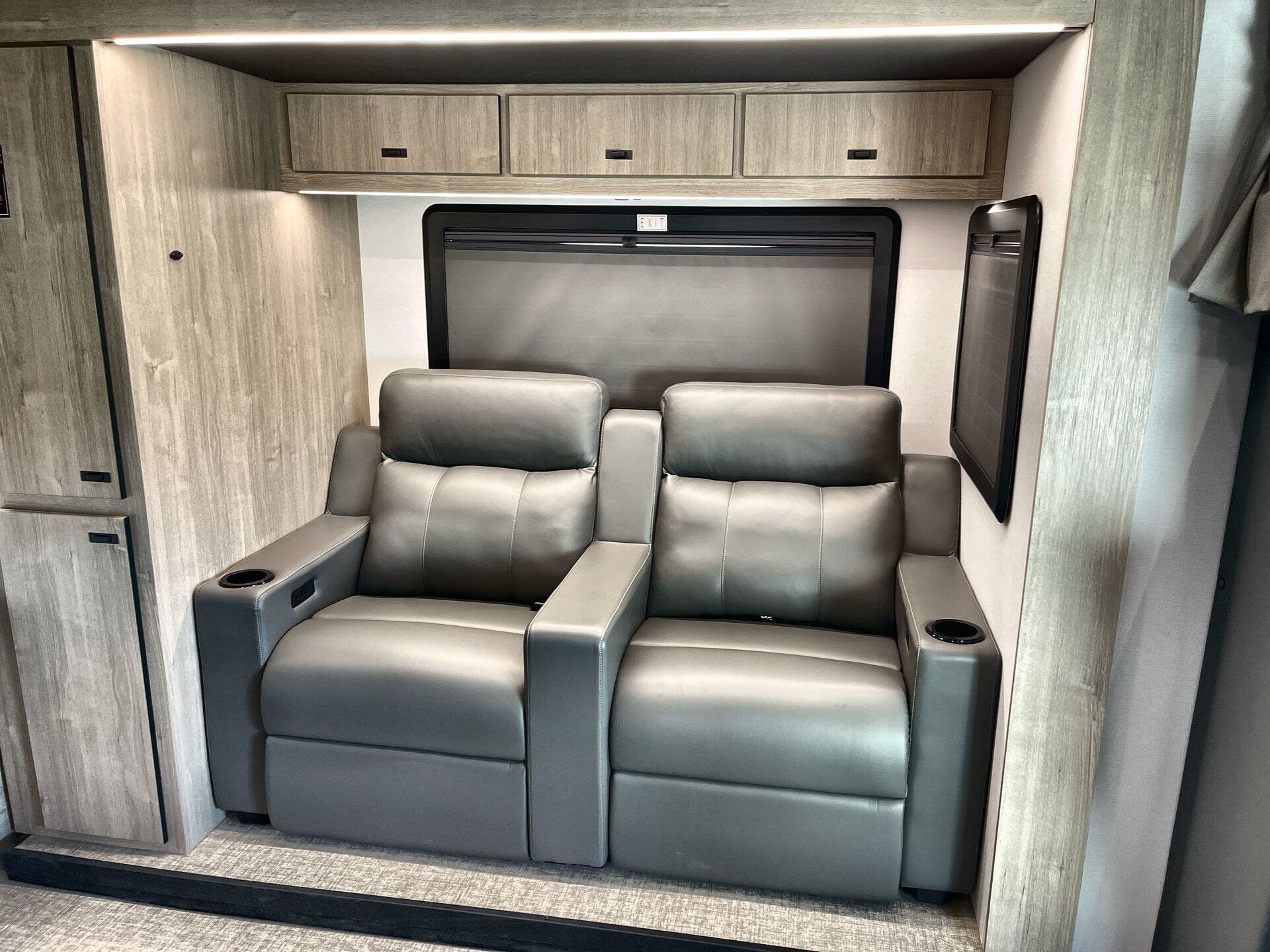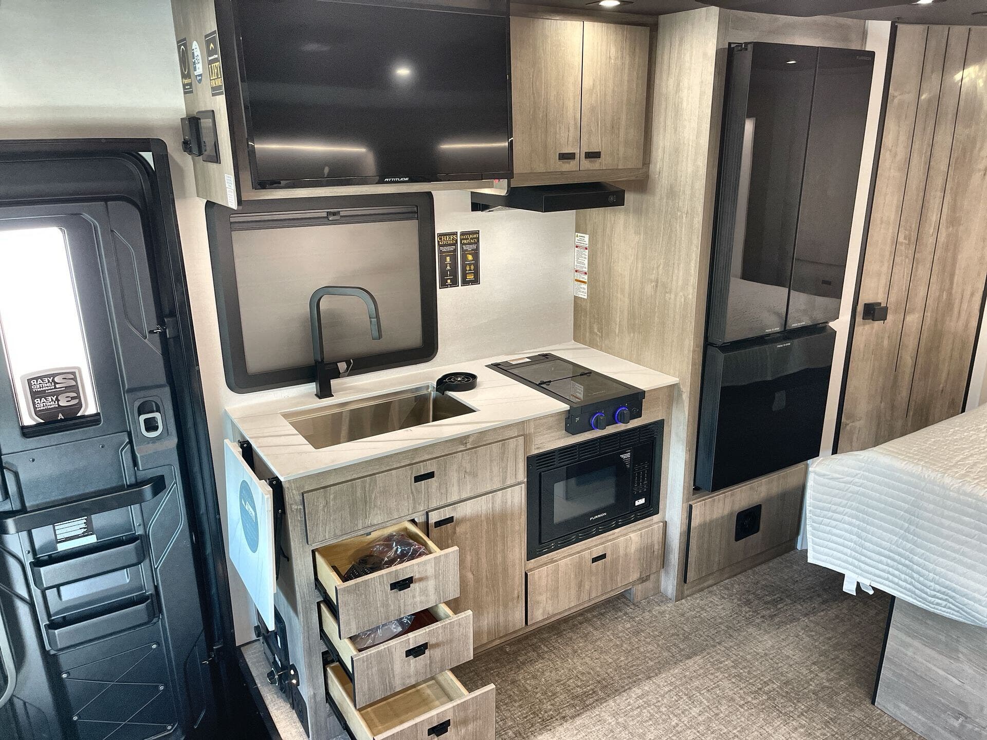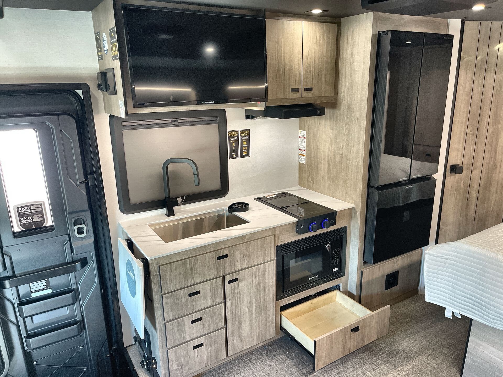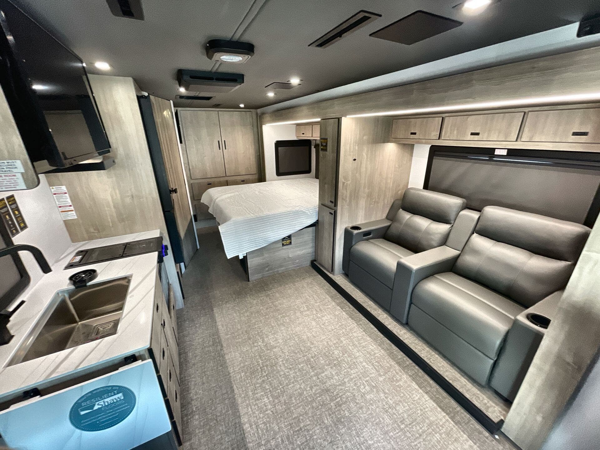 Inside, enjoy a bright, open-concept interior with residential-style furnishings, expansive panoramic windows, and thoughtful touches throughout. The well-appointed kitchen features solid-surface countertops, a deep stainless steel sink, and a premium appliance suite for ambitious cooks on the road. The living area provides reclining theater seats and an entertainment center with a smart TV and a cozy fireplace, creating a welcoming home-away-from-home ambiance. In the bedroom, a private queen bed with under-bed storage and dual wardrobes offers restful nights, while the bathroom showcases a walk-in shower and a linen closet for convenient daily routines.