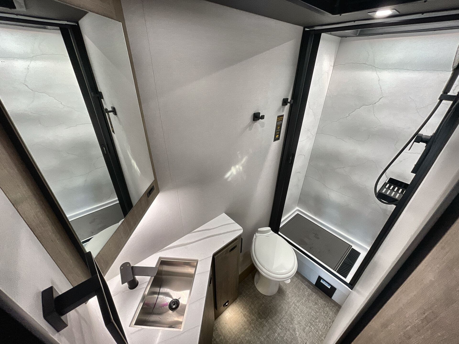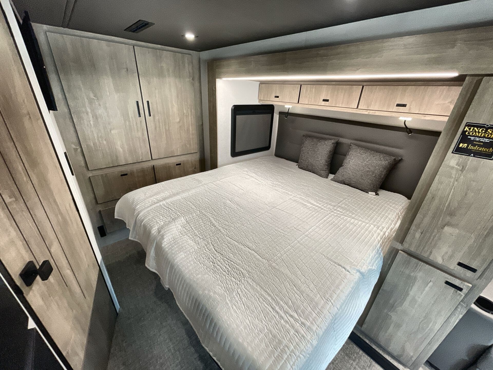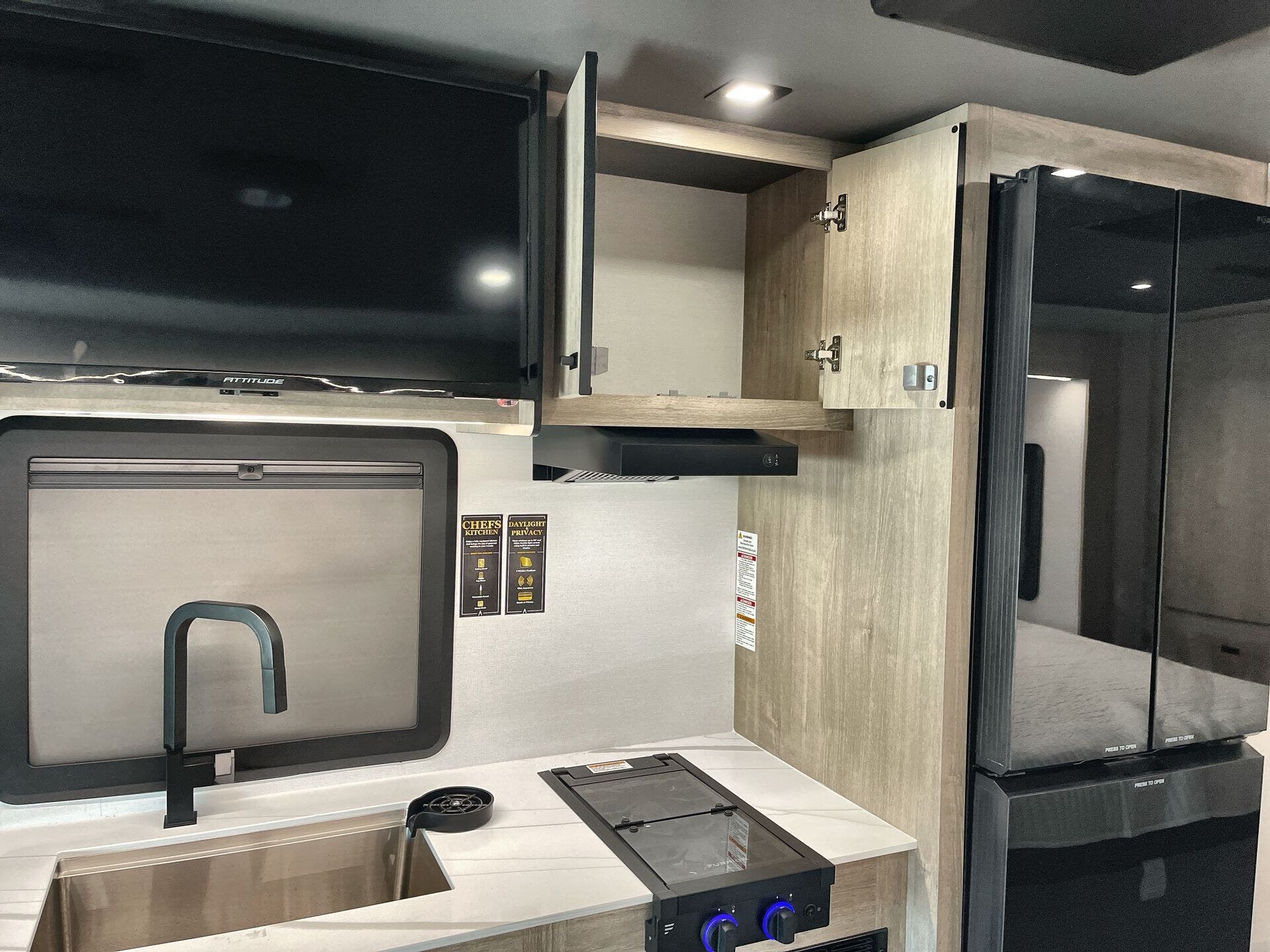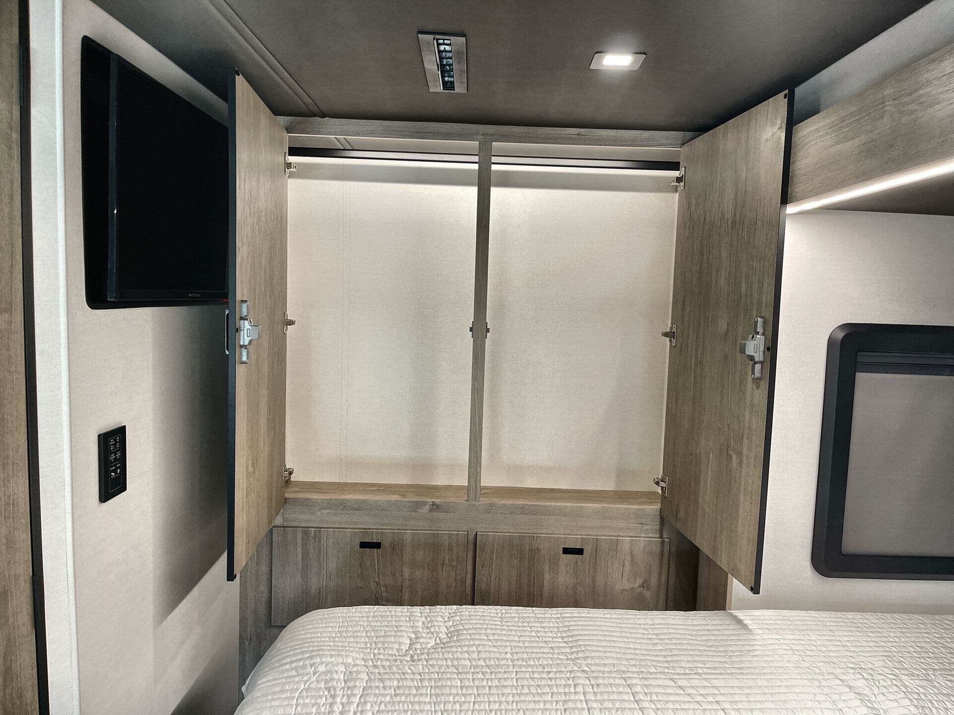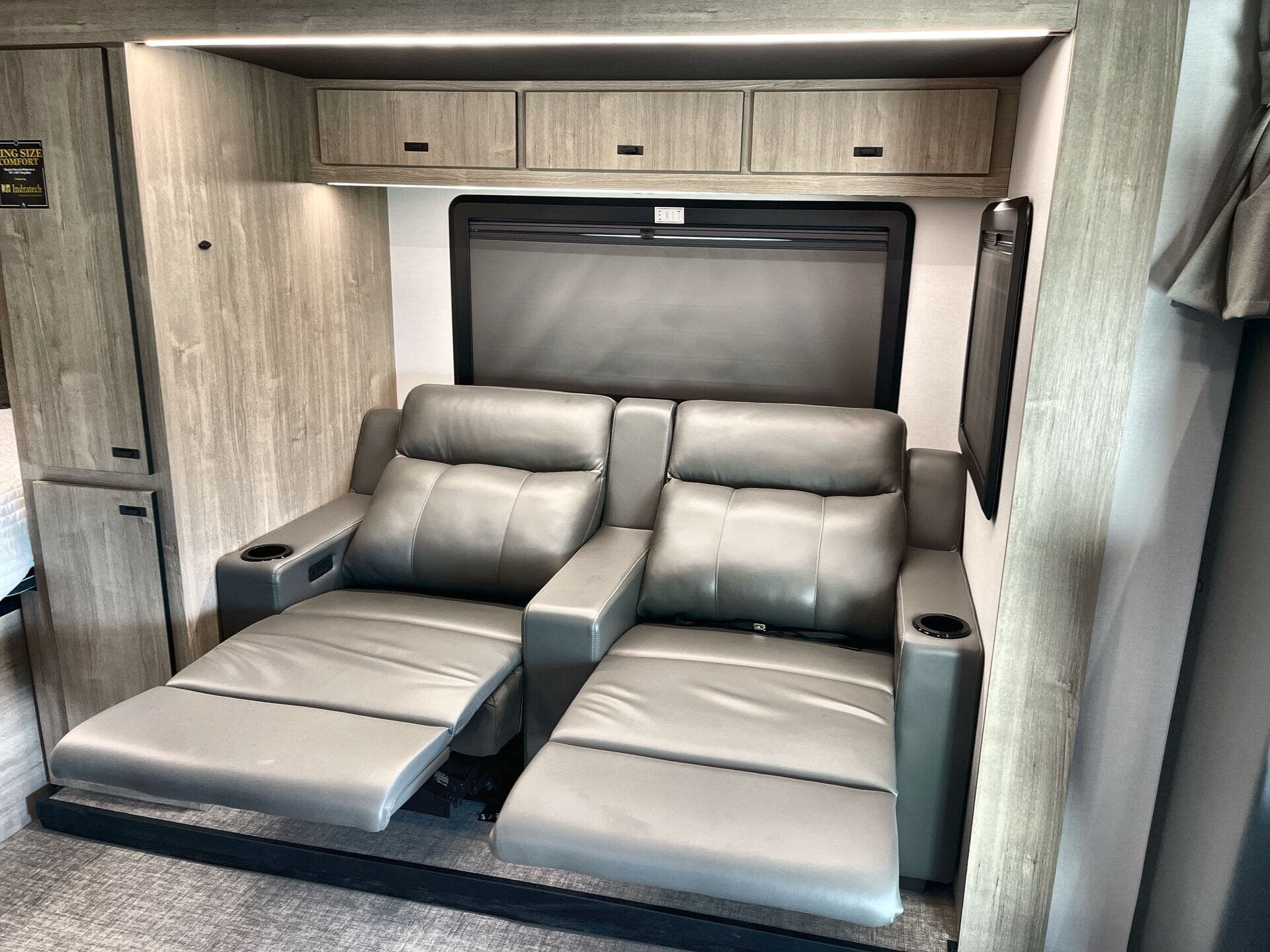 Inside, enjoy a bright, open-concept interior with residential-style furnishings, expansive panoramic windows, and thoughtful touches throughout. The well-appointed kitchen features solid-surface countertops, a deep stainless steel sink, and a premium appliance suite for ambitious cooks on the road. The living area provides reclining theater seats and an entertainment center with a smart TV and a cozy fireplace, creating a welcoming home-away-from-home ambiance. In the bedroom, a private queen bed with under-bed storage and dual wardrobes offers restful nights, while the bathroom showcases a walk-in shower and a linen closet for convenient daily routines.