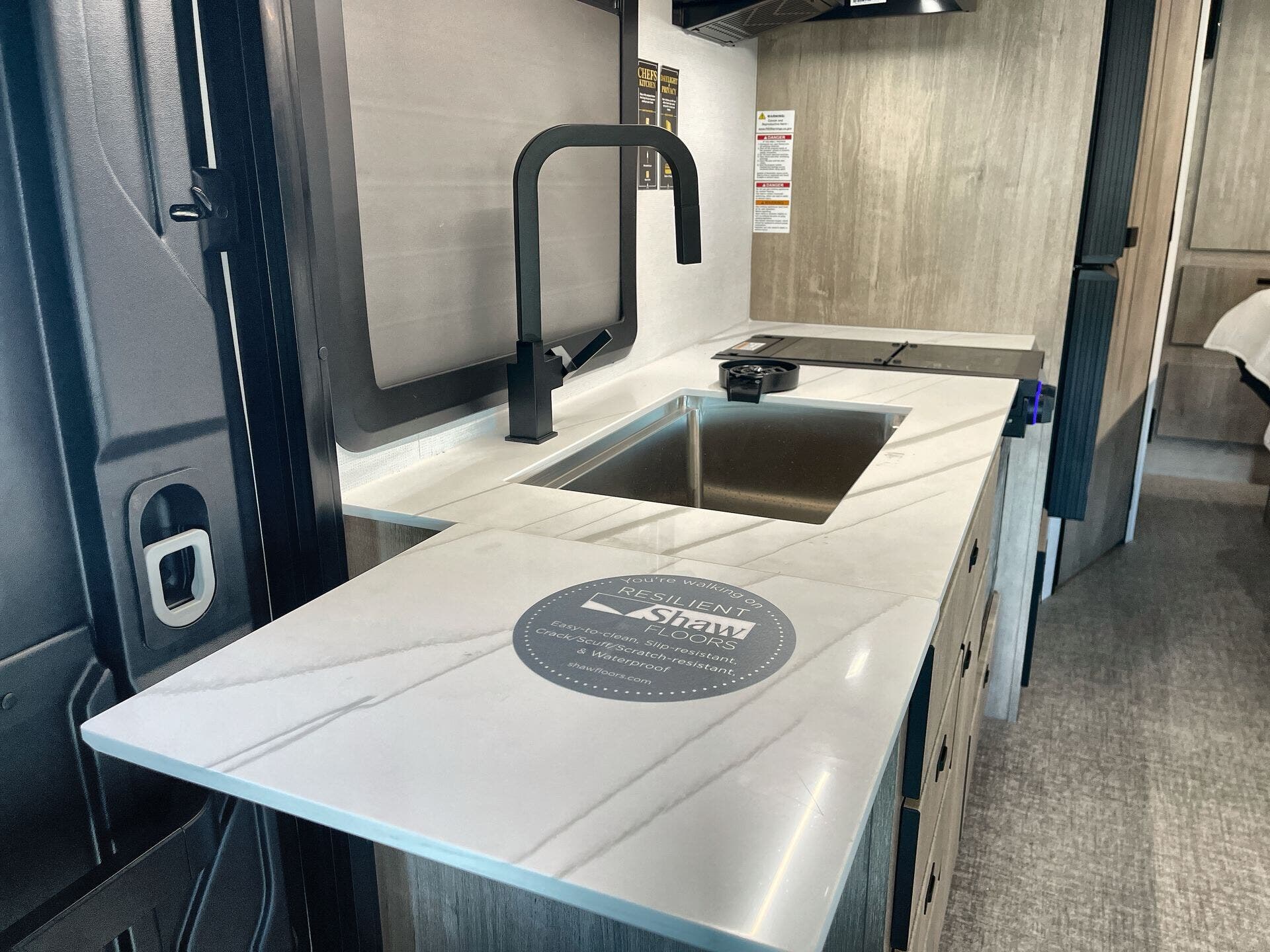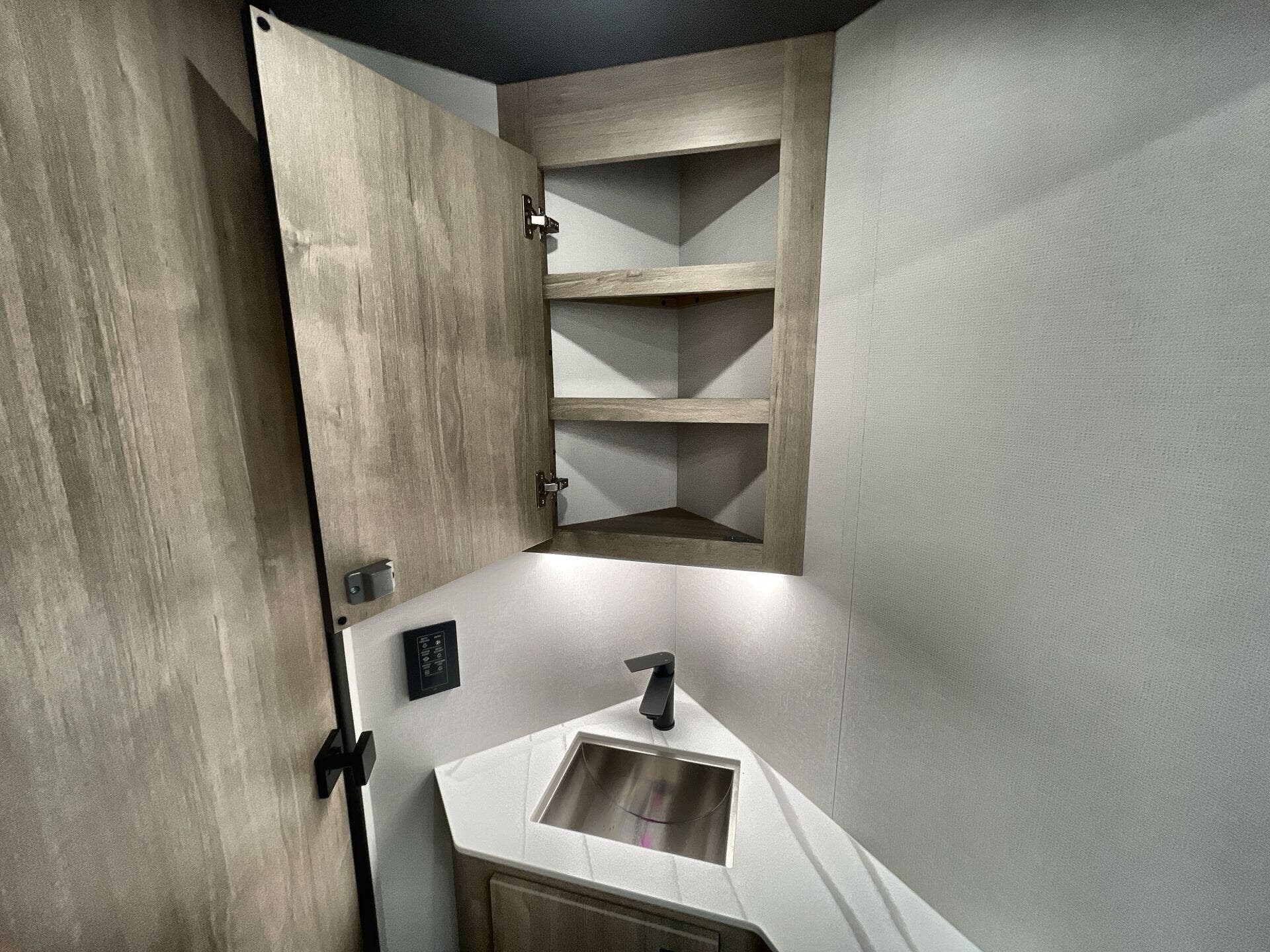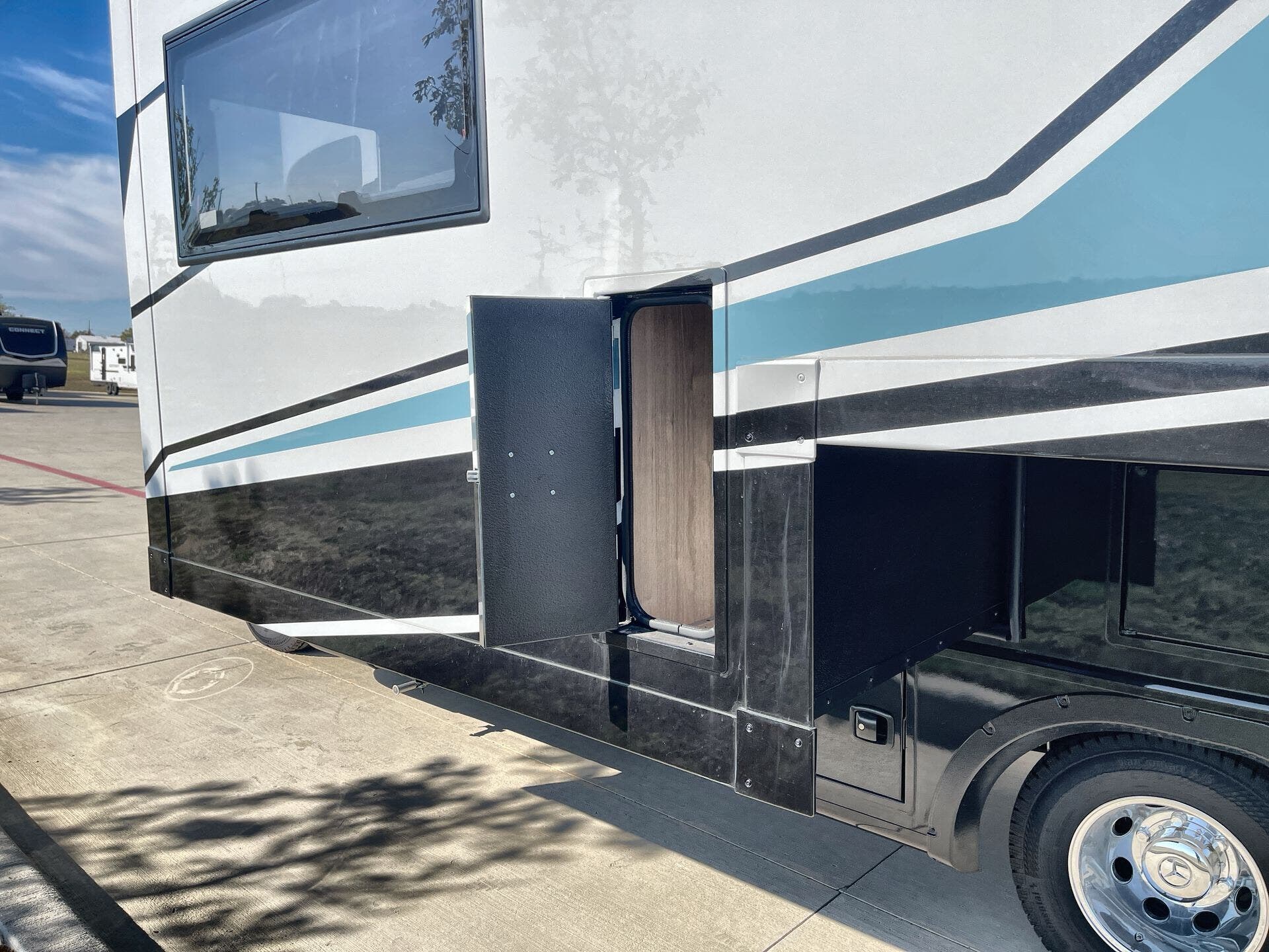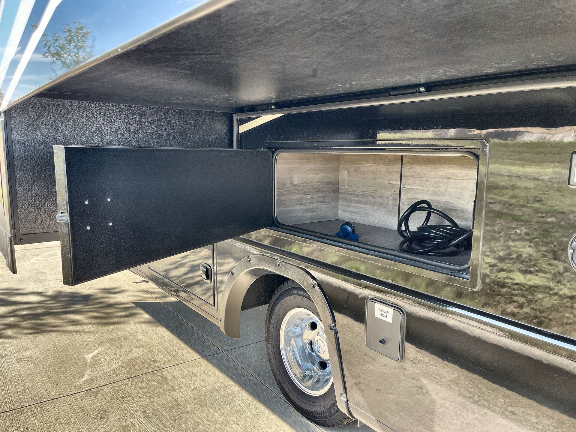 Inside, enjoy a bright, open-concept interior with residential-style furnishings, expansive panoramic windows, and thoughtful touches throughout. The well-appointed kitchen features solid-surface countertops, a deep stainless steel sink, and a premium appliance suite for ambitious cooks on the road. The living area provides reclining theater seats and an entertainment center with a smart TV and a cozy fireplace, creating a welcoming home-away-from-home ambiance. In the bedroom, a private queen bed with under-bed storage and dual wardrobes offers restful nights, while the bathroom showcases a walk-in shower and a linen closet for convenient daily routines.