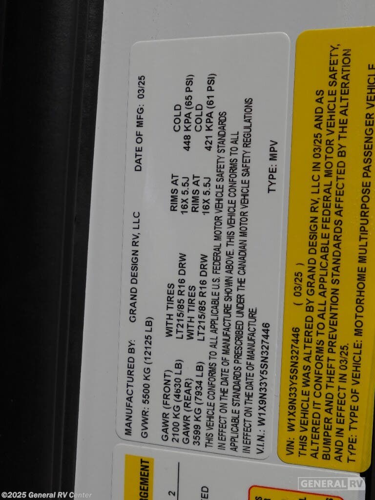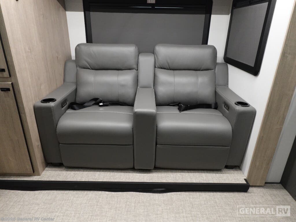 Experience the ultimate in comfort and style with the 2025 Grand Design Lineage 25FW. This exceptional RV is designed for those who crave adventure without sacrificing the comforts of home. The spacious interior features a luxurious king-sized bed, ensuring restful nights after a day of exploration. The front living area is perfect for relaxation, with power theater seating that invites you to unwind and enjoy your favorite shows on the conveniently placed TV. The center kitchen is a chef's delight, equipped with a full-size refrigerator and a convection cooktop, making meal preparation a breeze. The thoughtful design extends to the rear bath, offering privacy and convenience with a shower curtain and ample storage. With a 16 ft. powered retractable awning, outdoor enjoyment is just a step away, providing the perfect setting for alfresco dining or simply soaking in the scenery. Built on a robust Mercedes-Benz Sprinter 4500 chassis, this RV combines power and efficiency, making it a reliable companion for all your travels. For more details and to experience this RV firsthand, visit your nearest General RV dealership.