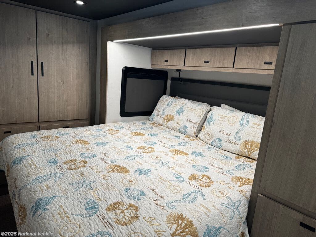 Bedroom: Rear queen bed with wardrobe and overhead cabinets; all new bedding and mattress protector included.