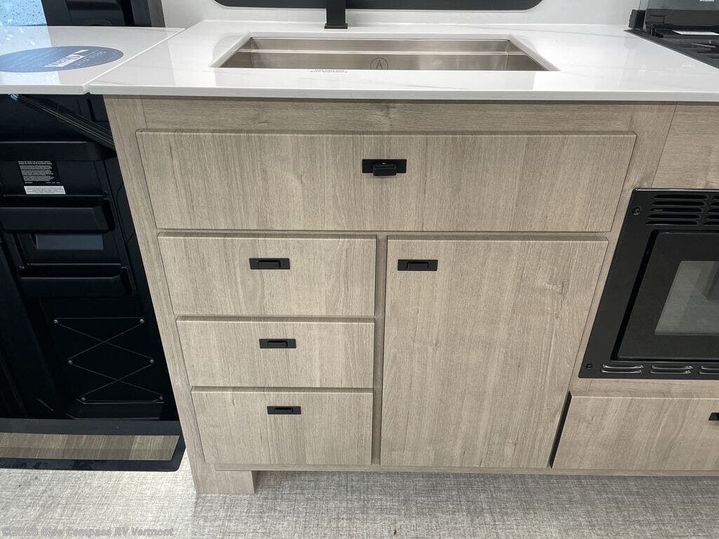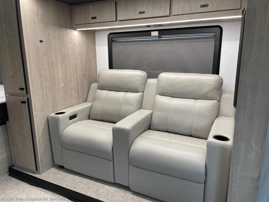 Head to your local state park or across the states in this spacious coach. Once you arrive at your destination, you can prepare a meal with the full kitchen amenities, including a cooktop, microwave oven, and a refrigerator. The power theater seating provides a place to relax, or you can choose the optional booth dinette if you need additional sleeping space. A full bath will let you clean up after a day outdoors, and the 70" x 80" king bed within the full-wall slide is sure to bring comfort. This model also includes a pantry beside the theater seats for snacks and a bedroom wardrobe to keep your clothes wrinkle-free!