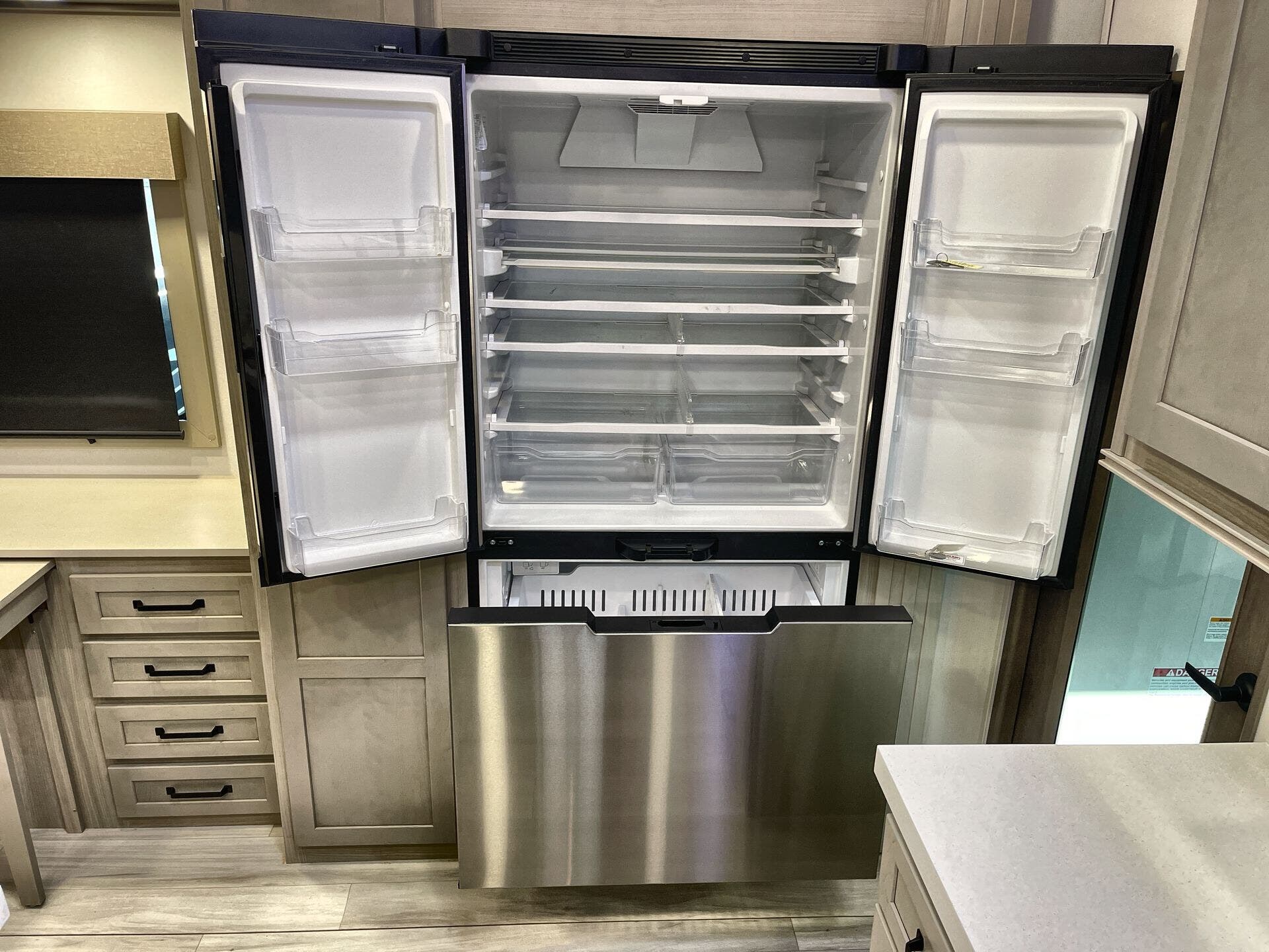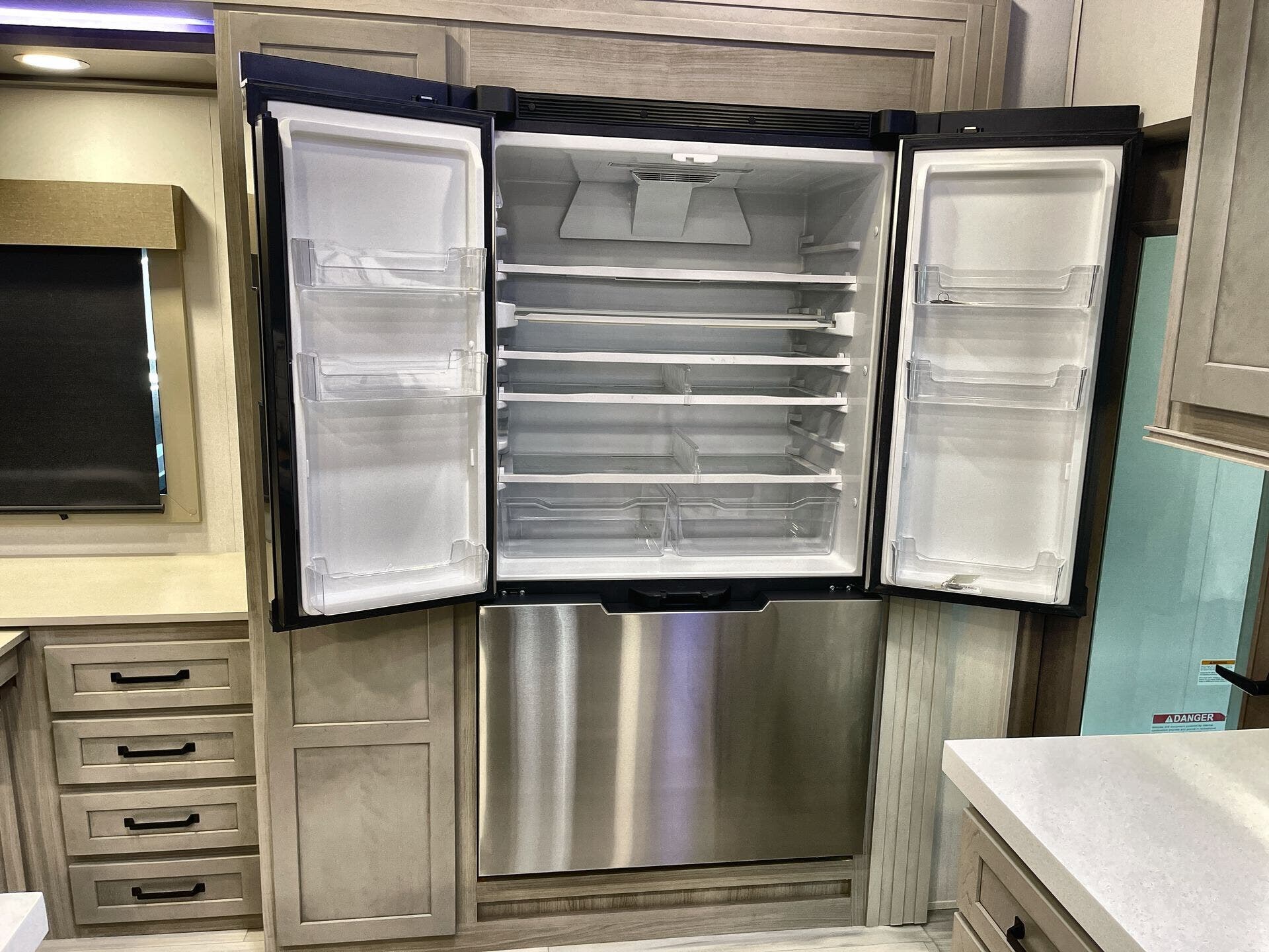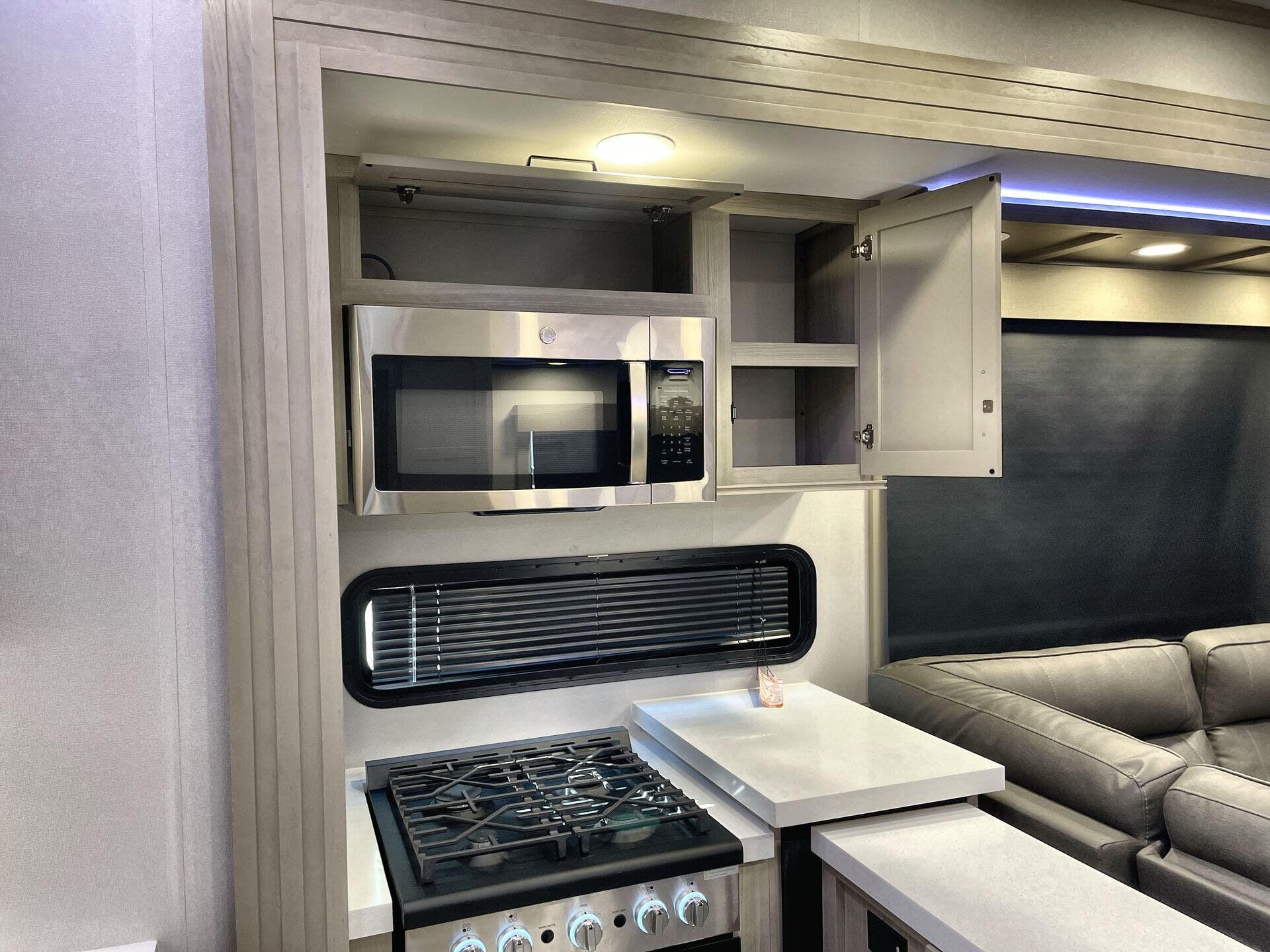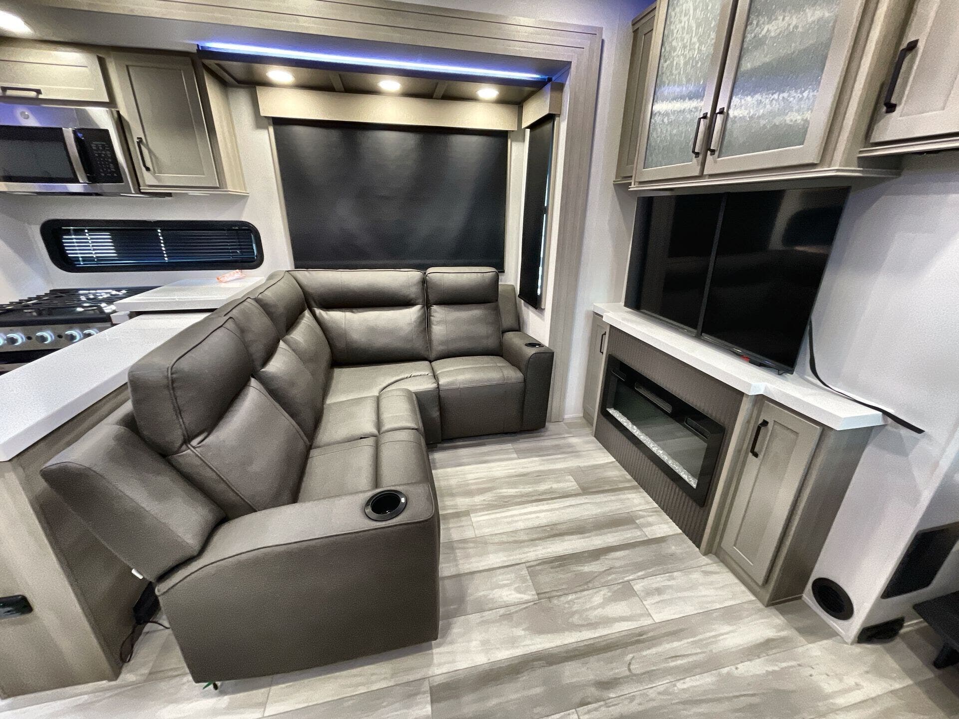 Inside, the Momentum 344M shines with a premium living area and practical storage. The layout blends a Mid Living Area with a Free Standing Dinette and Leather Furniture for elegant, comfortable gatherings. A well-equipped kitchen includes Microwave, Oven, Refrigerator, and Stove for full meal prep on the road, complemented by a dedicated Pantry and Medicine Cabinet for convenience. A Washer/Dryer Combo adds true home-life convenience, while the Queen Bed in the bedroom area ensures restful nights after outdoor adventures. Bathrooms feature a Shower and Toilet, along with modern safety and convenience details.