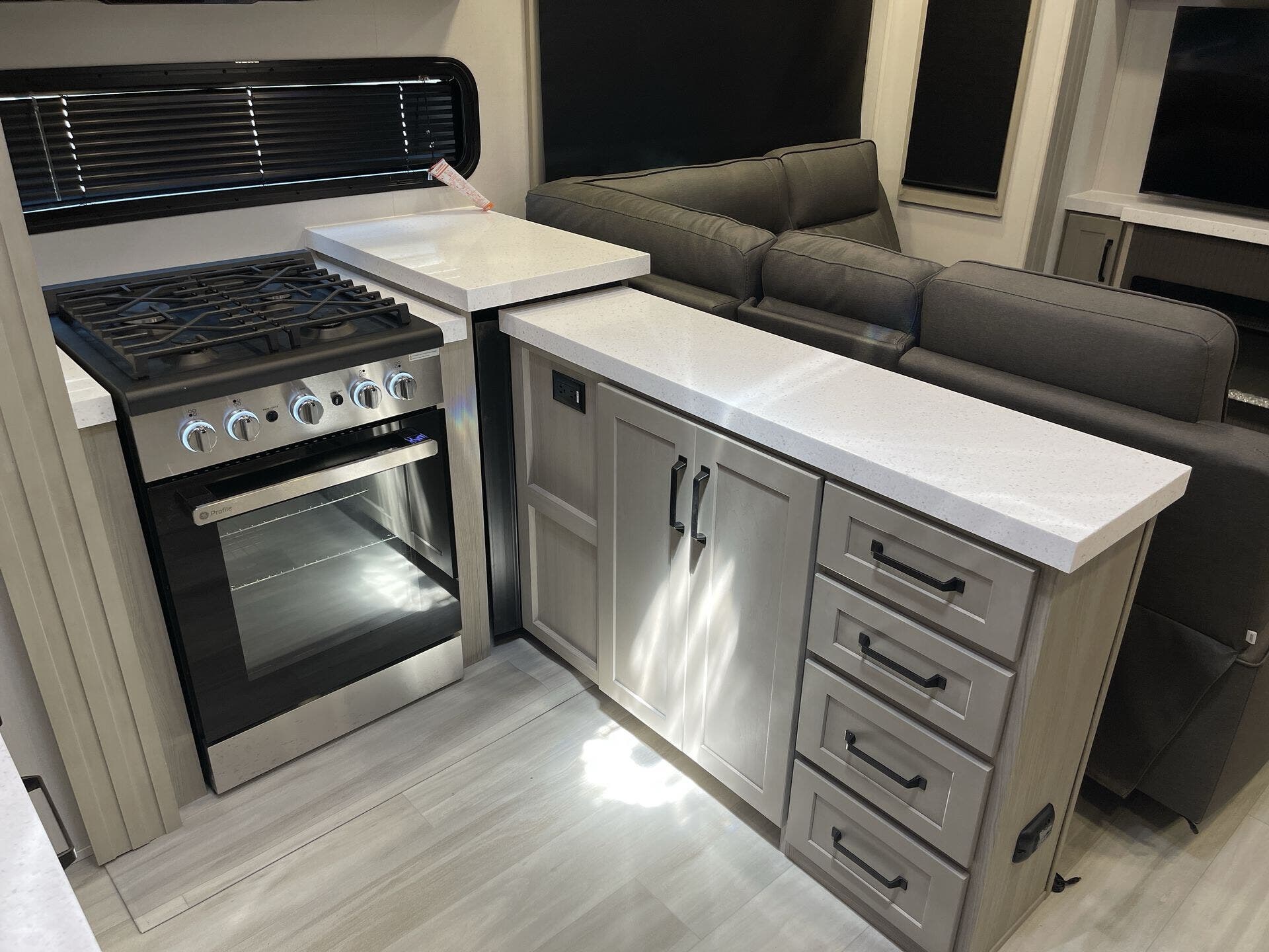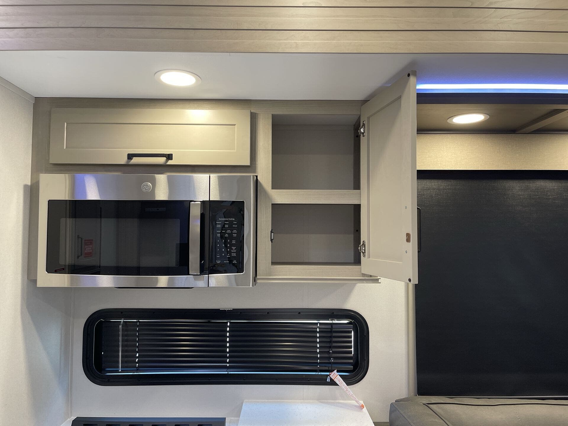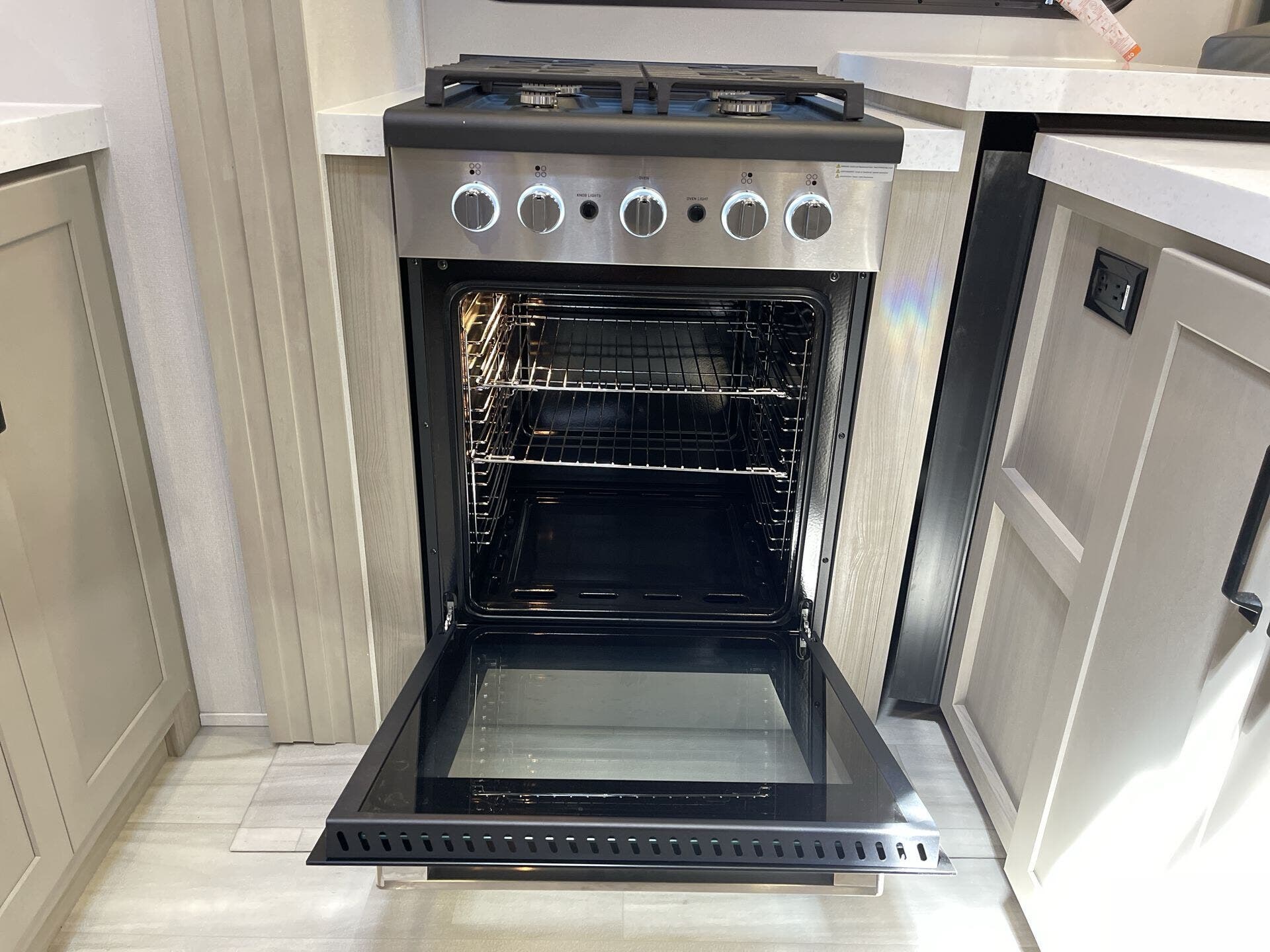 - Full kitchen setup featuring a refrigerator, microwave, oven, stove top burner, and water heater for on-the-go culinary adventures