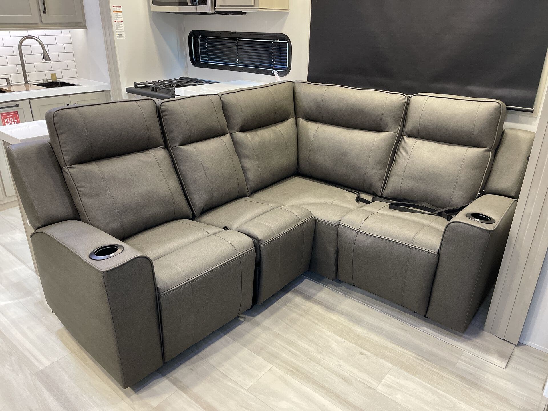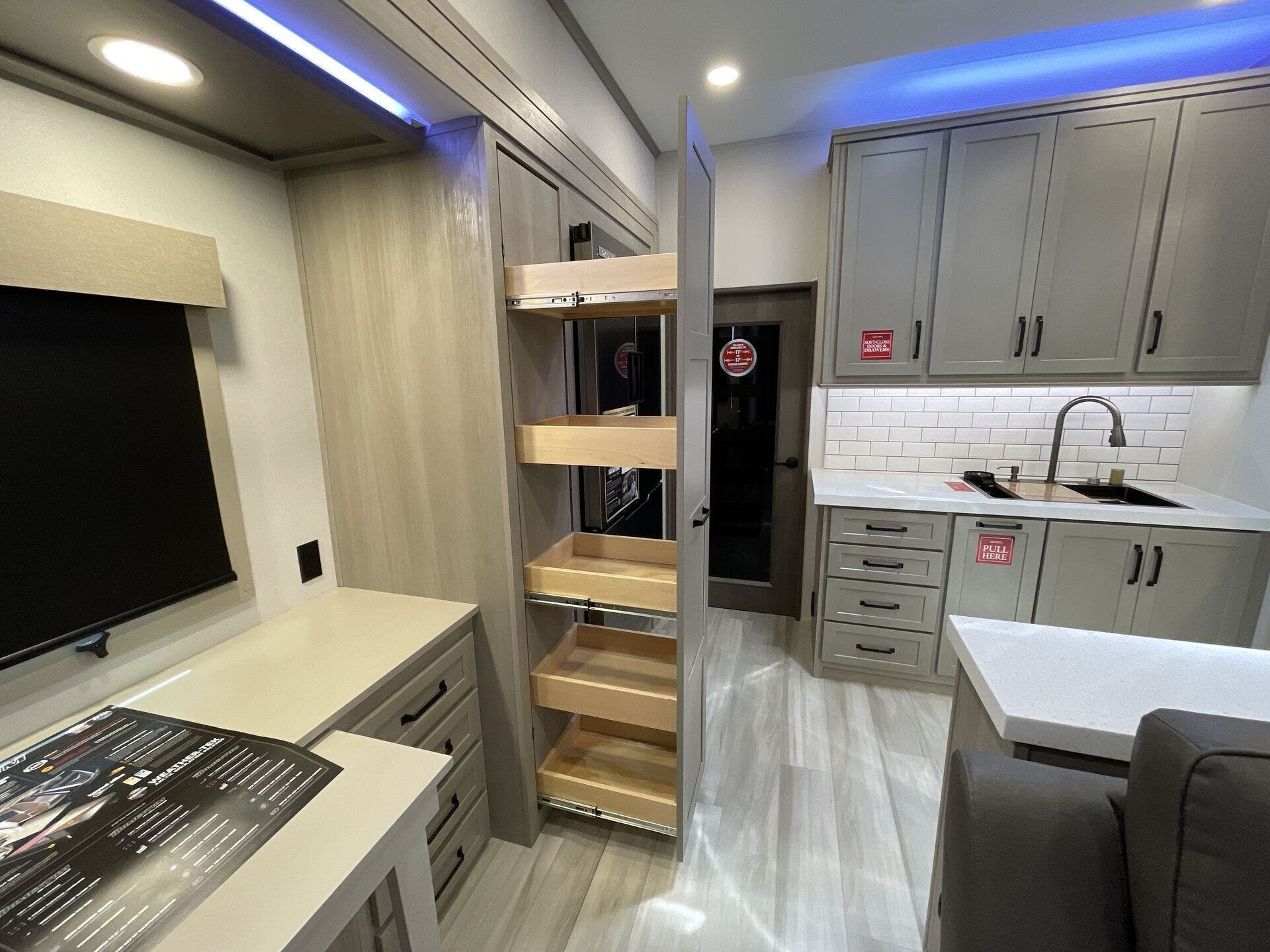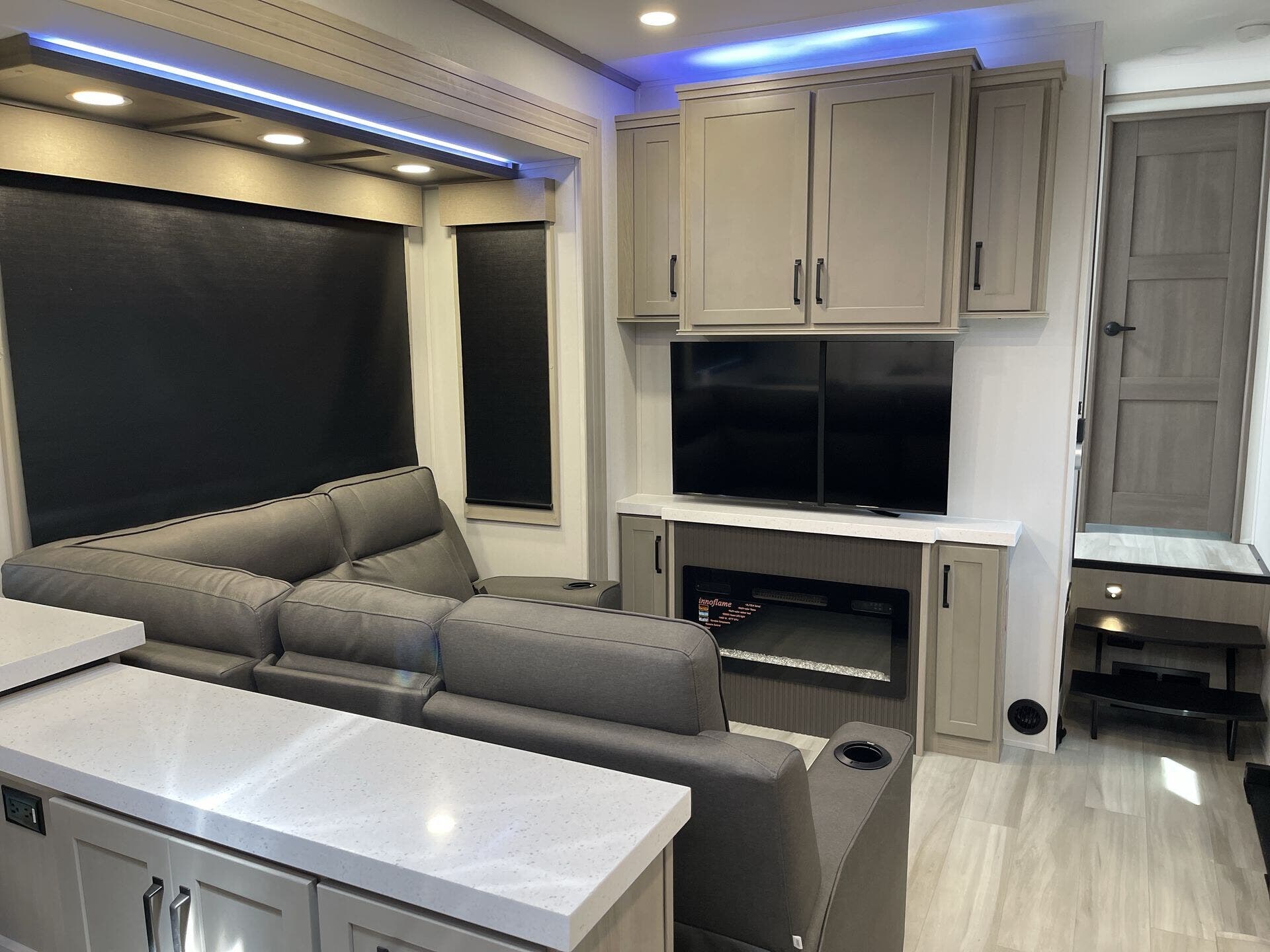 The Momentum model 392M boasts a length of approximately 45 feet 11 inches and a width of about 8 feet 5 inches, providing ample living and storage space. With three slideouts, this RV maximizes interior comfort and functionality, capable of sleeping up to 11 people comfortably. The tall ceiling height of 13 feet 6 inches enhances the open feel, while the well-thought-out layout includes a private queen bed, bunk beds, and a cozy living area with a loveseat or recliner seating, perfect for relaxing after a day of adventures.