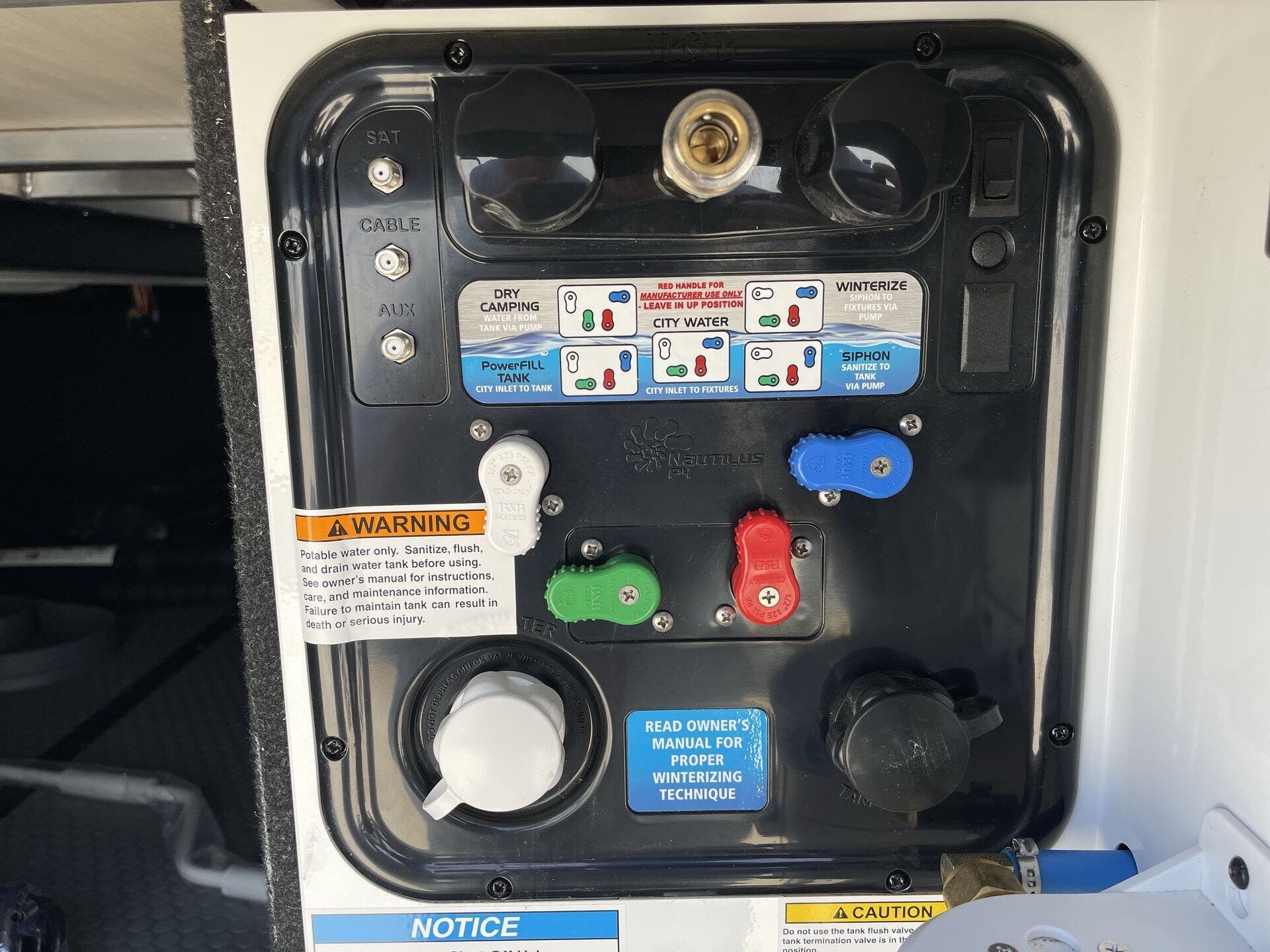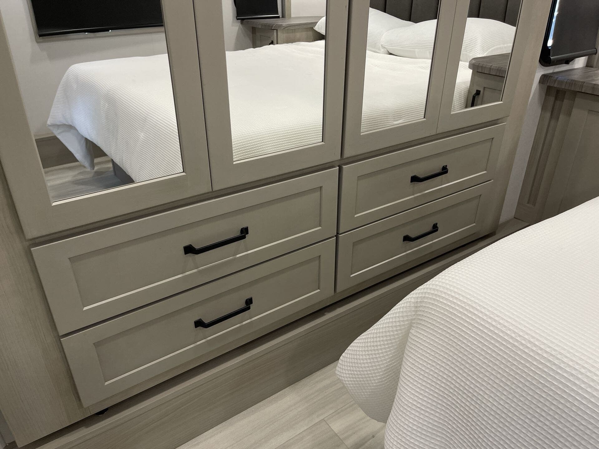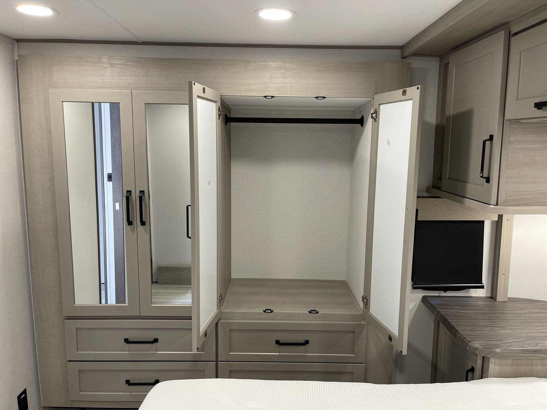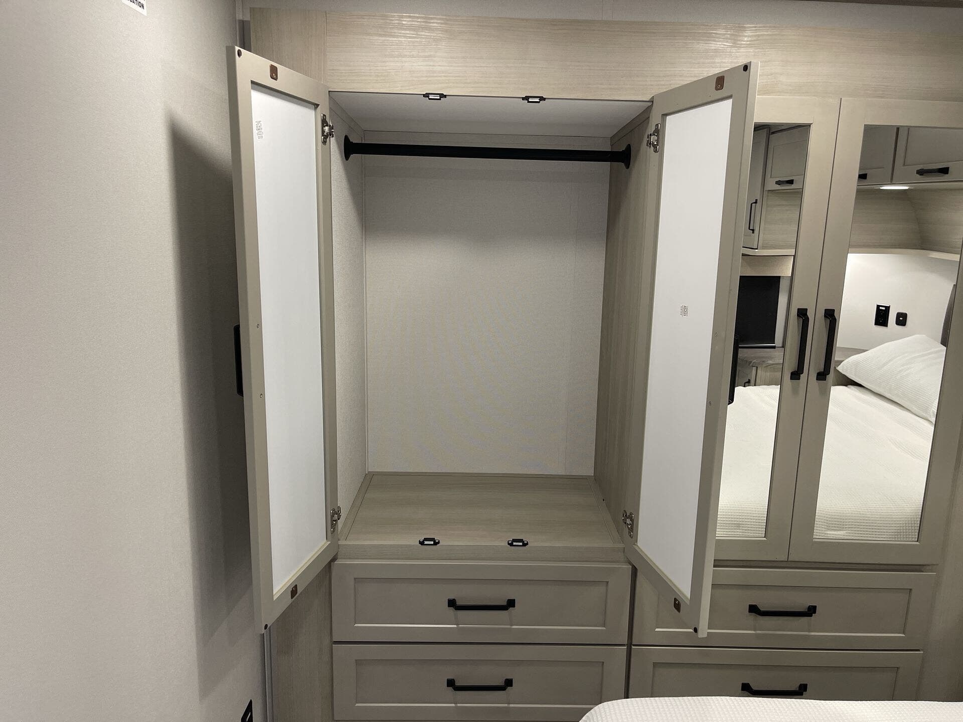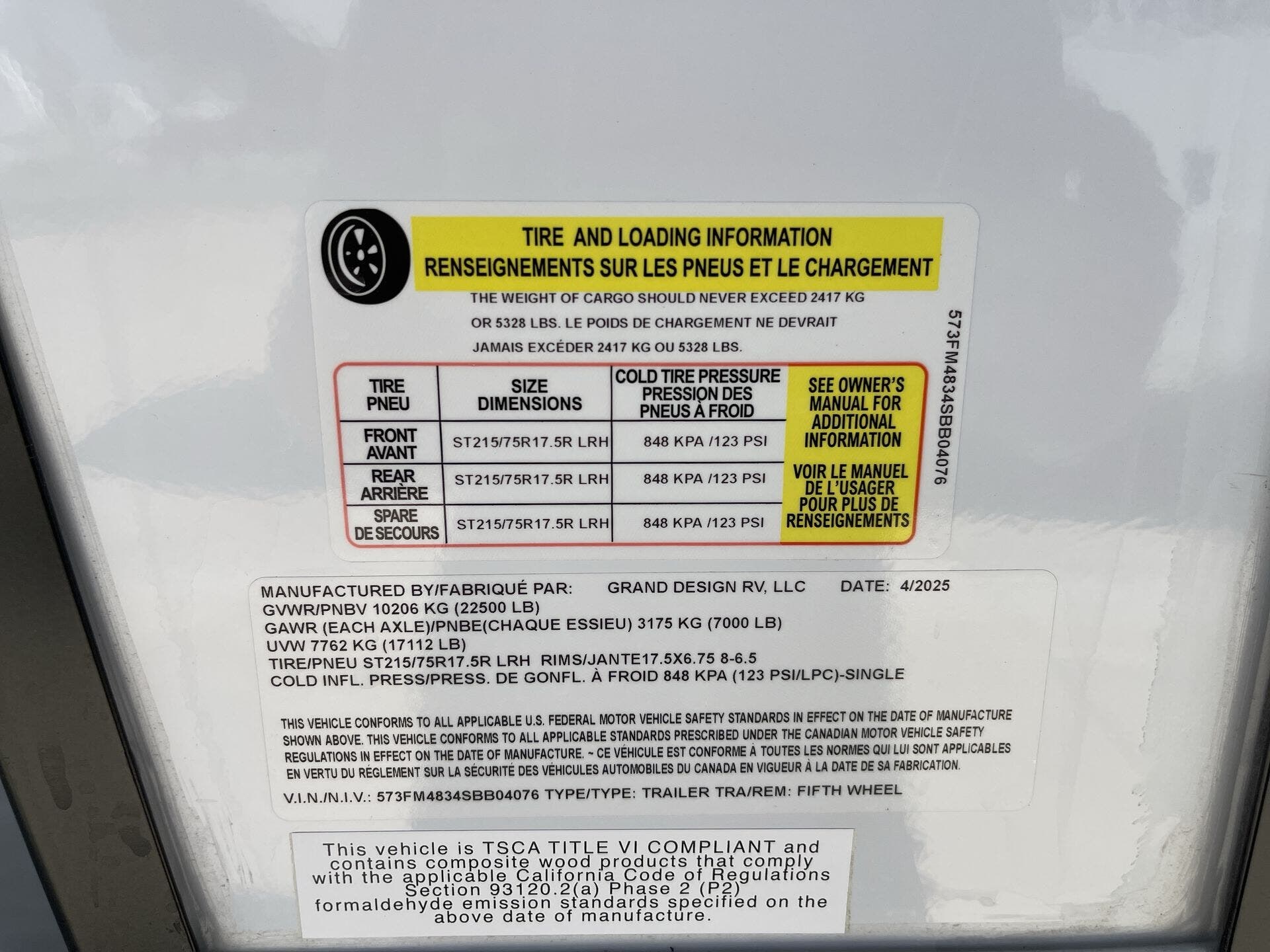 Built on a robust chassis with three axles, the RV has a gross vehicle weight of 22,500 pounds and a payload capacity of 5,518 pounds. Its water tanks include 140 gallons of fresh water, 52 gallons of black water, and 104 gallons of grey water capacity, ensuring extended stays in remote locations. The dry weight is approximately 16,982 pounds, making it a durable and reliable choice for towable RV enthusiasts.