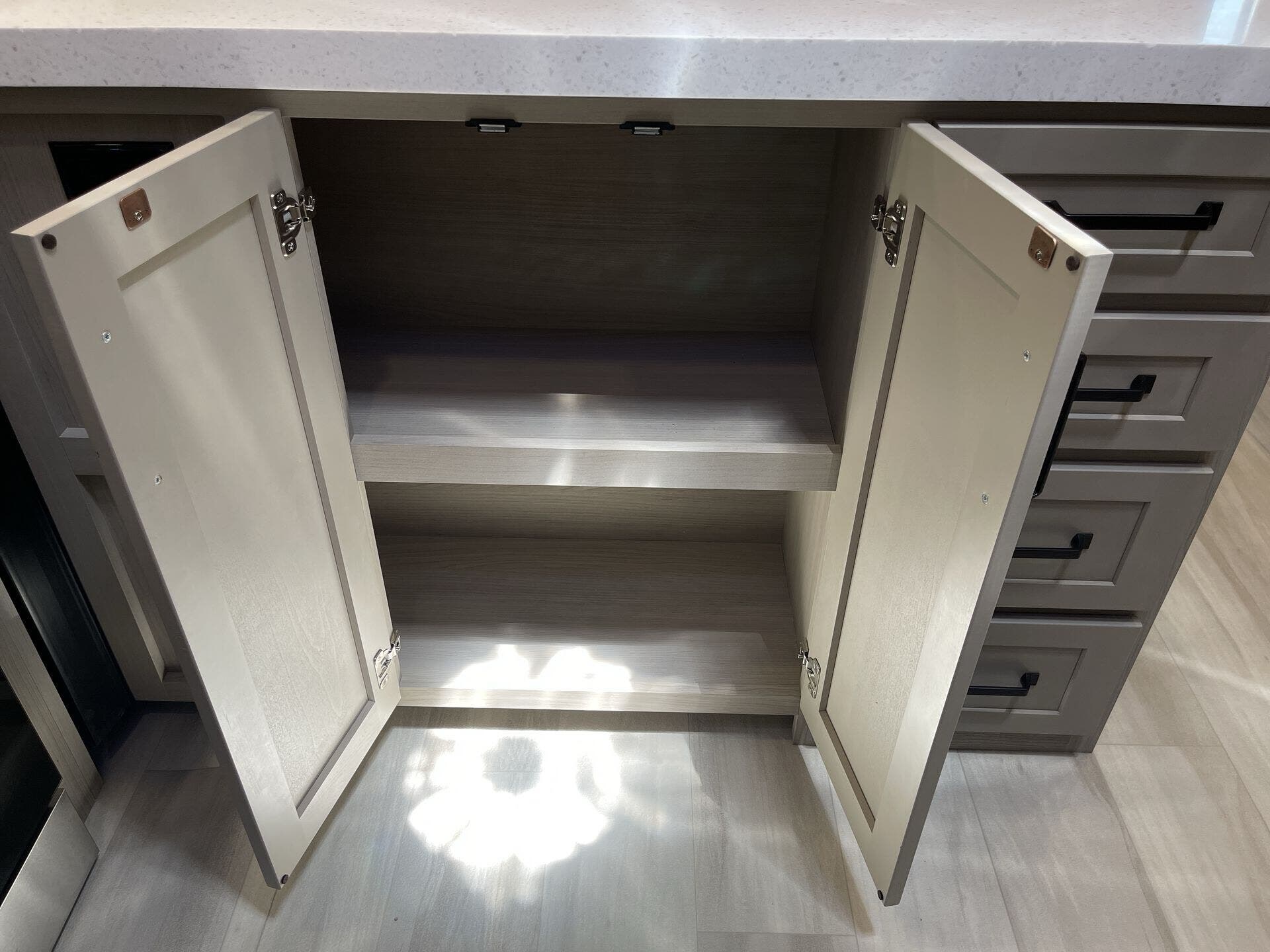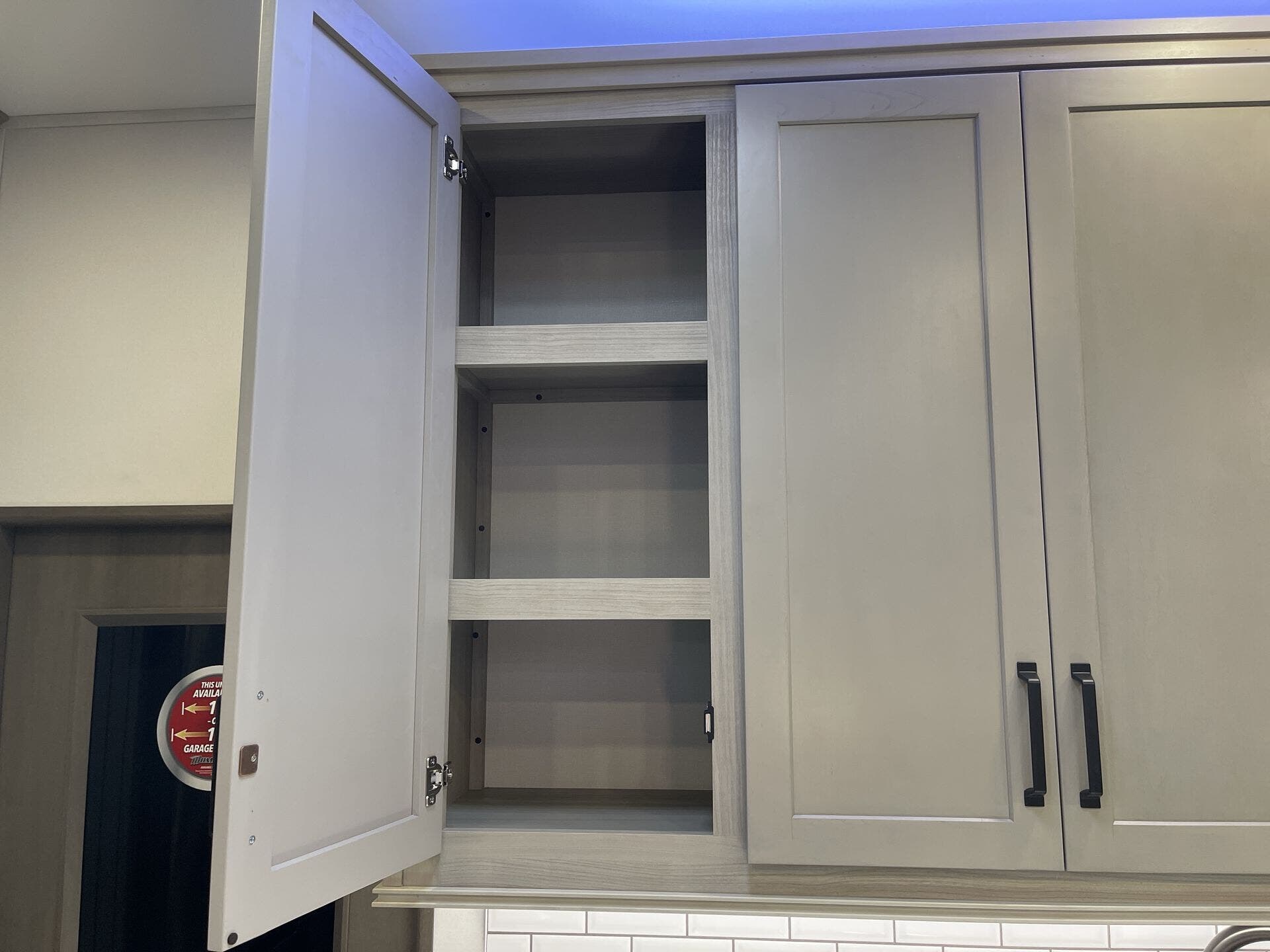 Designed for outdoor living, the Momentum includes an electric awning for shade, exterior shower, and a ladder for roof access. Safety is prioritized with detectors for CO, LP, and smoke. The exterior also features a spare tire kit, leveling jacks, and an exterior shower for versatile outdoor use.