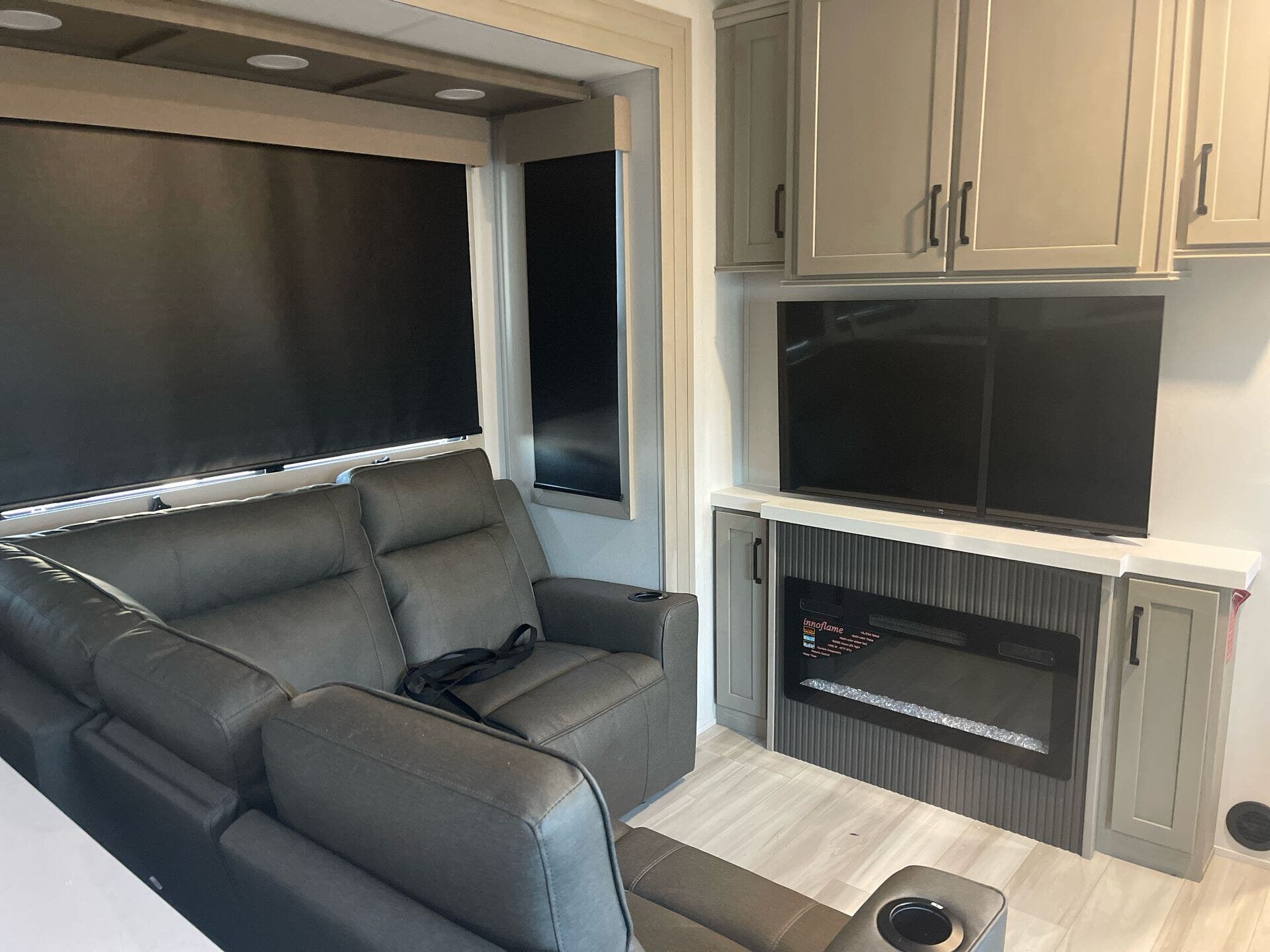 The living area sports an L-shaped reclining sofa, hybrid desk/dinette, entertainment center with fireplace, and a sleek kitchen island with a 20 cu ft stainless refrigerator and expansive pantry space. The private front suite includes a queen bed, deep wardrobes, and a luxurious bathroom, offering a relaxing retreat after a day’s adventure.