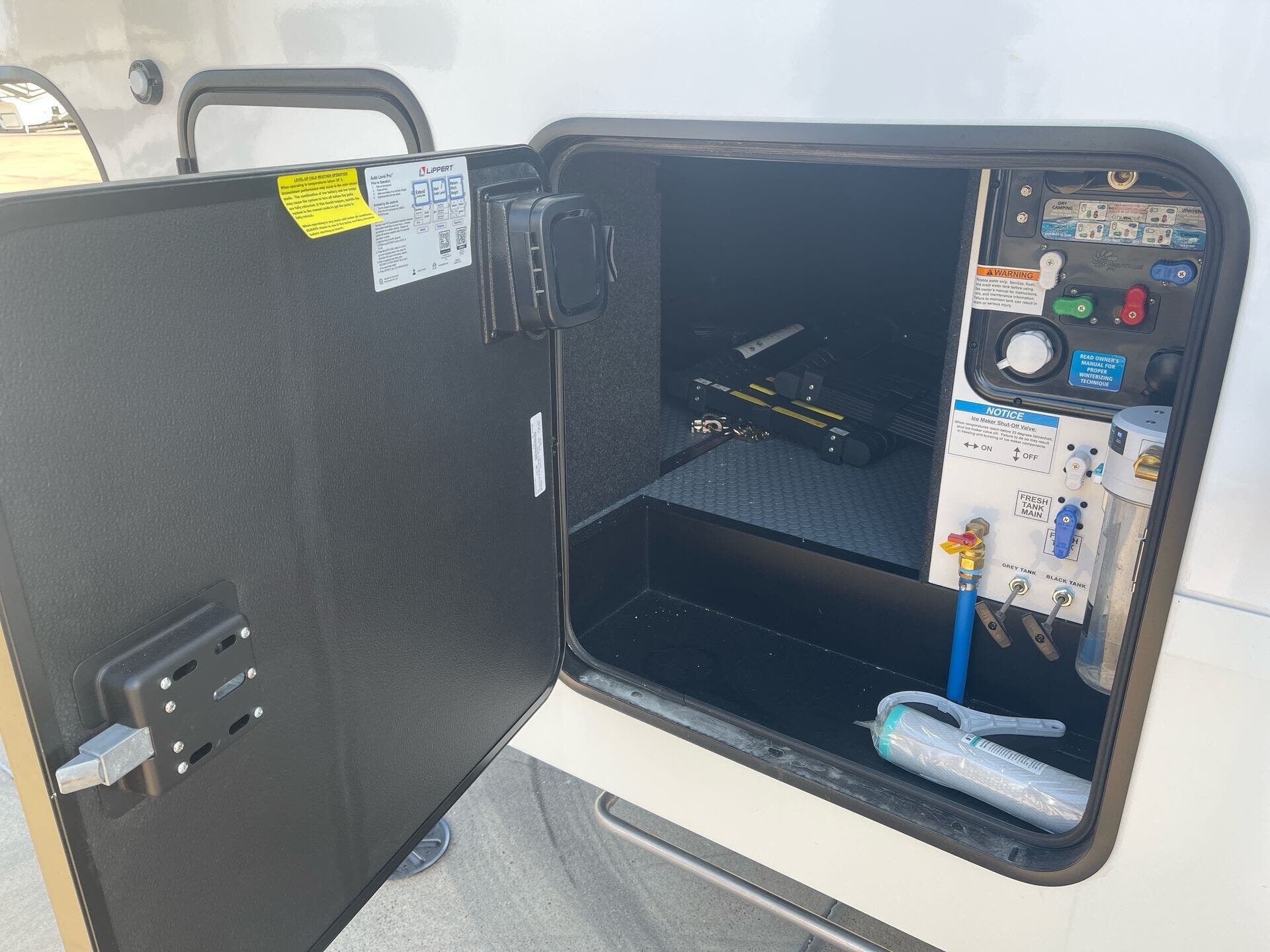 Awning, Exterior Speakers, External Shower, Ladder, Leveling Jacks, Power Roof Vent, Skylight, Slideout, Spare Tire Kit -