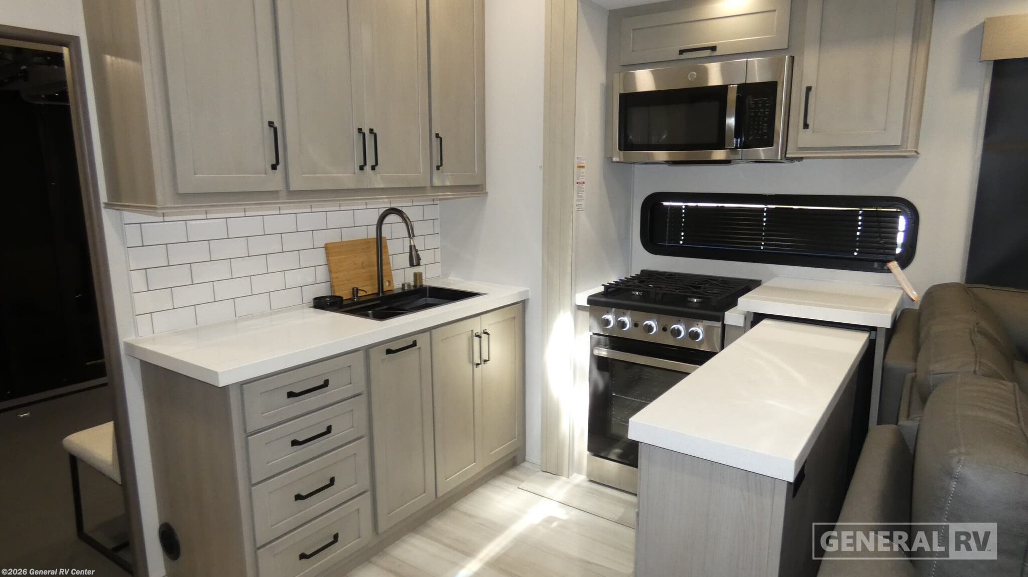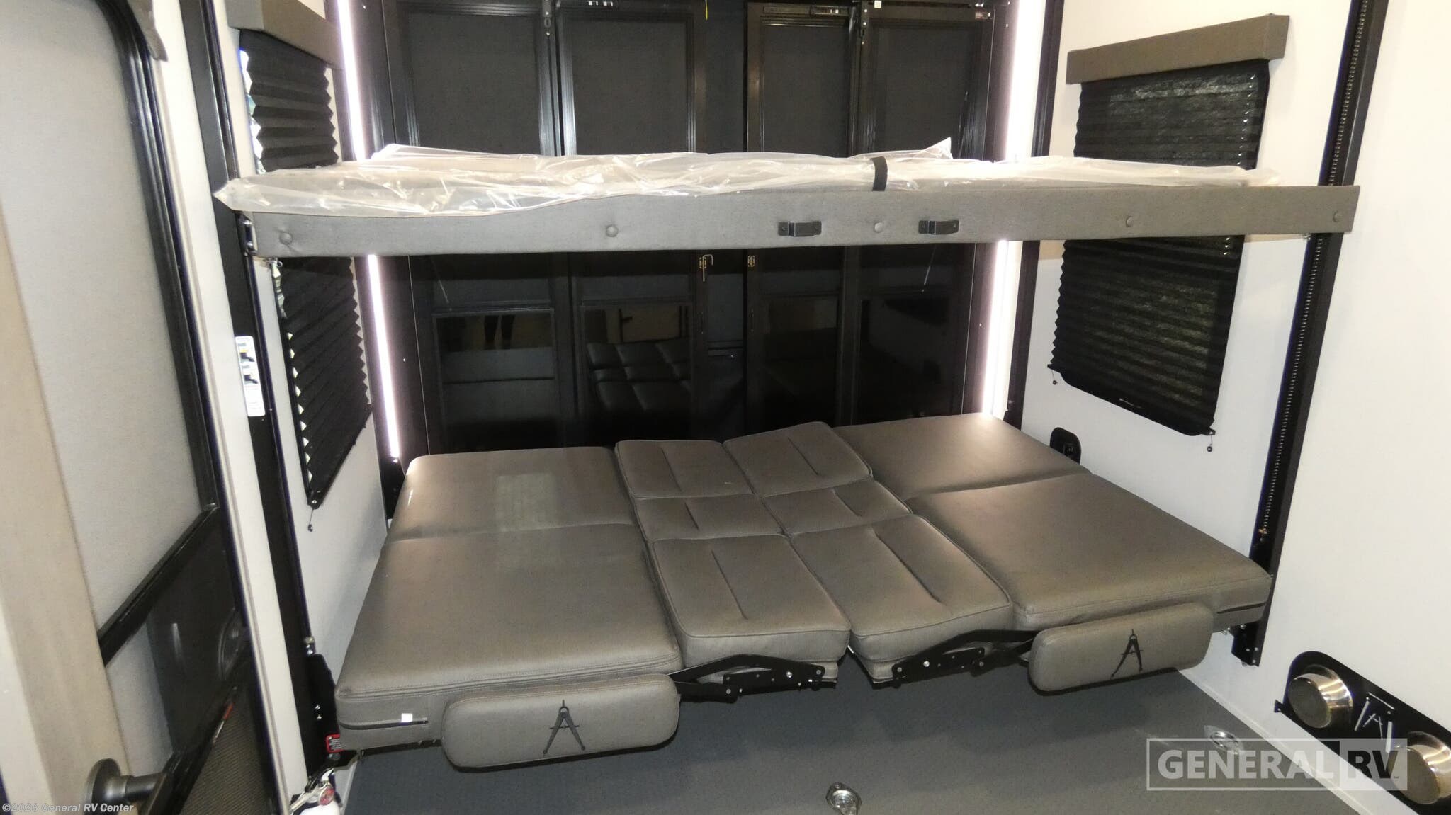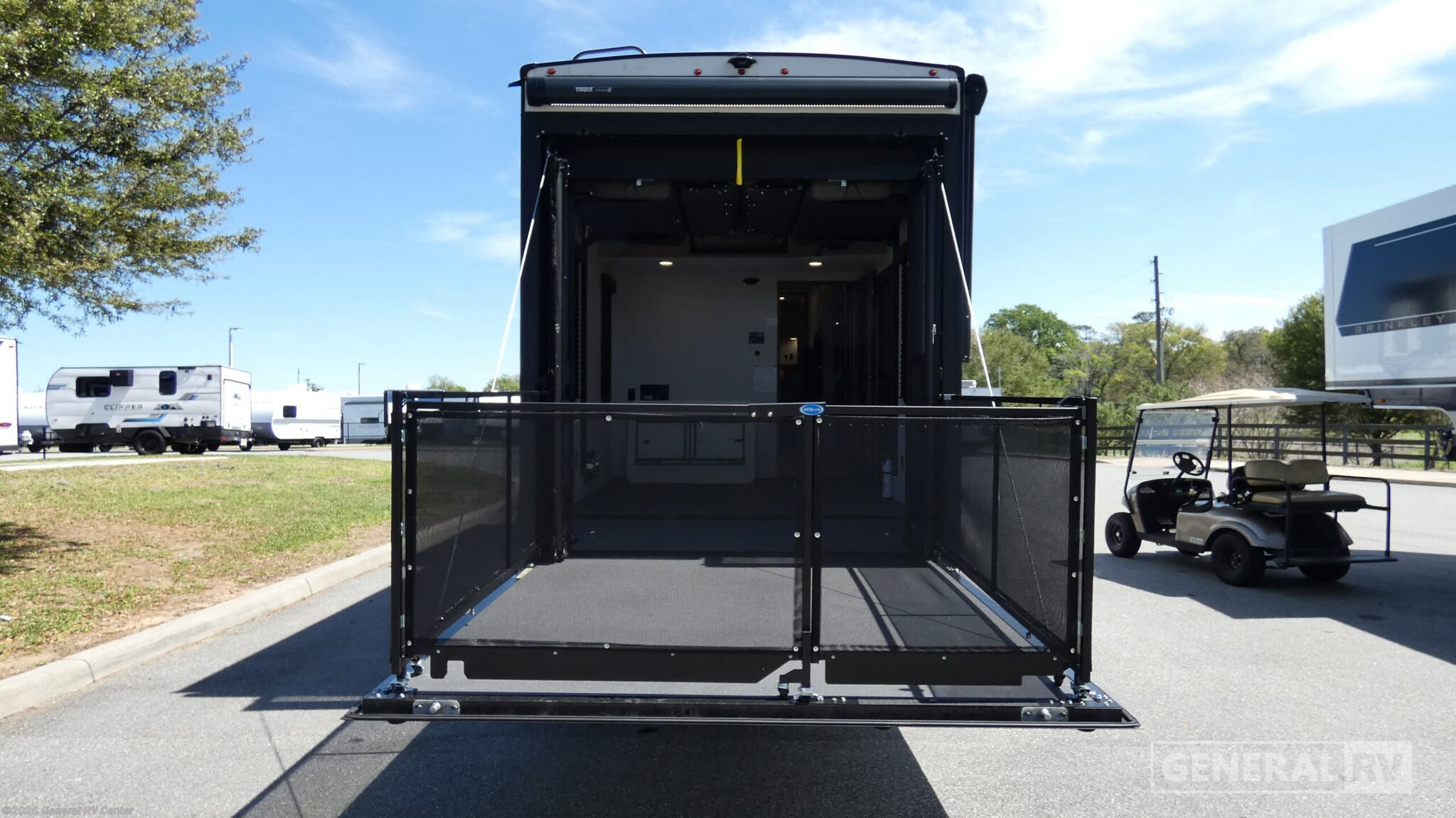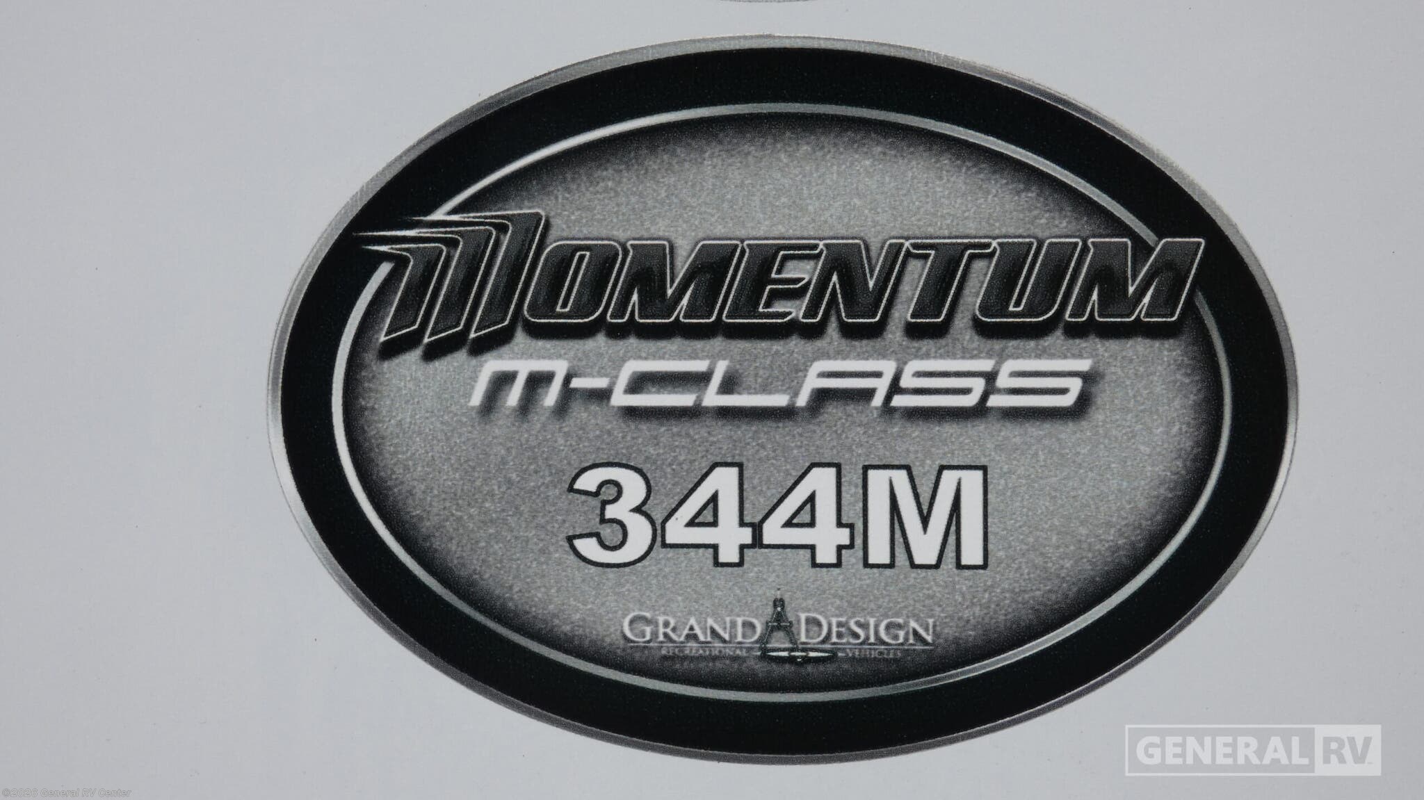 **Grand Design Momentum M-Class toy hauler 344M highlights:** - Dual Opposing Slides - Two Power Awnings - 11' Separate Garage - Fireplace - Kitchen Pantry Spend your days at the campground kicking up mud with this toy hauler in tow! once you've unloaded your toys from the ramp door, you can use the 60 gallon fuel station to fill up and head out on a trail! The overhead bed provides a place for guests to sleep, and there is an optional Liftsuite System for more sleeping space if needed. There is even an optional half bath here if you choose to make this space more accommodating. Head to the middle kitchen and living area where you'll enjoy generous counter space to prep meals, a spacious 20 cu. ft. refrigerator, an L-shaped sofa with recline, plus a hybrid desk/dinette that will serve as a dining or working space. The dual entry bath creates a front master bedroom you are sure to love. There is a queen bed with an optional king bed, plenty of overhead storage, and a wardrobe slide to keep your things organized. With any Momentum M-Class toy hauler by Grand Design, you will enjoy luxury at every turn! They have been constructed to a superior standard with a thermal roof design, triple insulated main floor and garage floor, and a Rail-Tite underbelly seal that will allow you to camp in all elements. Each model also features an 8' 5" wide body chassis with a wide rail design, no wheel wheels, and a dovetail entry for easier loading. The Stealth A/C system provides maximum cooling power, and the CRE3000 suspension system means you can enjoy a smooth tow each time. You will love the luxurious interior with a professional grade stainless steel cooktop, interior color changing LED accent lighting, a fiberglass shower with a glass door, and solid surface countertops.