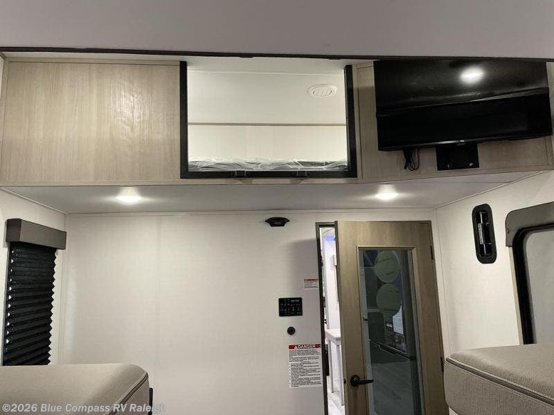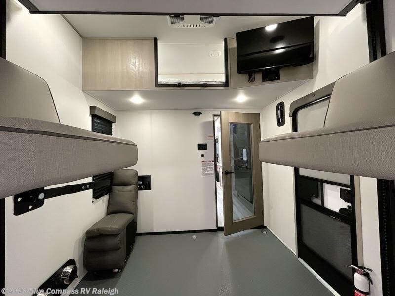 Spend your days at the campground kicking up mud with this toy hauler in tow! once you've unloaded your toys from the ramp door, you can use the 60 gallon fuel station to fill up and head out on a trail! The overhead bed provides a place for guests to sleep, and the optional Happi-Jac rollover sofas and a table with a top bed will give you the option to add even more seating and sleeping space. There is even an optional half bath here if you choose to make this space more accommodating. Head to the middle kitchen and living area where you'll enjoy generous counter space to prep meals, a spacious 20 cu. ft. refrigerator, an L-shaped sofa, plus a hybrid desk/dinette that will serve as a dining or working space. The dual entry bath creates a front master bedroom you are sure to love. There is a queen bed with an optional king bed, plenty of overhead storage, and a wardrobe slide to keep your things organized.