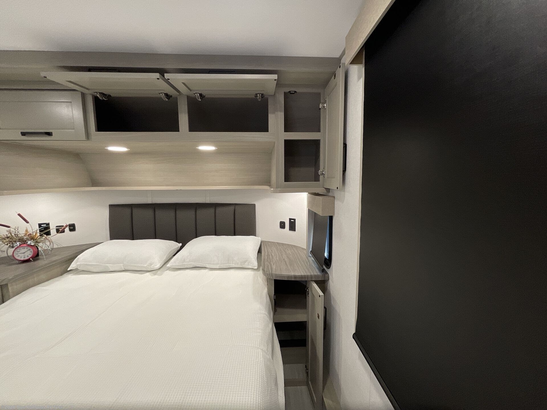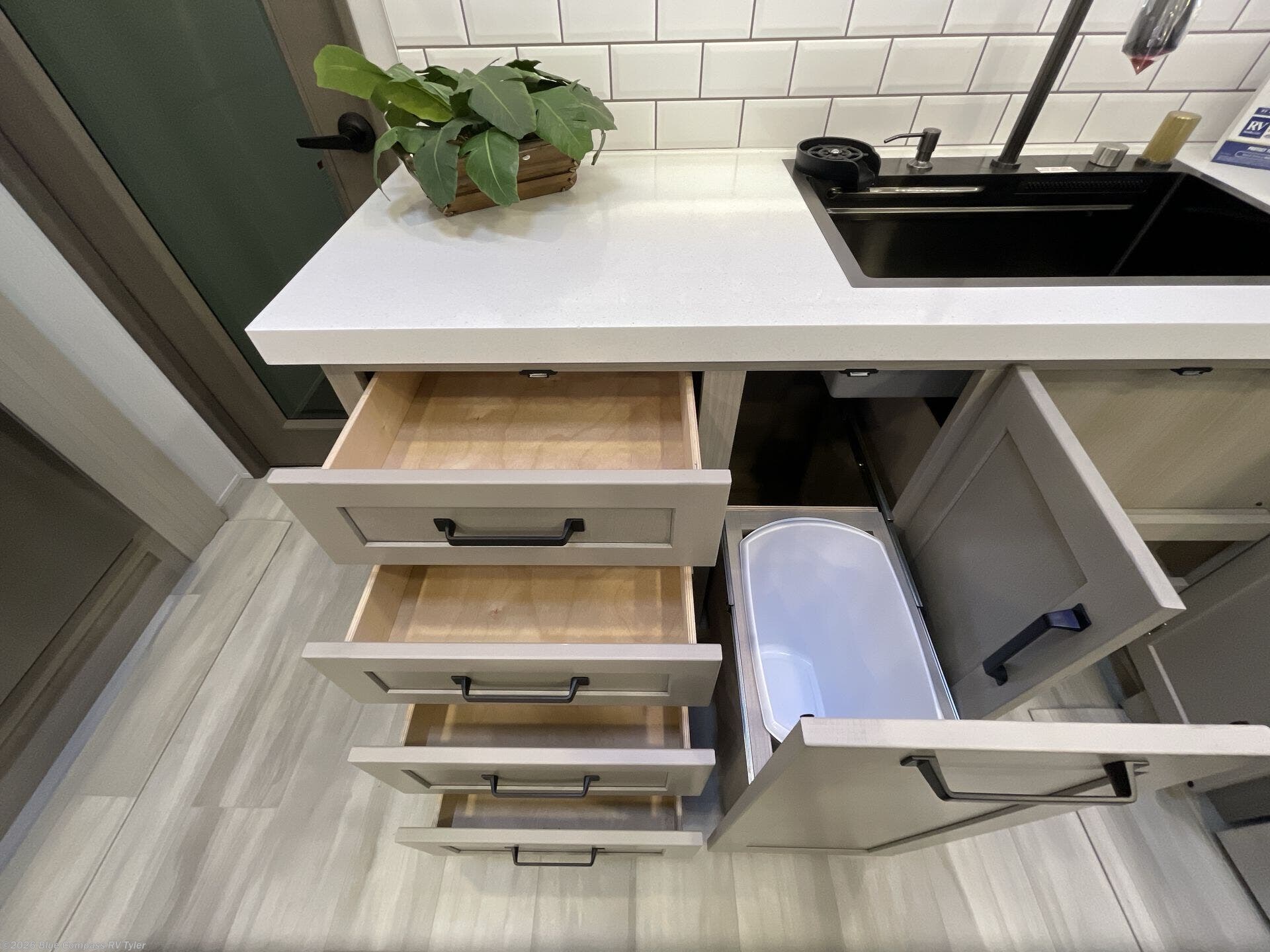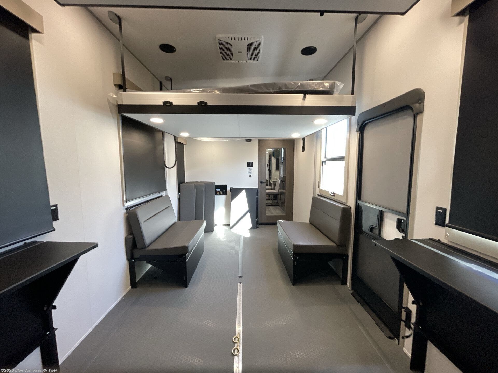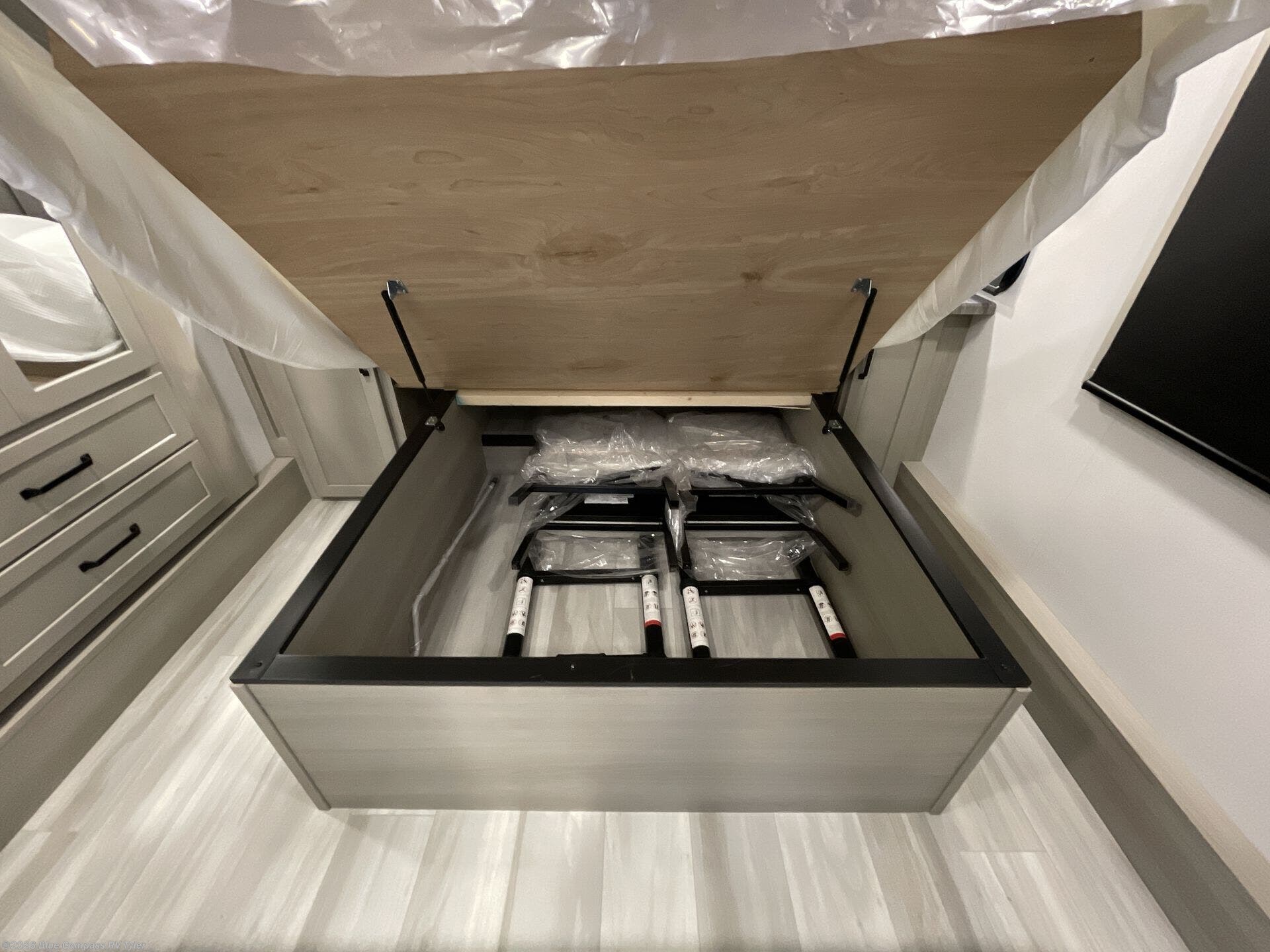 This toy hauler with a 17' separate garage will be perfect for your outdoor adventures. There is an adjustable tie-down system to keep your gear secure, an overhead loft bed, plus an optional half bath. And two optional Liftsuite Systems can be added if you need more sleeping space. There is also washer and dryer prep here, along with a flip-up pet dish for your furry friends. The chef will love the large kitchen countertop for more meal prep space, and there is a 20 cu. ft. refrigerator and pantry for food storage. You can get comfy on the L-shaped sofa across from the 50" TV, or get some work done at the hybrid desk/dinette. There are also dual opposing slides here for added space. The third slide out is found in the front master bedroom, which includes drawers and storage space for your things. A queen bed will provide a great night's rest, and you have the option to choose a king bed if you want more space to stretch out!