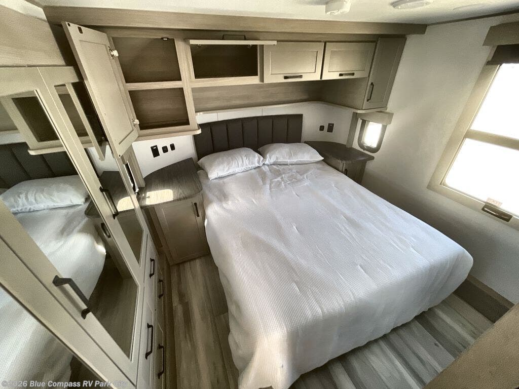 You want a toy hauler to carry your toys to the trails, and include many at-home comforts, and that's just what this unit delivers. A 14' separate garage includes an adjustable tie-down system, an optional Lifesuite System for more sleeping space, an optional half bath, plus washer and dryer prep. There is an overhead loft bed and an L-shaped sofa with recline in the main living area that offers sleeping space as well. Everyone can watch a movie on the LED TV with a fireplace below while sitting on the sofa, in the theatre seats, or while at the free standing dinette with four chairs. The chef will have upgraded appliances to make meals for everyone, an L-shaped countertop with a kitchen sink, and a USB charging outlet. You will love the shower with seat in the full bathroom with two space savings sliding doors that lead into the hallway, and into the front bedroom where you will have a walk-around queen bed, a slide out wardrobe and more USB charging outlets.