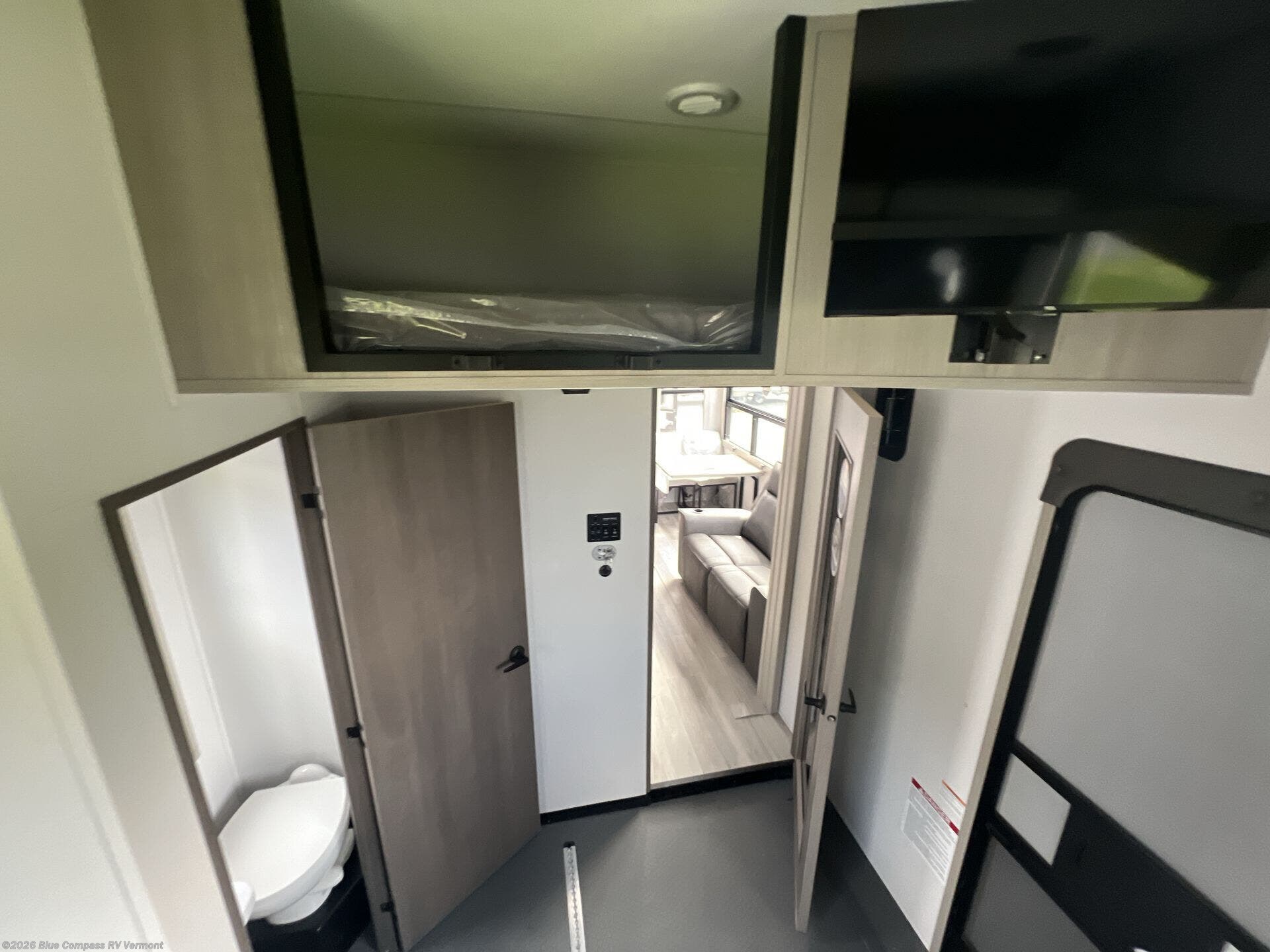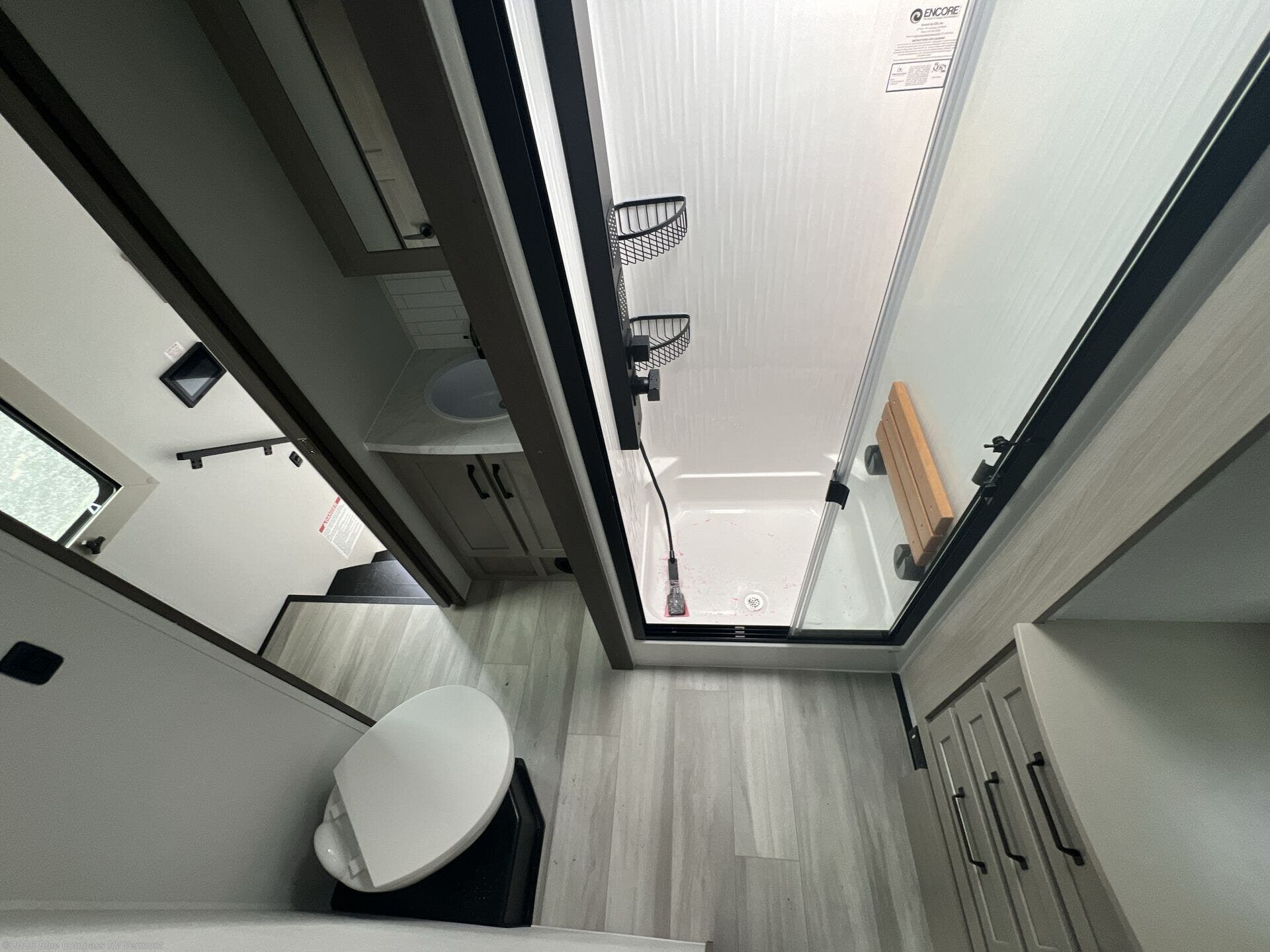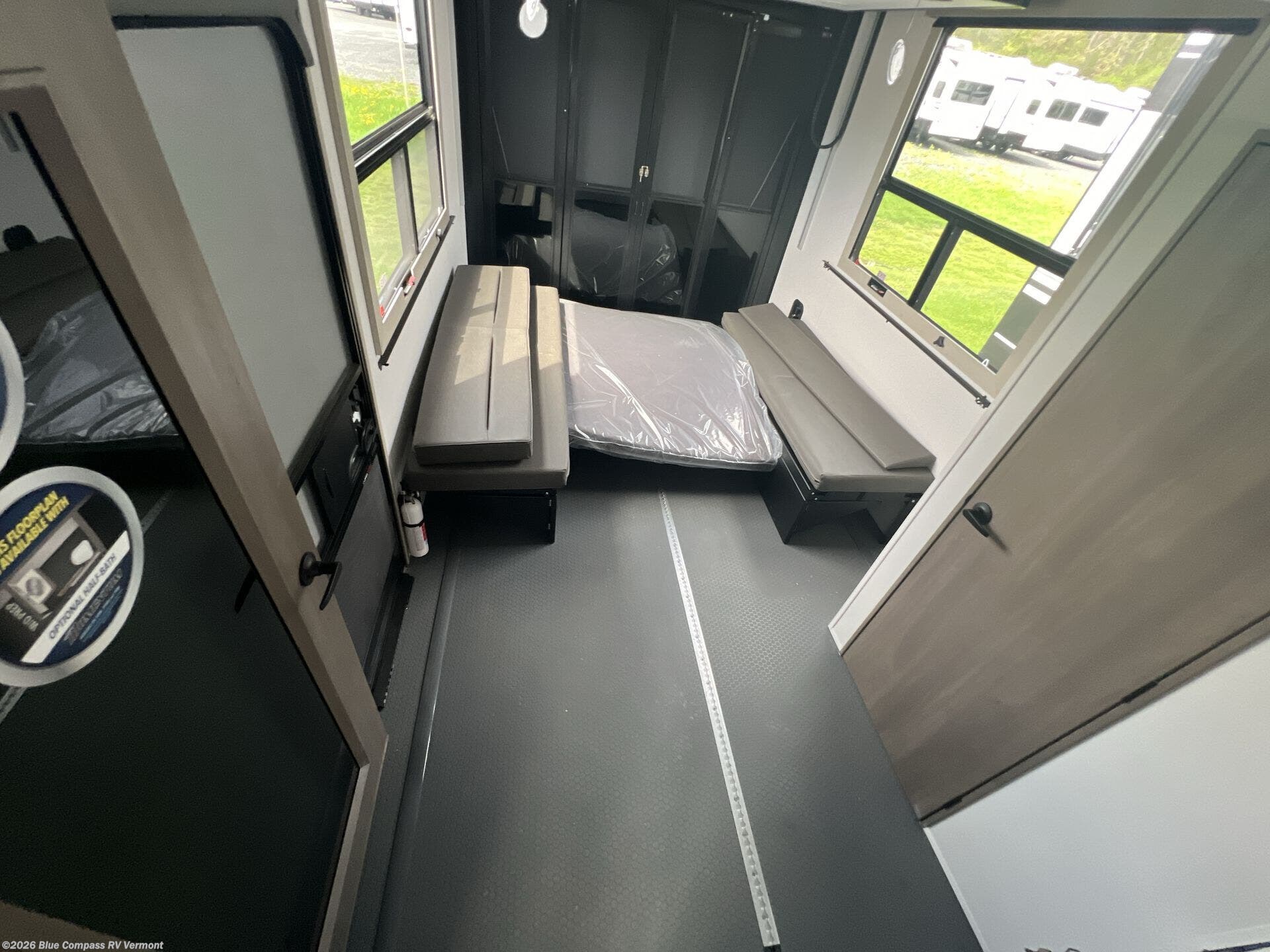 You want a toy hauler to carry your toys to the trails, and include many at-home comforts, and that's just what this unit delivers. A 14' separate garage includes an adjustable tie-down system, an optional Lifesuite System for more sleeping space, an optional half bath, plus washer and dryer prep. There is an overhead loft bed and an L-shaped sofa with recline in the main living area that offers sleeping space as well. Everyone can watch a movie on the LED TV with a fireplace below while sitting on the sofa, in the theatre seats, or while at the free standing dinette with four chairs. The chef will have upgraded appliances to make meals for everyone, an L-shaped countertop with a kitchen sink, and a USB charging outlet. You will love the shower with seat in the full bathroom with two space savings sliding doors that lead into the hallway, and into the front bedroom where you will have a walk-around queen bed, a slide out wardrobe and more USB charging outlets.