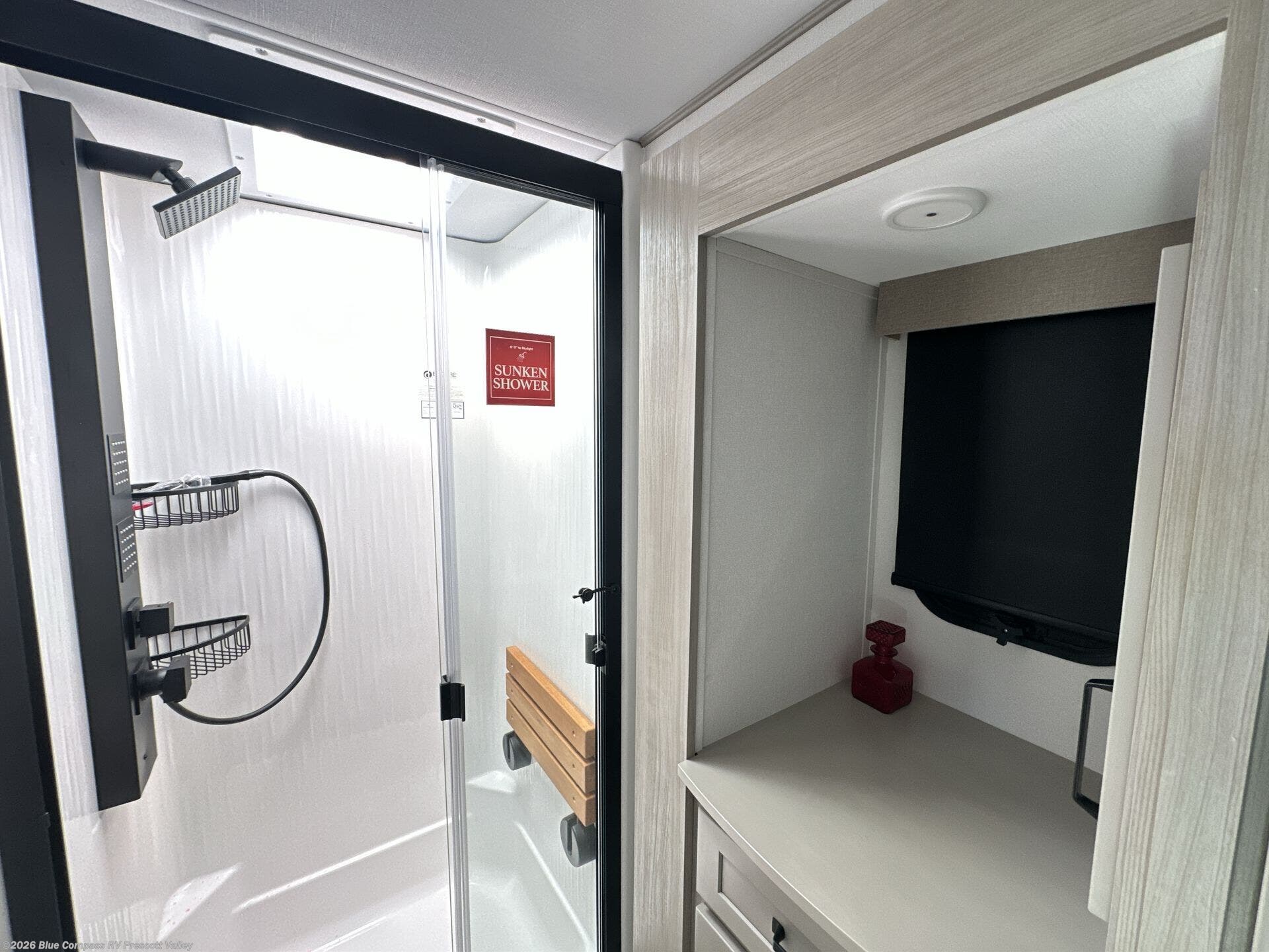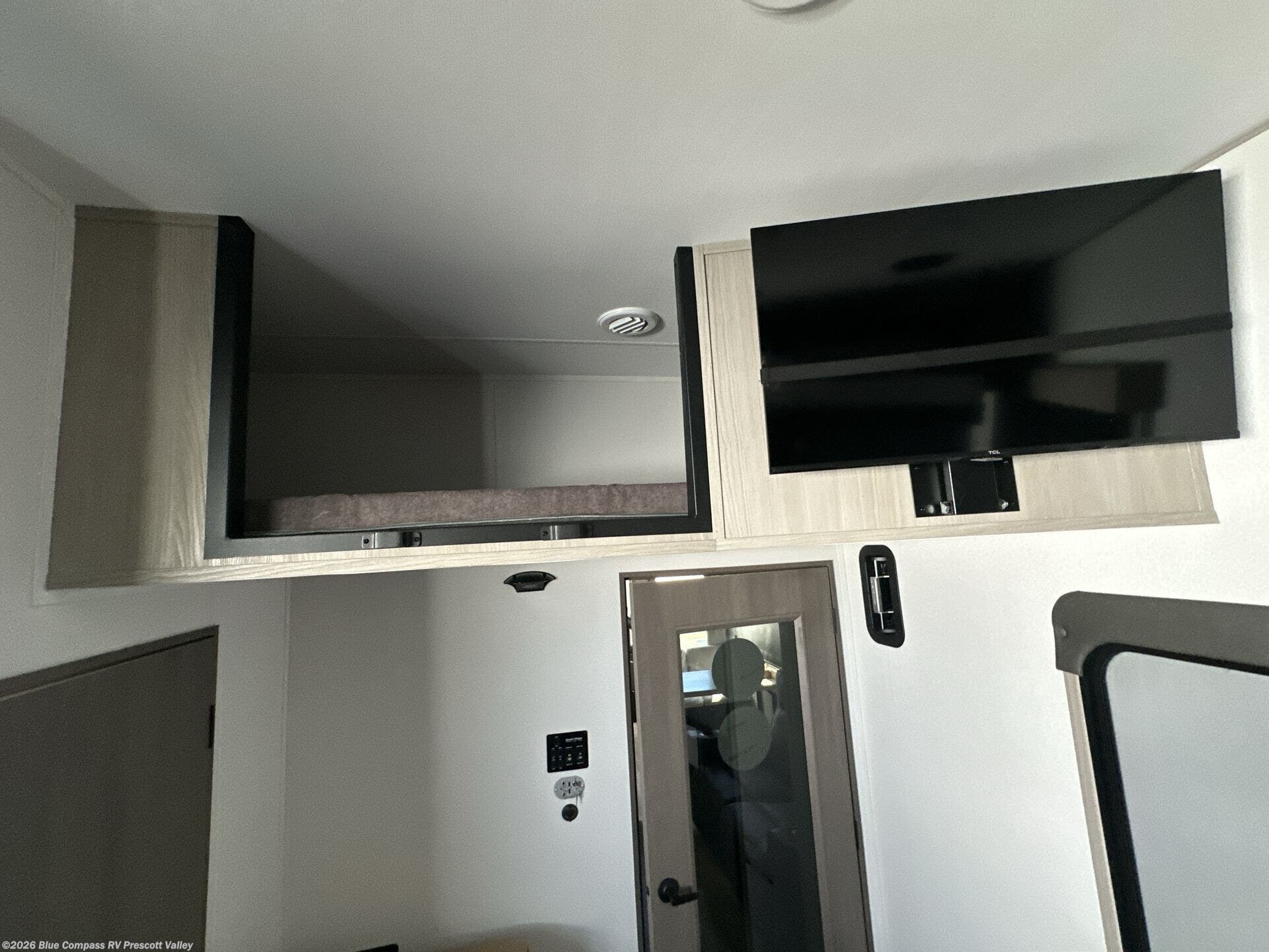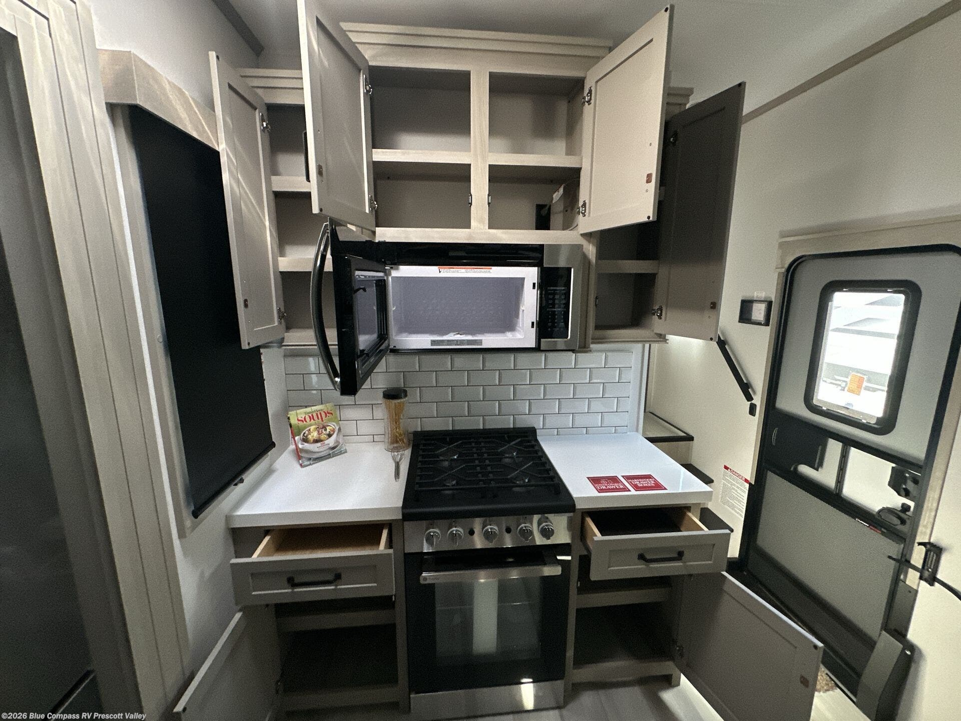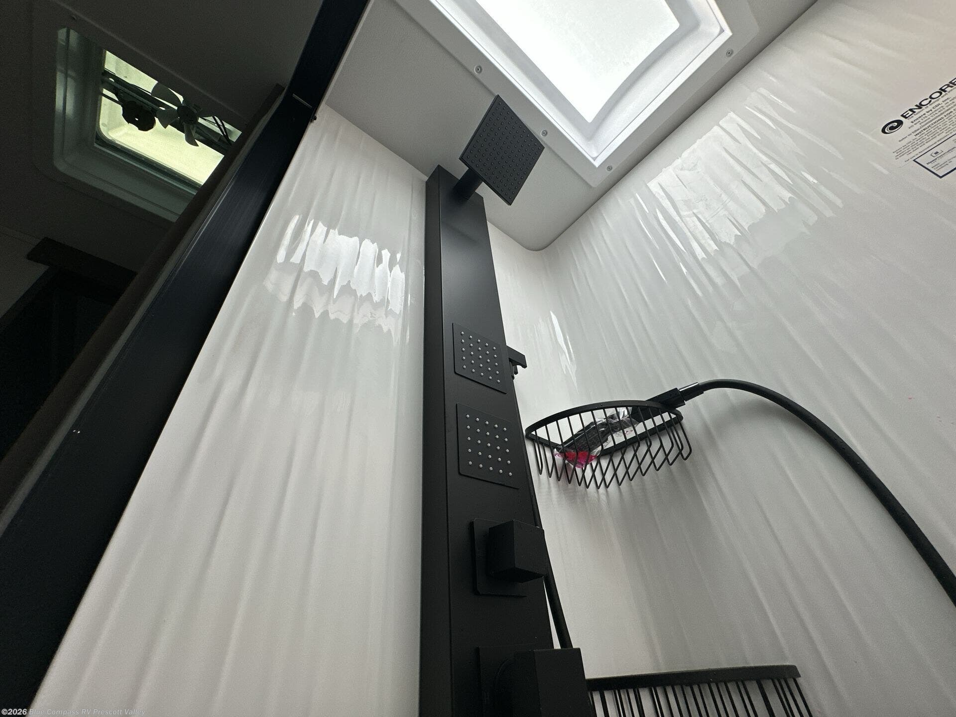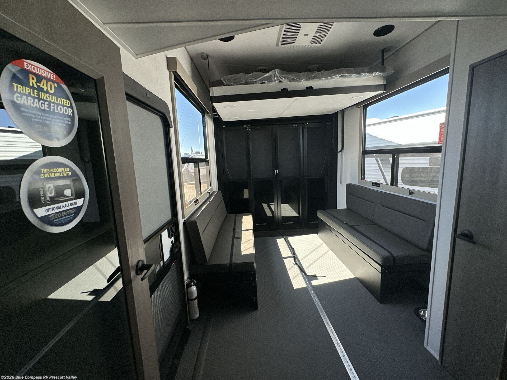 You want a toy hauler to carry your toys to the trails, and include many at-home comforts, and that's just what this unit delivers. A 14' separate garage includes an adjustable tie-down system, an optional Lifesuite System for more sleeping space, an optional half bath, plus washer and dryer prep. There is an overhead loft bed and an L-shaped sofa with recline in the main living area that offers sleeping space as well. Everyone can watch a movie on the LED TV with a fireplace below while sitting on the sofa, in the theatre seats, or while at the free standing dinette with four chairs. The chef will have upgraded appliances to make meals for everyone, an L-shaped countertop with a kitchen sink, and a USB charging outlet. You will love the shower with seat in the full bathroom with two space savings sliding doors that lead into the hallway, and into the front bedroom where you will have a walk-around queen bed, a slide out wardrobe and more USB charging outlets.