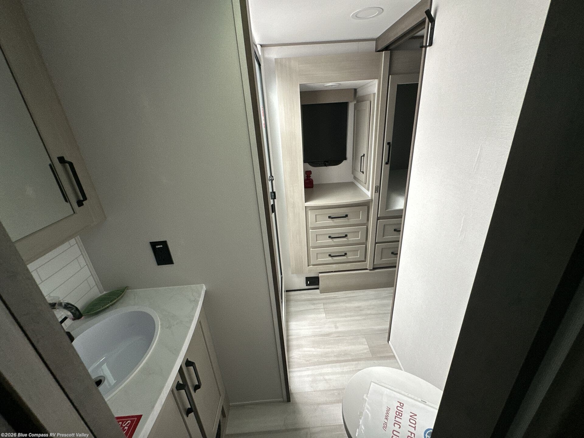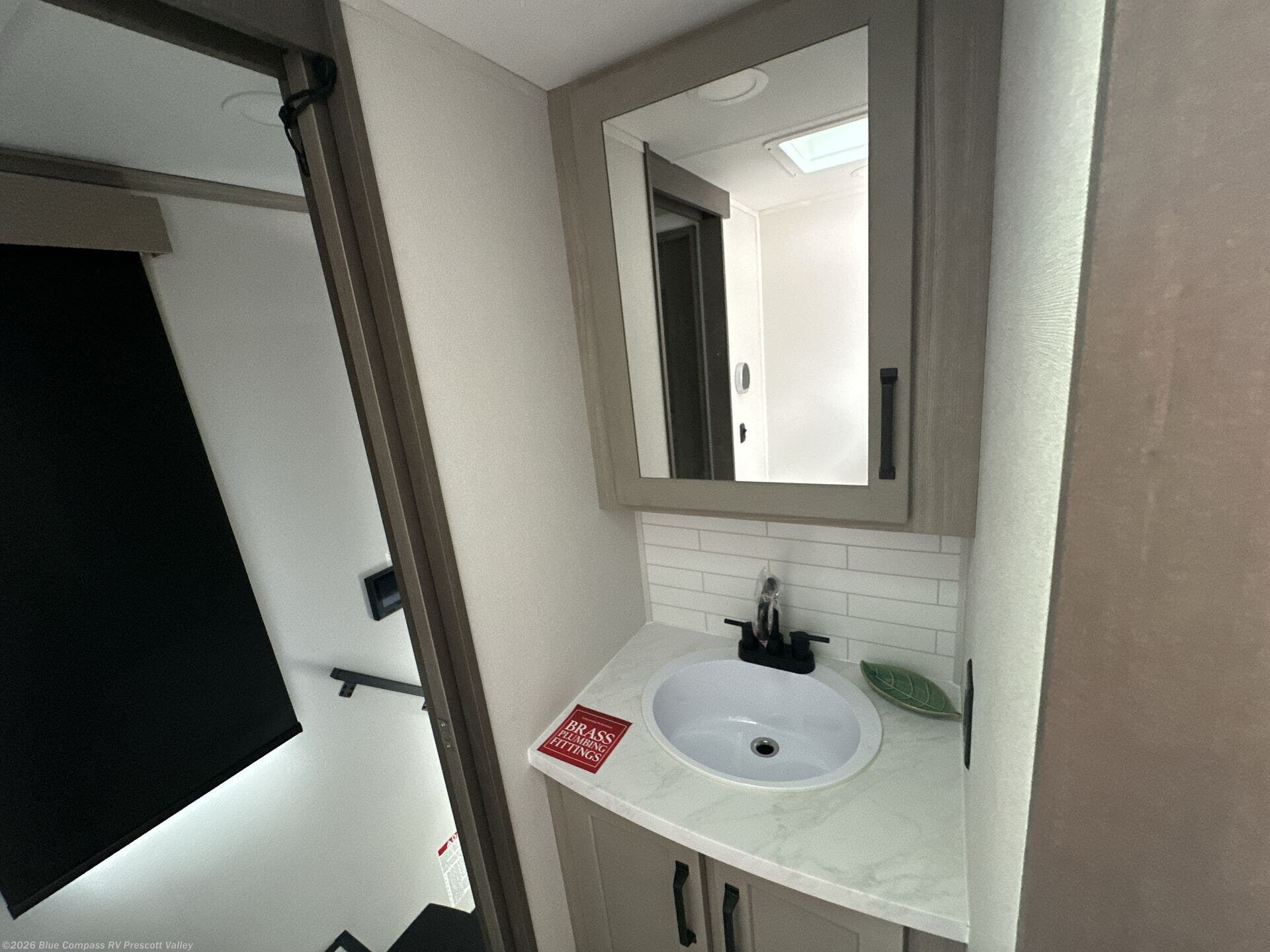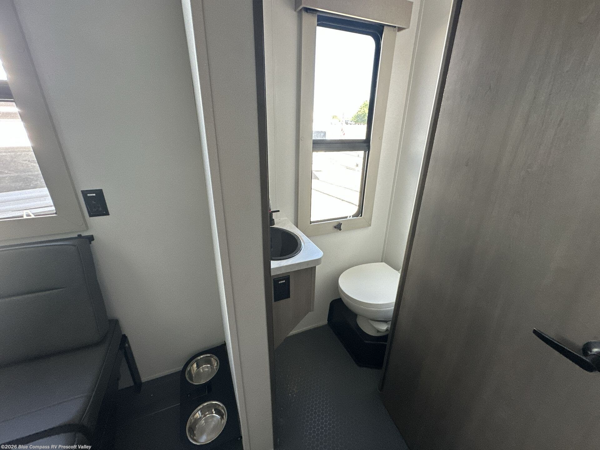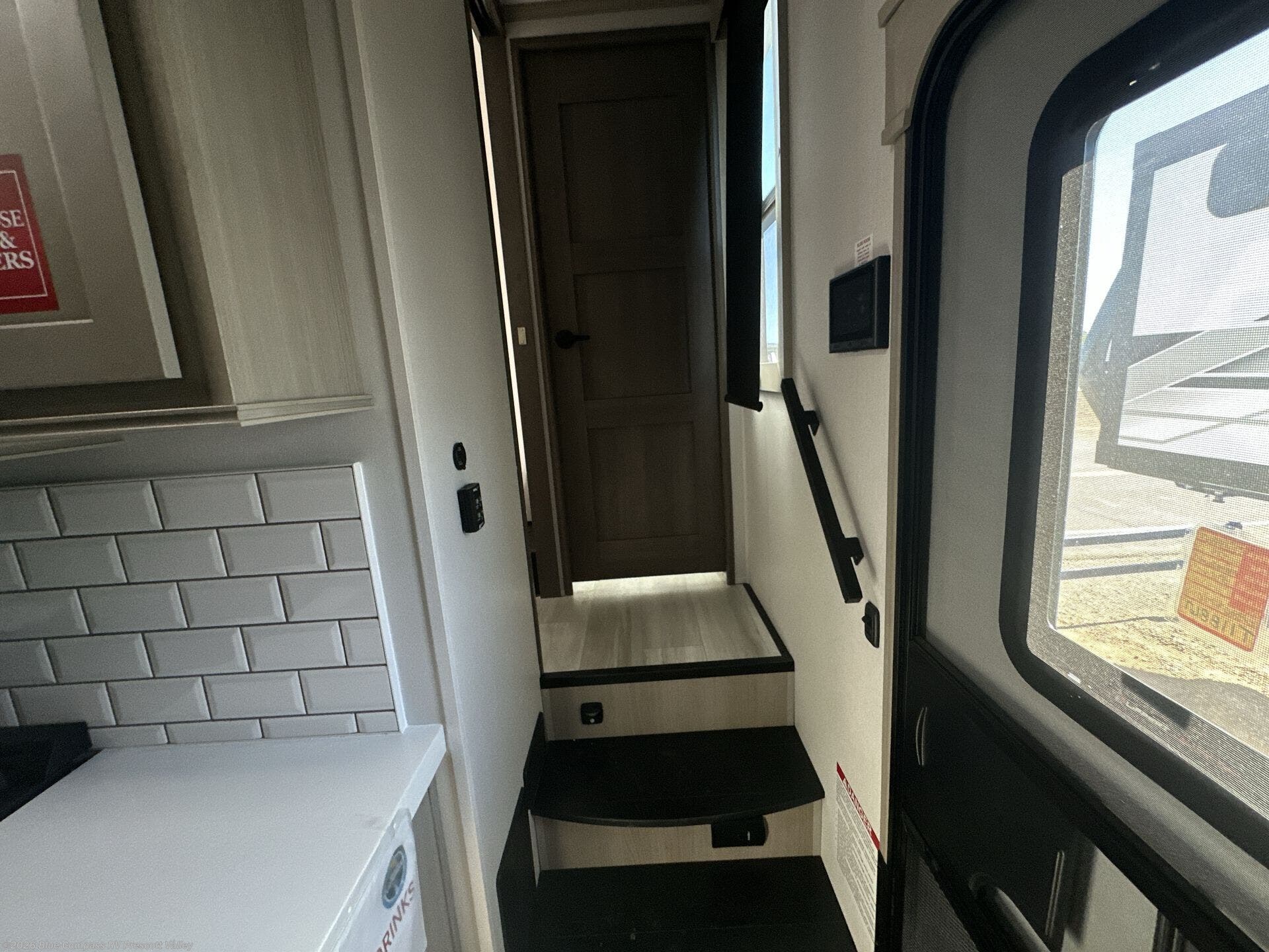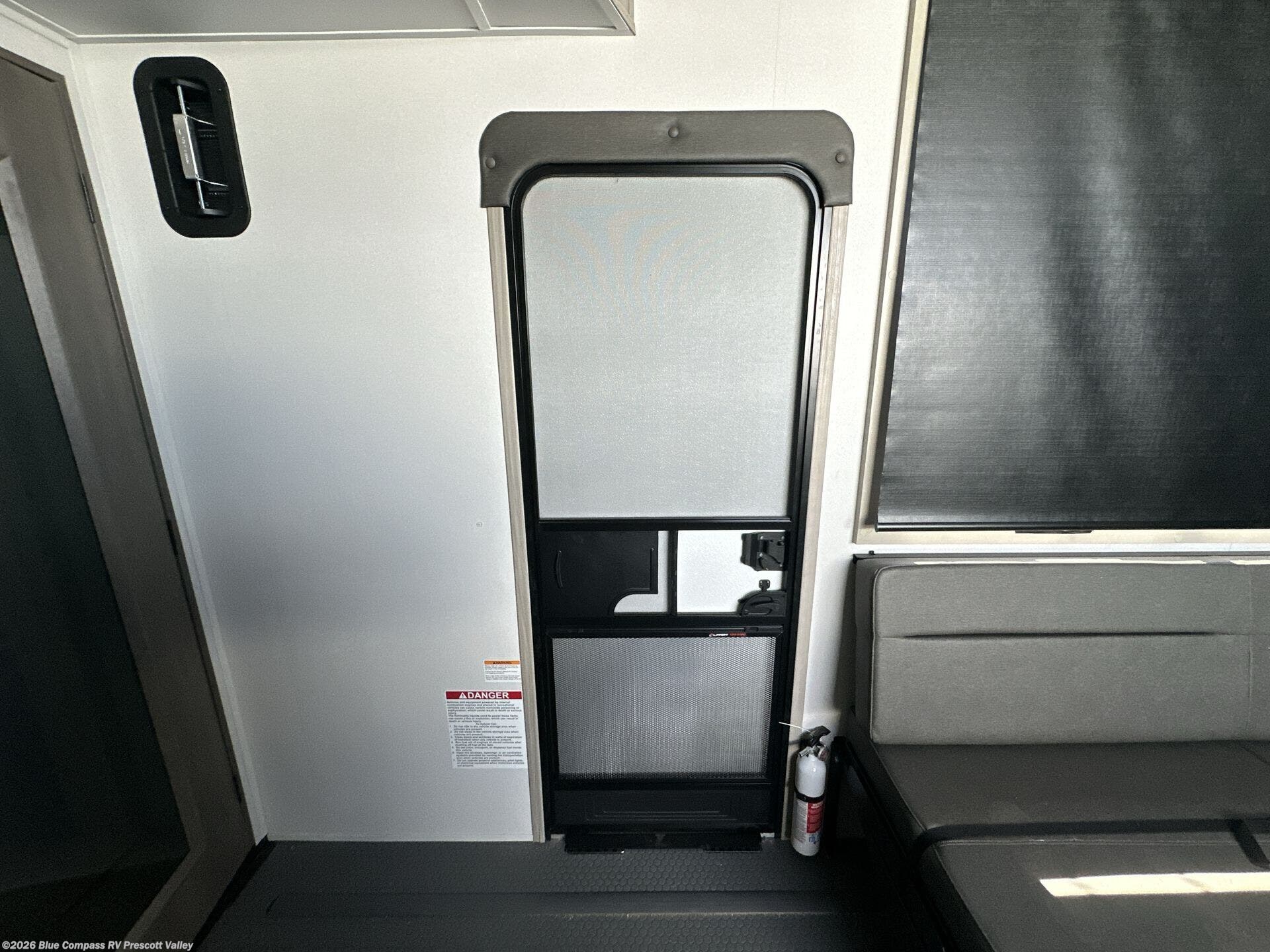You want a toy hauler to carry your toys to the trails, and include many at-home comforts, and that's just what this unit delivers. A 14' separate garage includes an adjustable tie-down system, an optional Lifesuite System for more sleeping space, an optional half bath, plus washer and dryer prep. There is an overhead loft bed and an L-shaped sofa with recline in the main living area that offers sleeping space as well. Everyone can watch a movie on the LED TV with a fireplace below while sitting on the sofa, in the theatre seats, or while at the free standing dinette with four chairs. The chef will have upgraded appliances to make meals for everyone, an L-shaped countertop with a kitchen sink, and a USB charging outlet. You will love the shower with seat in the full bathroom with two space savings sliding doors that lead into the hallway, and into the front bedroom where you will have a walk-around queen bed, a slide out wardrobe and more USB charging outlets.
