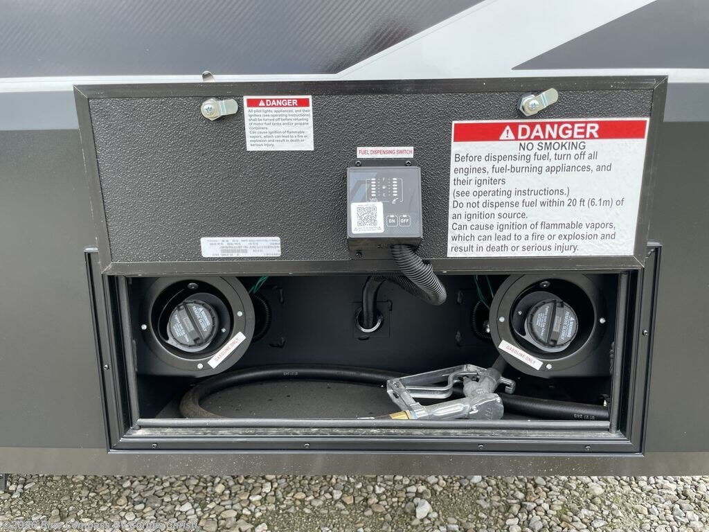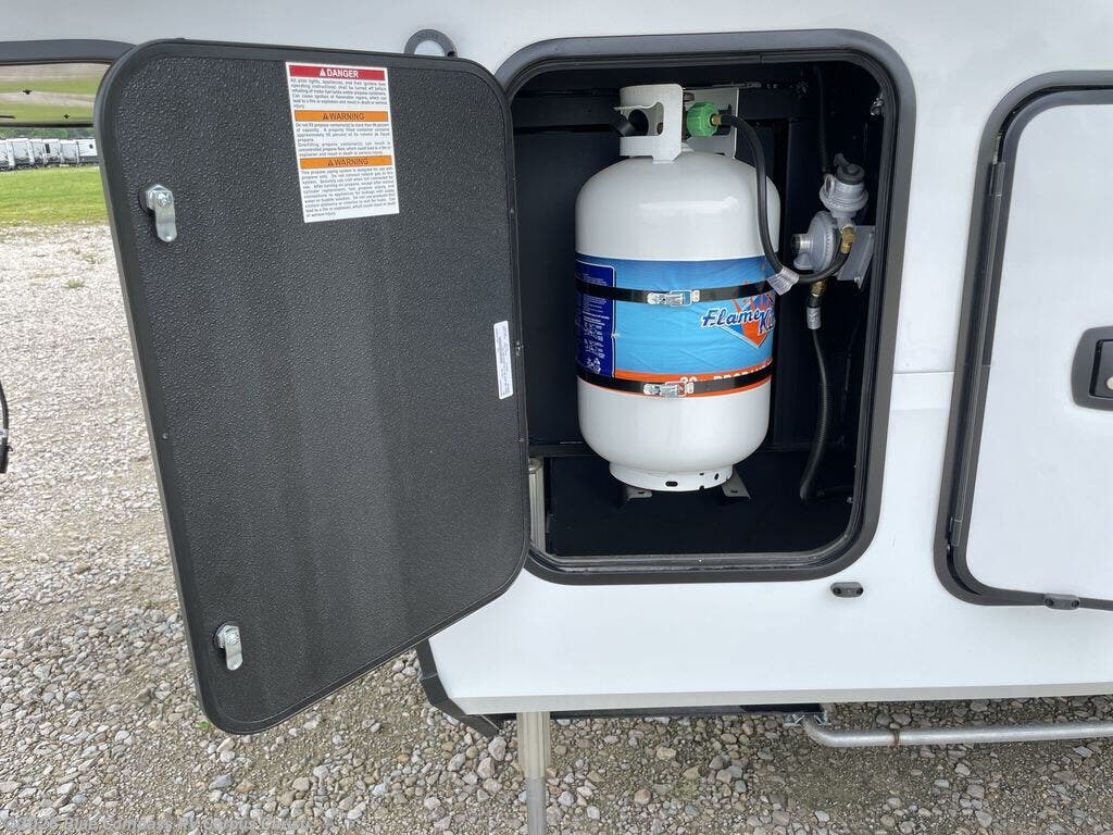 You want a toy hauler to carry your toys to the trails, and include many at-home comforts, and that's just what this unit delivers. A 14' separate garage includes an adjustable tie-down system, an optional Lifesuite System for more sleeping space, an optional half bath, plus washer and dryer prep. There is an overhead loft bed and an L-shaped sofa with recline in the main living area that offers sleeping space as well. Everyone can watch a movie on the LED TV with a fireplace below while sitting on the sofa, in the theatre seats, or while at the free standing dinette with four chairs. The chef will have upgraded appliances to make meals for everyone, an L-shaped countertop with a kitchen sink, and a USB charging outlet. You will love the shower with seat in the full bathroom with two space savings sliding doors that lead into the hallway, and into the front bedroom where you will have a walk-around queen bed, a slide out wardrobe and more USB charging outlets.