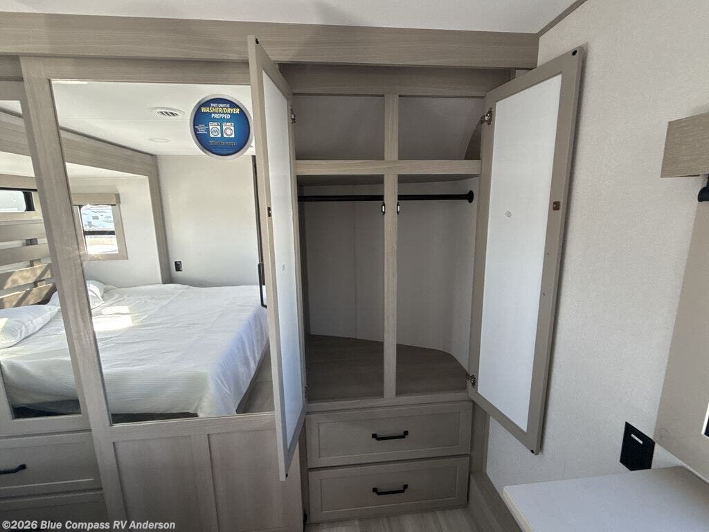 Any time spent in this spacious toy hauler will be time well spent! The 14' garage includes an overhead loft bed and a flip-up pet dish for your furry friends. If you're needing more sleeping space, you might want to choose the optional Liftsuite System and optional half bath. Once you enter in the main living area, you can relax on the L-shaped sofa with recline across from the fireplace, and there is a free-standing dinette if you want to play a game or two. The chef of your group will love the generous counter space in the kitchen, and the dual entry bath will let everyone stay clean throughout your trip! Head to the front master bedroom to enjoy the queen bed slide out with an optional king bed, a slide top dresser with TV prep, plus a large front closet, complete with washer and dryer prep!
