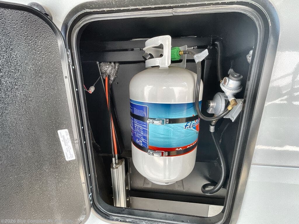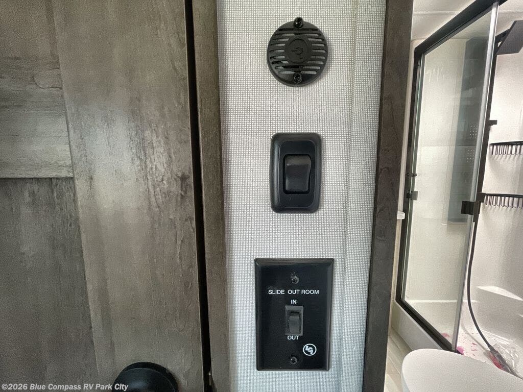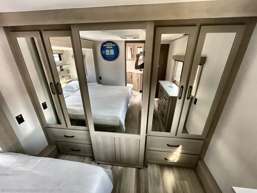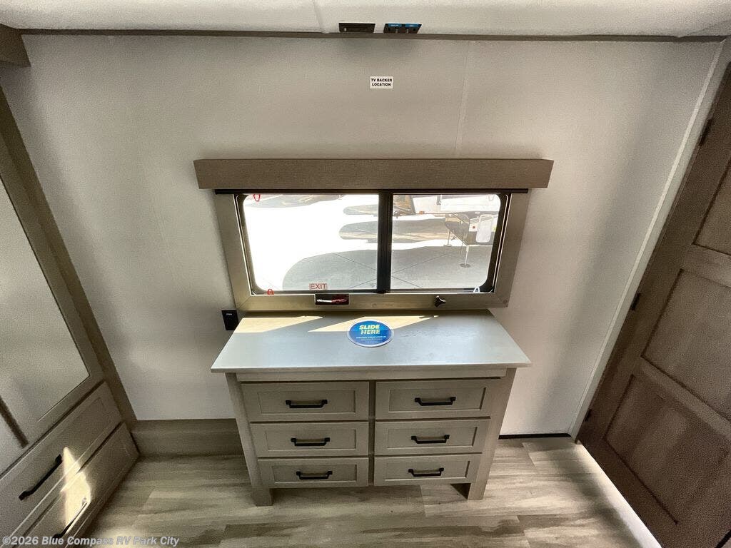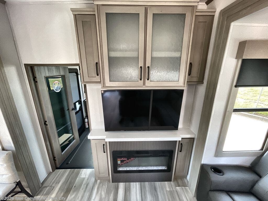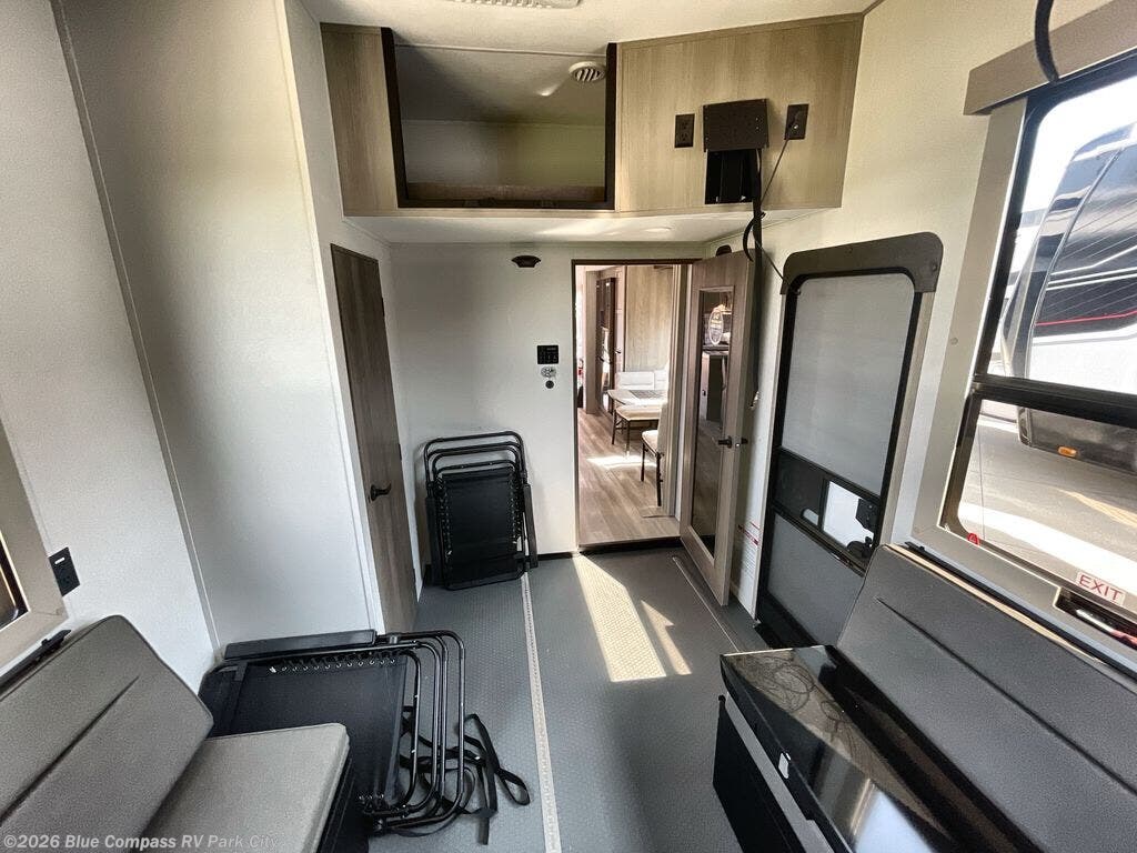 Any time spent in this spacious toy hauler will be time well spent! The 14' garage includes an overhead loft bed and a flip-up pet dish for your furry friends. If you're needing more sleeping space, you might want to choose the optional Liftsuite System and optional half bath. Once you enter in the main living area, you can relax on the L-shaped sofa with recline across from the fireplace, and there is a free-standing dinette if you want to play a game or two. The chef of your group will love the generous counter space in the kitchen, and the dual entry bath will let everyone stay clean throughout your trip! Head to the front master bedroom to enjoy the queen bed slide out with an optional king bed, a slide top dresser with TV prep, plus a large front closet, complete with washer and dryer prep!