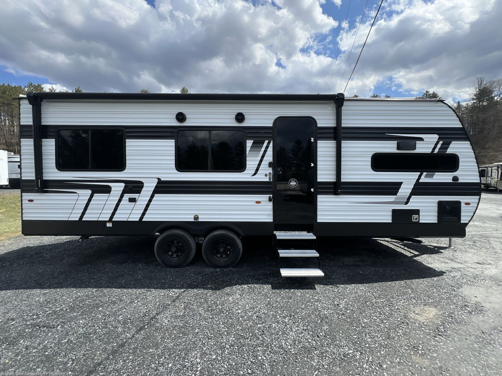 This is the perfect toy hauler for two campers looking for adventure! Once your toys are unloaded using the ramp door, you will enjoy the patio system that will provide more living space. The queen Murphy bed will provide seating and sleeping space, and there is TV prep across from the bed if you want the option to watch movies in bed. Head to the front corner kitchen to make lunch on the three burner range, and leftovers can go in the 8 cu. ft. 12V refrigerator. You'll find the full bath in the other front corner, which will allow you to freshen up after a day of trail riding! This model also includes a fold-up dinette where you can dine each day, or you can take your plate outdoors to sit under the 17' power awning!
