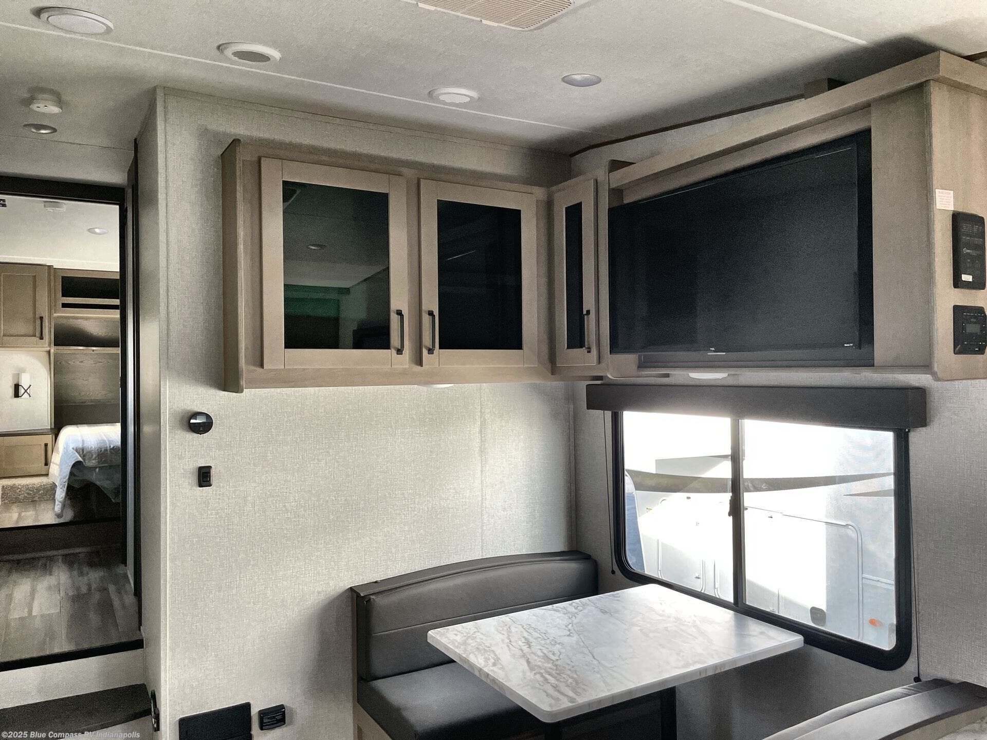 This rear kitchen fifth wheel is sure to meet all of your camping needs! Since the exterior length is only 26' 11", you can easily maneuver in and out of campgrounds. The rear kitchen includes ample counter space to prep meals, a three burner cooktop, and overhead storage for all your necessities. There is a 10 cu. ft. 12V refrigerator within the slide out that also includes the theater seating, and the U-shaped dinette provides a place to dine or play a card game. You will appreciate having convenient storage by the entry door, along with pull-out pet bowls, a functional wardrobe closet in the bedroom and an exterior pass-thru for belongings and camping gear. When you're ready to turn in for the night, the queen bed is sure to bring a great night's rest, while your guests sleep on the booth dinette or optional tri-fold sofa if you replace the theater seating!