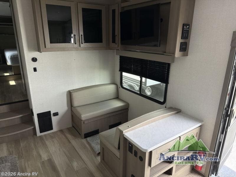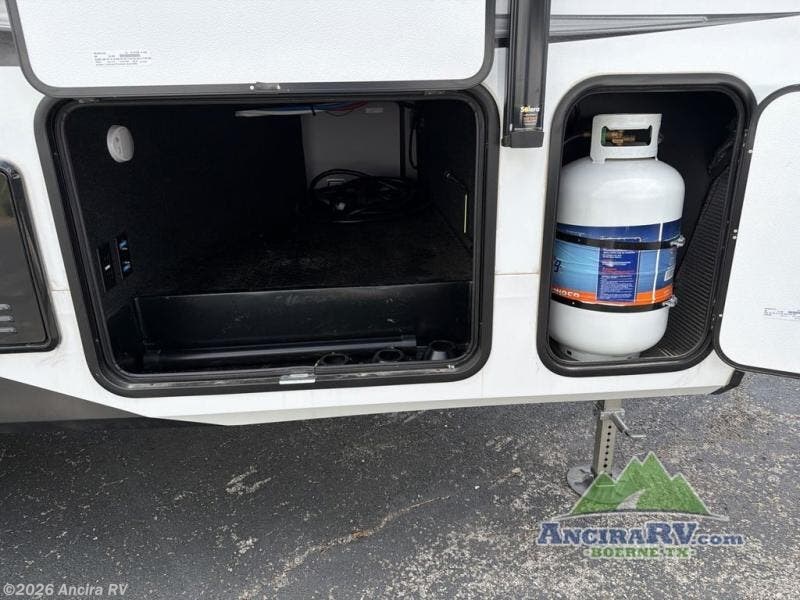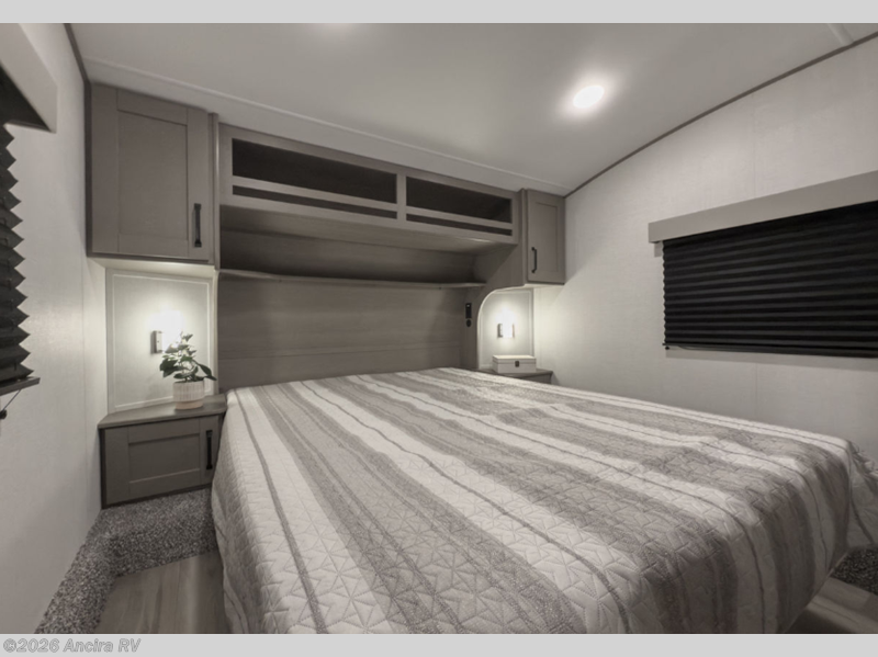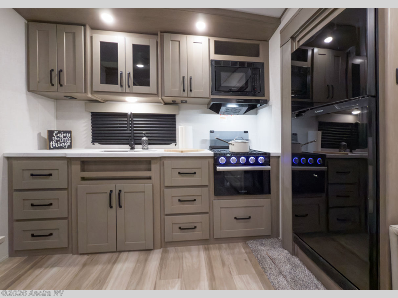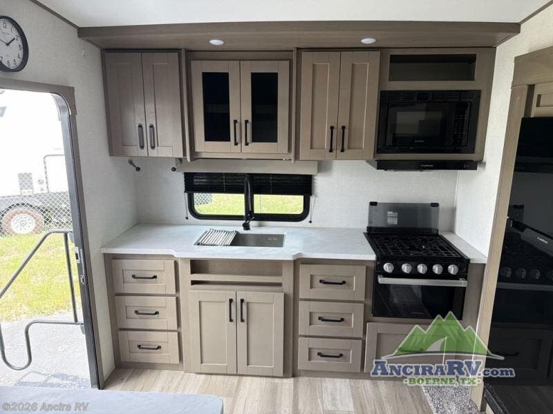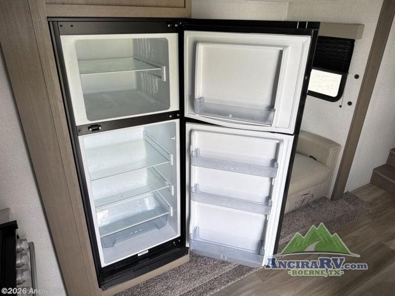 This rear kitchen fifth wheel is sure to meet all of your camping needs! Since the exterior length is only 26' 11", you can easily maneuver in and out of campgrounds. The rear kitchen includes ample counter space to prep meals, a three burner cooktop, and overhead storage for all your necessities. There is a 10 cu. ft. 12V refrigerator within the slide out that also includes the theater seating, and the U-shaped dinette provides a place to dine or play a card game. You will appreciate having convenient storage by the entry door, along with pull-out pet bowls, a functional wardrobe closet in the bedroom and an exterior pass-thru for belongings and camping gear. When you're ready to turn in for the night, the queen bed is sure to bring a great night's rest, while your guests sleep on the booth dinette or optional tri-fold sofa if you replace the theater seating!