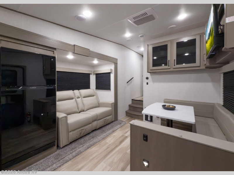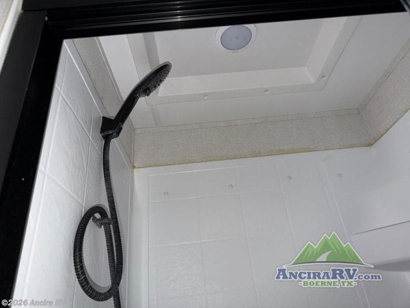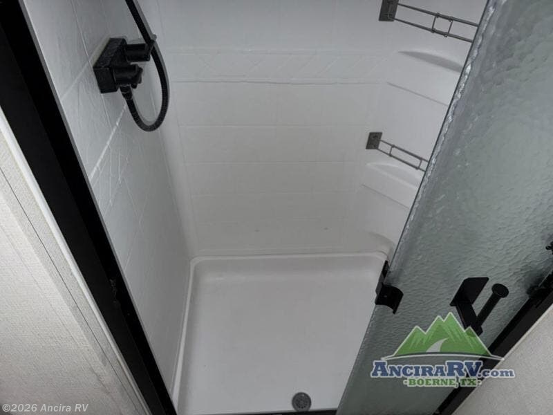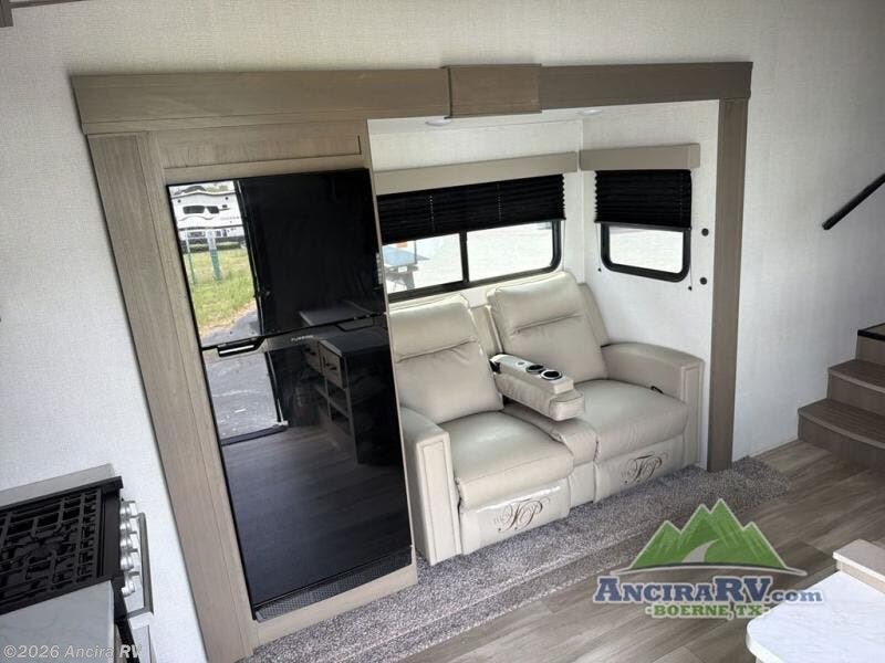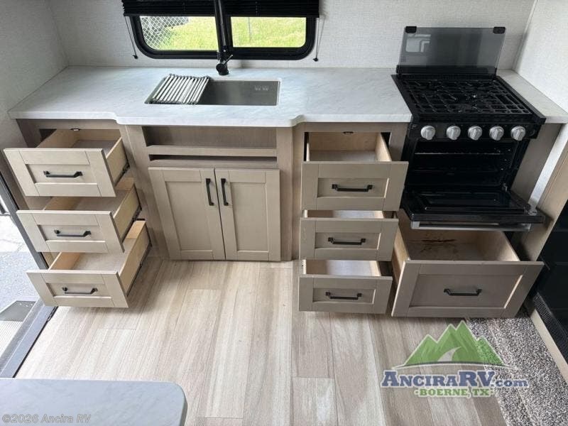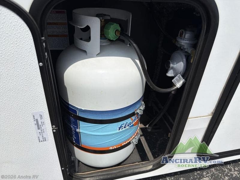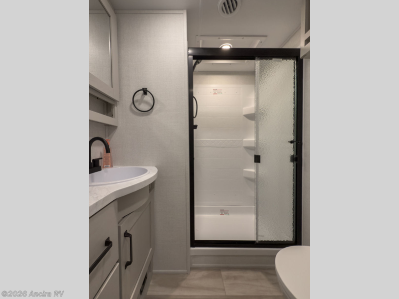 This rear kitchen fifth wheel is sure to meet all of your camping needs! Since the exterior length is only 26' 11", you can easily maneuver in and out of campgrounds. The rear kitchen includes ample counter space to prep meals, a three burner cooktop, and overhead storage for all your necessities. There is a 10 cu. ft. 12V refrigerator within the slide out that also includes the theater seating, and the U-shaped dinette provides a place to dine or play a card game. You will appreciate having convenient storage by the entry door, along with pull-out pet bowls, a functional wardrobe closet in the bedroom and an exterior pass-thru for belongings and camping gear. When you're ready to turn in for the night, the queen bed is sure to bring a great night's rest, while your guests sleep on the booth dinette or optional tri-fold sofa if you replace the theater seating!