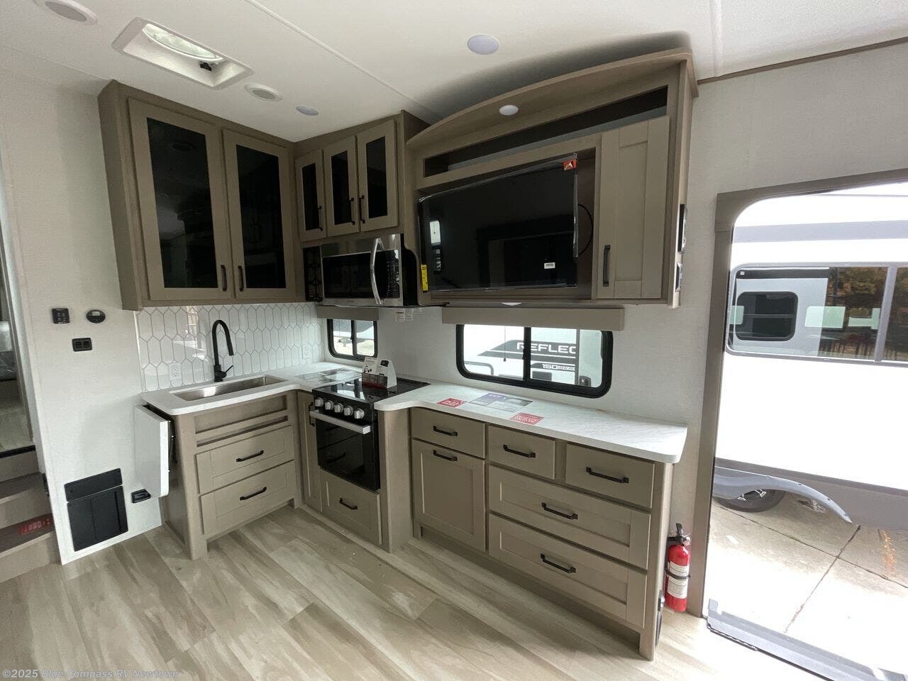 With any Reflection 150 Series fifth wheel by Grand Design, there is more available payload capacity and a broader range of half-ton trucks capable of towing this fifth wheel, and no slider hitch is needed thanks to the 90-degree turning radius which makes them short bed friendly and easier to tow. The mandatory Ultimate Power package provides a "One-Touch" automatic leveling system and a detachable power cord with LED light for easy setup, plus motion sensor pass-through lighting and entry lighting, and the Tire Linc TPMS will help you stay safe on the road. The interior offers residential luxury from the cabinetry and premium Congoleum flooring, to the booth dinette and residential-style window treatment. Make your refined decision today!