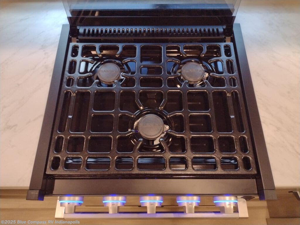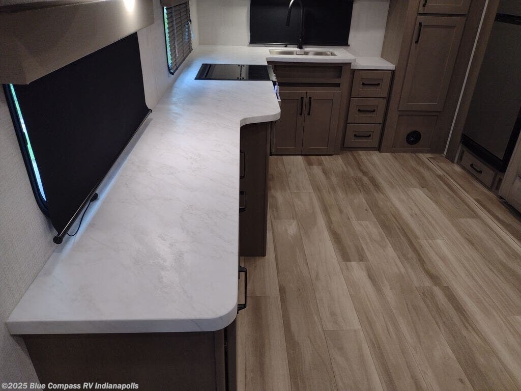 You will love this fifth wheel featuring a single slide for added interior living space and all the comforts and conveniences it provides you while you travel. The slide features a 78" theater seat plus there is a breakfast nook for more seating. Both can easily view the entertainment center with 40" TV. A rear kitchen indoors provides everything you need to create meals like home while on the road, and if you want to spend as much time outside as possible, then the outdoor griddle will certainly accommodate you for meals. Up front, a cozy private bedroom with queen bed, wardrobe, and overhead cabinets. Right next door, you will find a large walk-in shower, as well as a toilet, and a vanity with sink and linen cabinet for your towels and toiletries. You will also love the full unobstructed pass-through compartment for all of your gear, plus so much more!