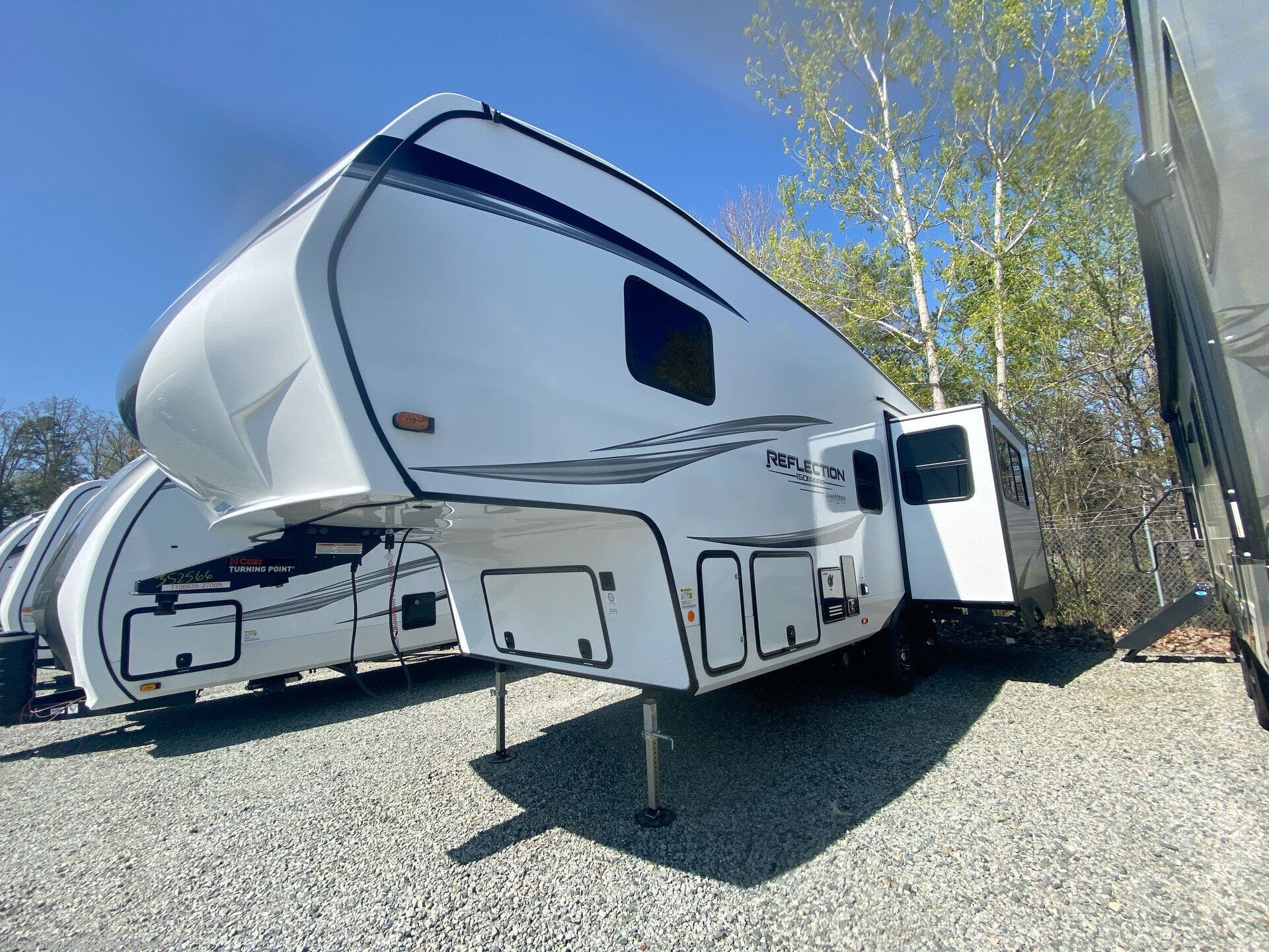 With any Reflection 150 Series fifth wheel by Grand Design, there is more available payload capacity and a broader range of half-ton trucks capable of towing this fifth wheel, and no slider hitch is needed thanks to the 90-degree turning radius which makes them short bed friendly and easier to tow. The mandatory Ultimate Power package provides a "One-Touch" automatic leveling system and a detachable power cord with LED light for easy setup, plus motion sensor pass-through lighting and entry lighting, and the Tire Linc TPMS will help you stay safe on the road. The interior offers residential luxury from the cabinetry and premium Congoleum flooring, to the booth dinette and residential-style window treatment. Make your refined decision today!