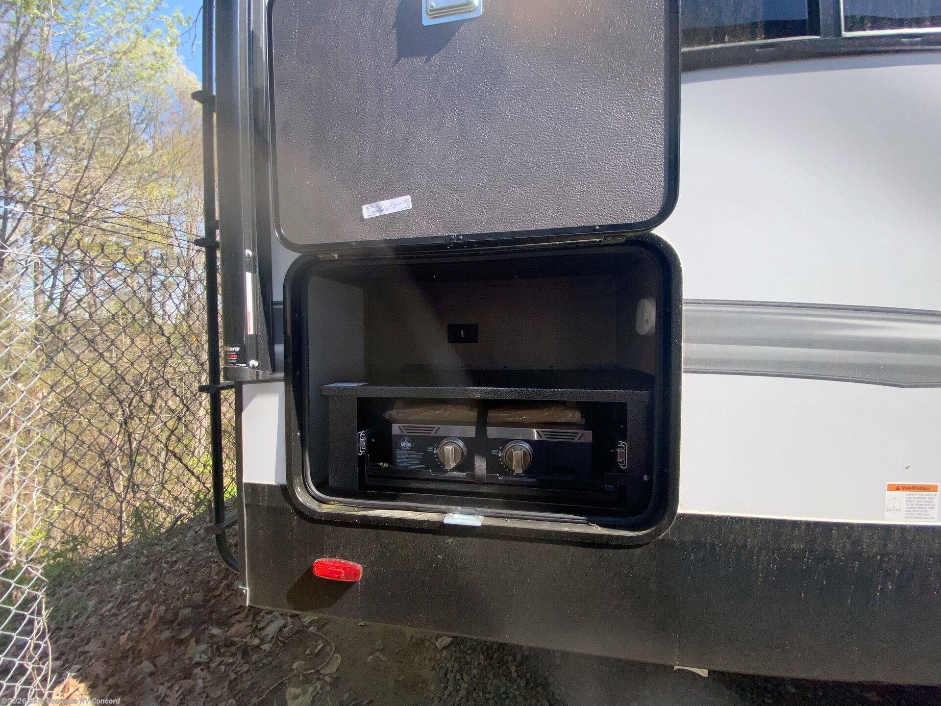 You will love this fifth wheel featuring a single slide for added interior living space and all the comforts and conveniences it provides you while you travel. The slide features a 78" theater seat plus there is a breakfast nook for more seating. Both can easily view the entertainment center with 40" TV. A rear kitchen indoors provides everything you need to create meals like home while on the road, and if you want to spend as much time outside as possible, then the outdoor griddle will certainly accommodate you for meals. Up front, a cozy private bedroom with queen bed, wardrobe, and overhead cabinets. Right next door, you will find a large walk-in shower, as well as a toilet, and a vanity with sink and linen cabinet for your towels and toiletries. You will also love the full unobstructed pass-through compartment for all of your gear, plus so much more!