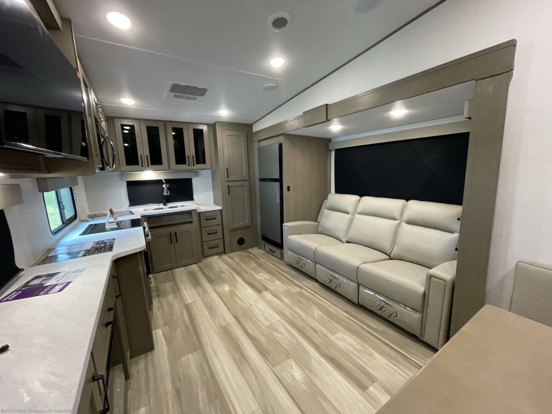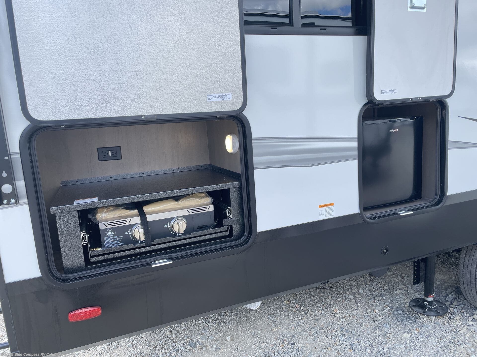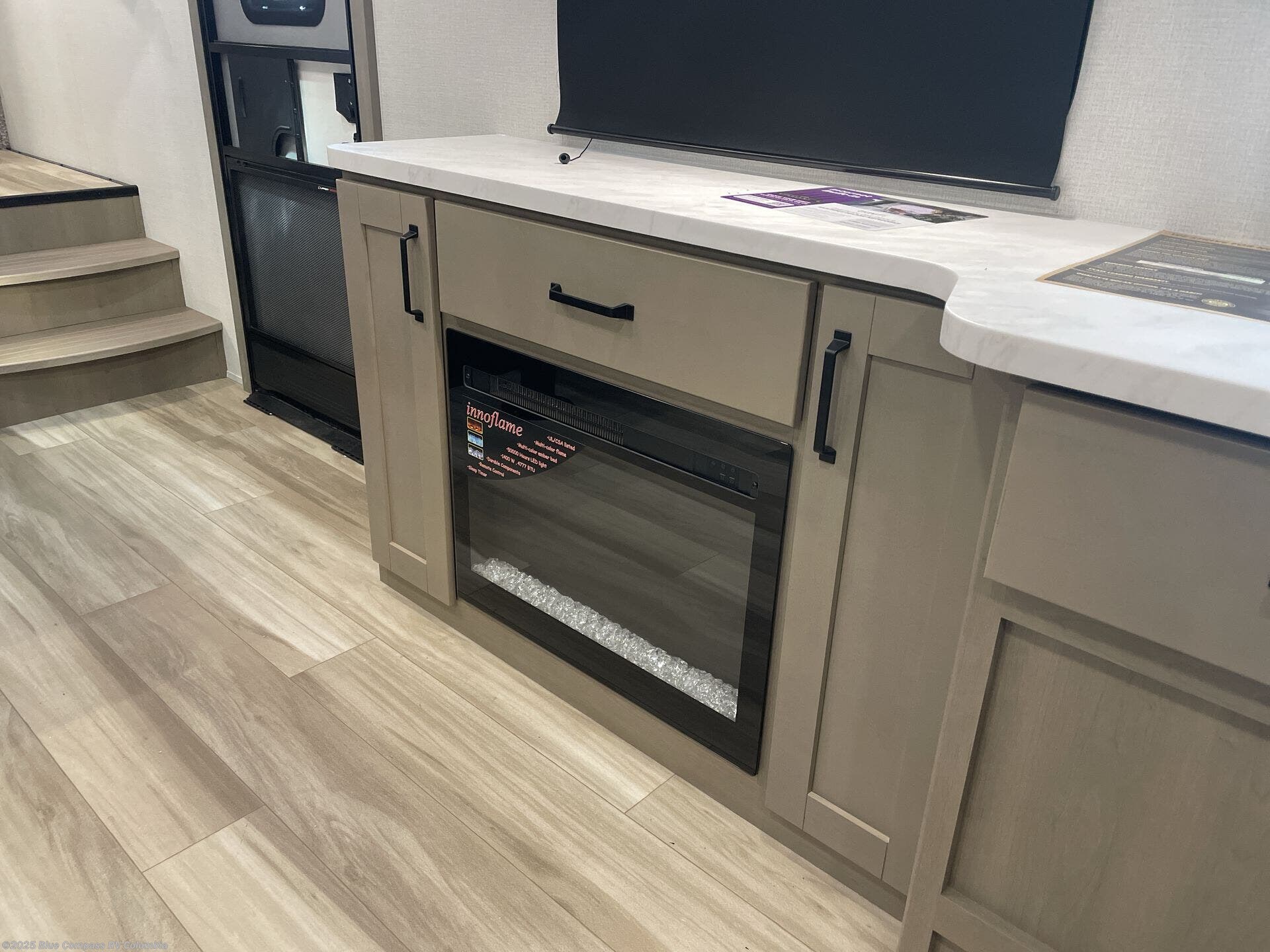 You will love this fifth wheel featuring a single slide for added interior living space and all the comforts and conveniences it provides you while you travel. The slide features a 78" theater seat plus there is a breakfast nook for more seating. Both can easily view the entertainment center with 40" TV. A rear kitchen indoors provides everything you need to create meals like home while on the road, and if you want to spend as much time outside as possible, then the outdoor griddle will certainly accommodate you for meals. Up front, a cozy private bedroom with queen bed, wardrobe, and overhead cabinets. Right next door, you will find a large walk-in shower, as well as a toilet, and a vanity with sink and linen cabinet for your towels and toiletries. You will also love the full unobstructed pass-through compartment for all of your gear, plus so much more!