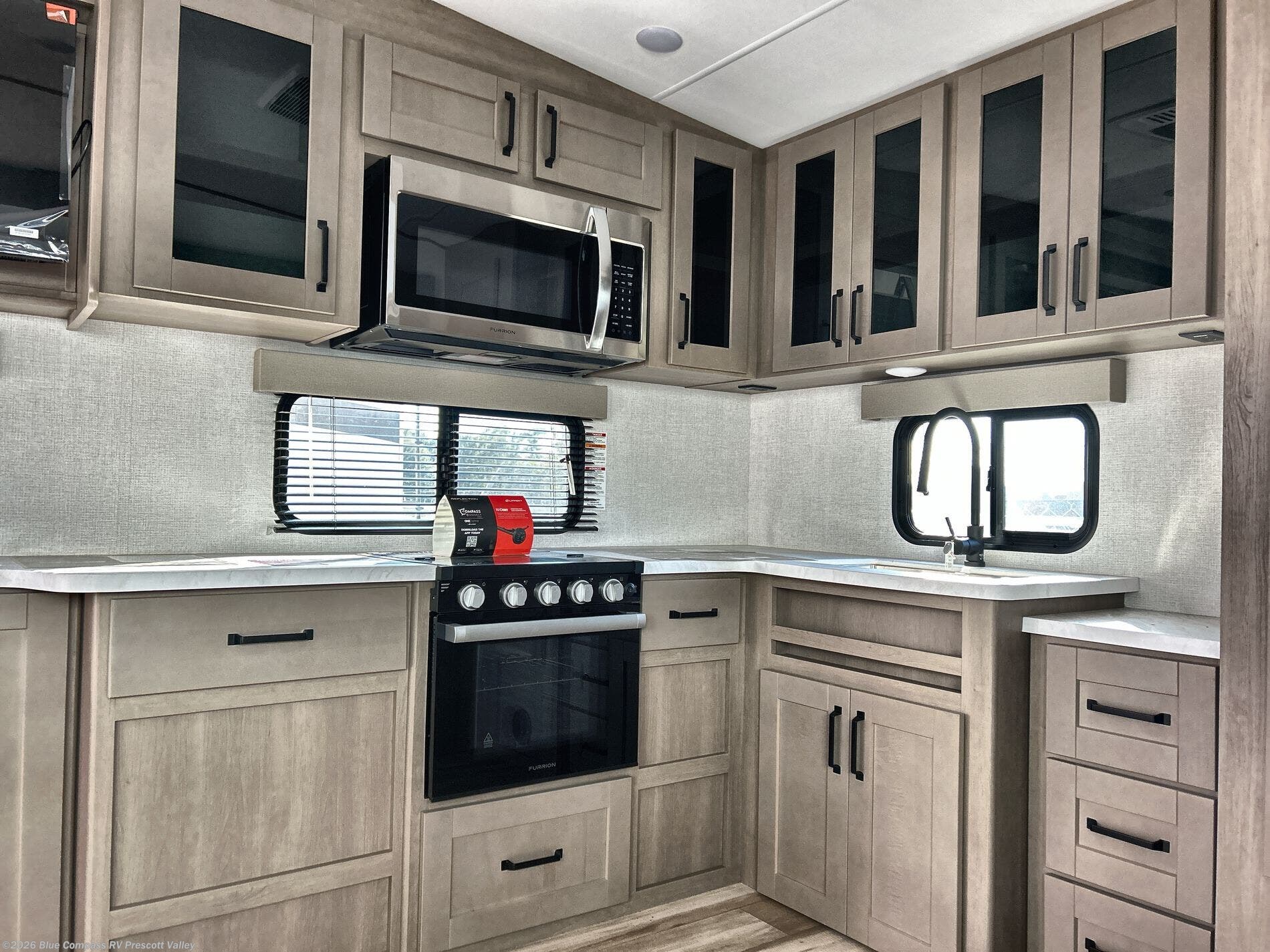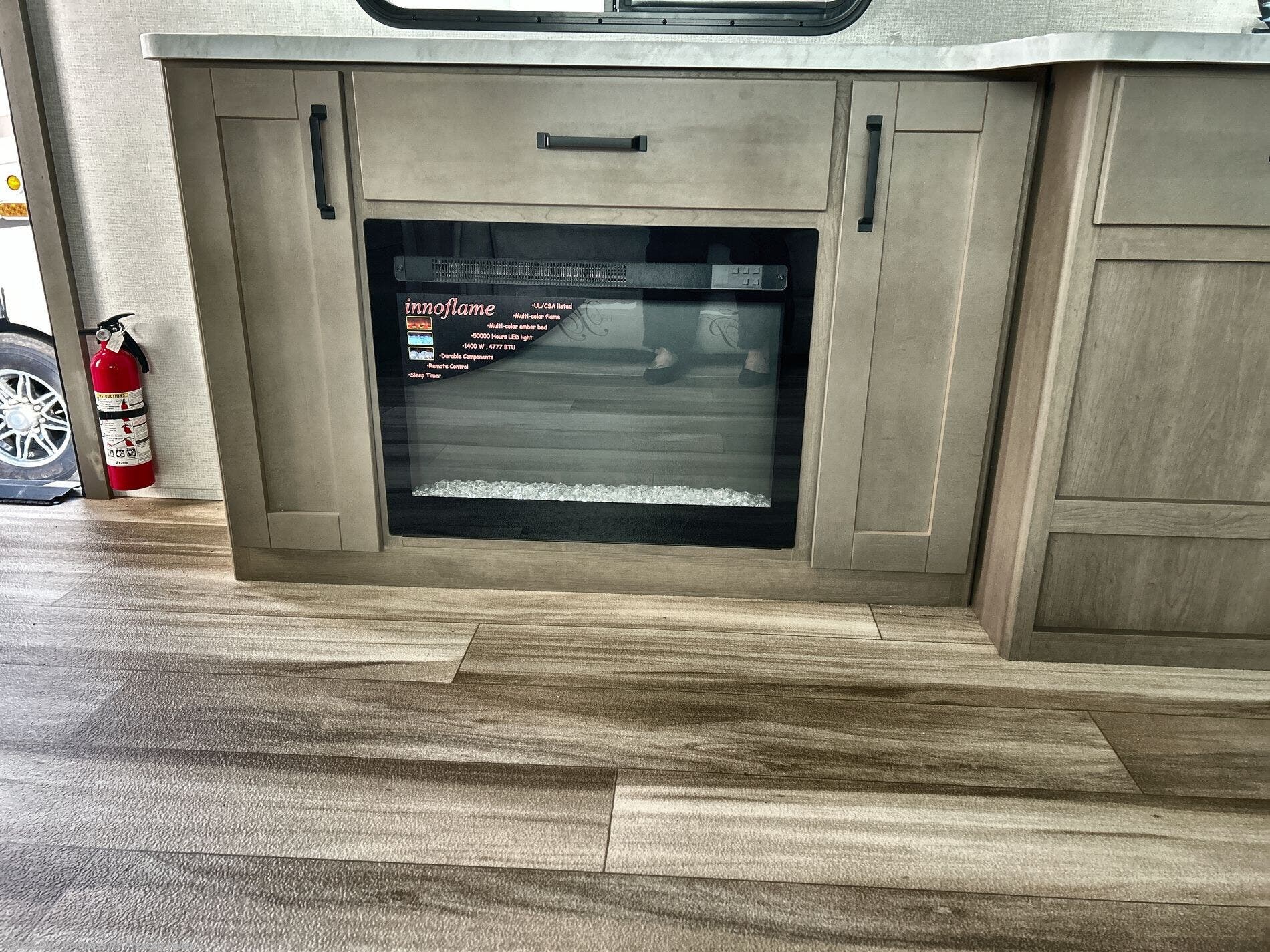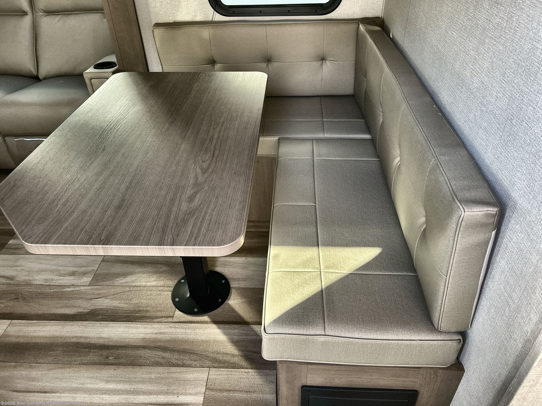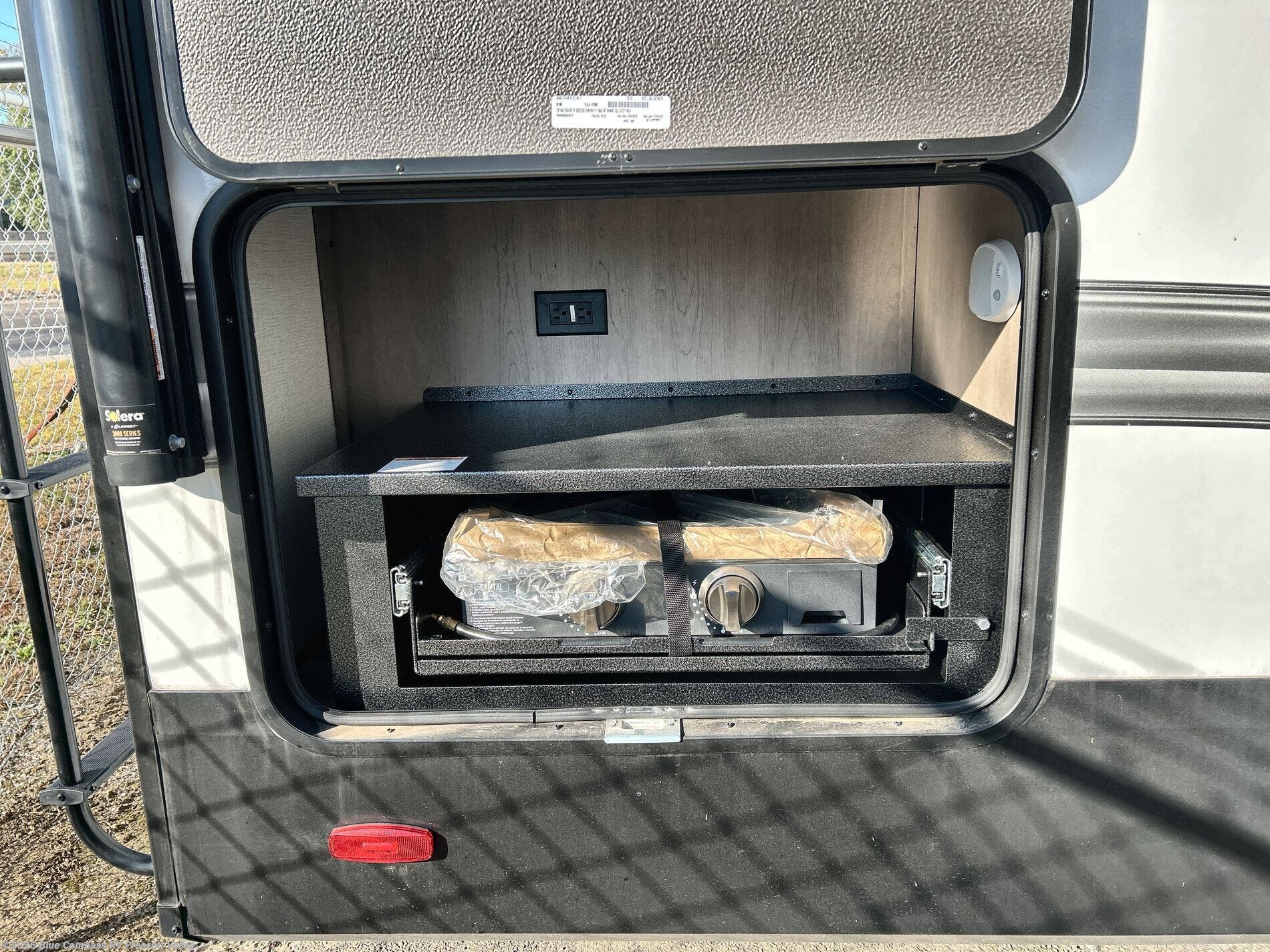 You will love this fifth wheel featuring a single slide for added interior living space and all the comforts and conveniences it provides you while you travel. The slide features a 78" theater seat plus there is a breakfast nook for more seating. Both can easily view the entertainment center with 40" TV. A rear kitchen indoors provides everything you need to create meals like home while on the road, and if you want to spend as much time outside as possible, then the outdoor griddle will certainly accommodate you for meals. Up front, a cozy private bedroom with queen bed, wardrobe, and overhead cabinets. Right next door, you will find a large walk-in shower, as well as a toilet, and a vanity with sink and linen cabinet for your towels and toiletries. You will also love the full unobstructed pass-through compartment for all of your gear, plus so much more!