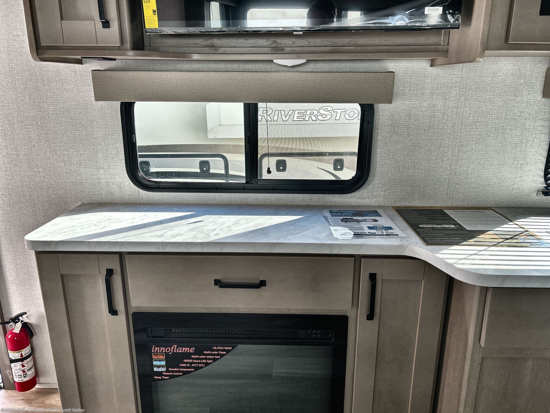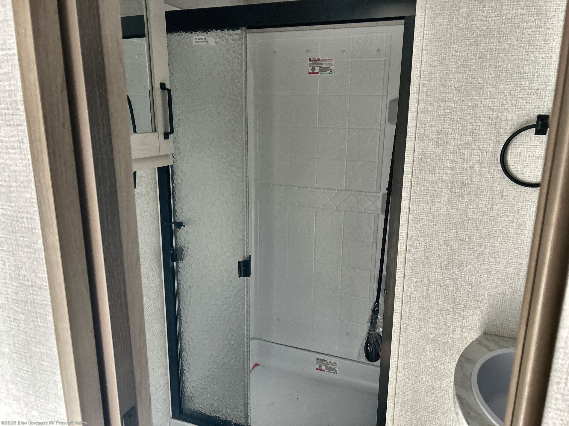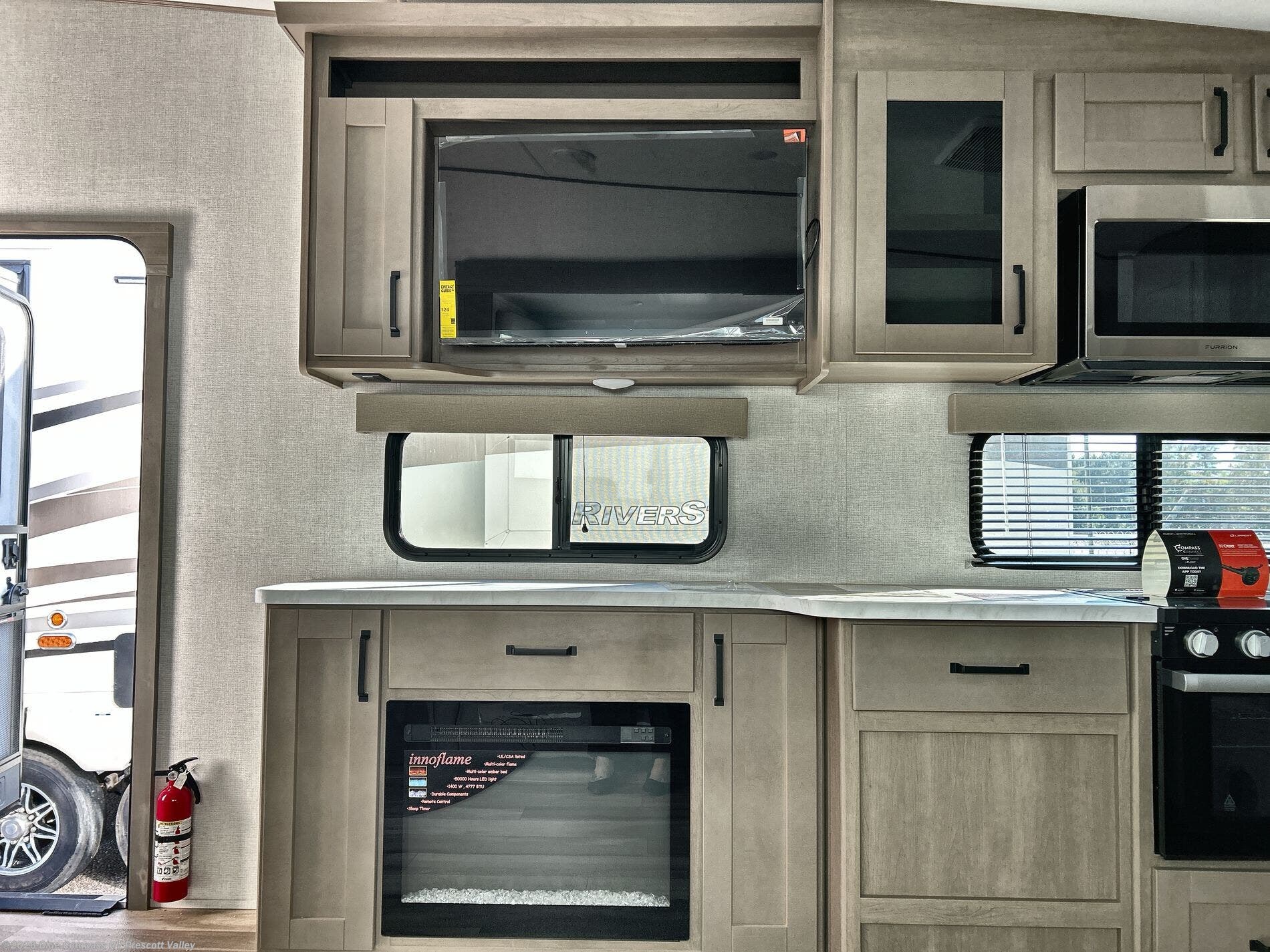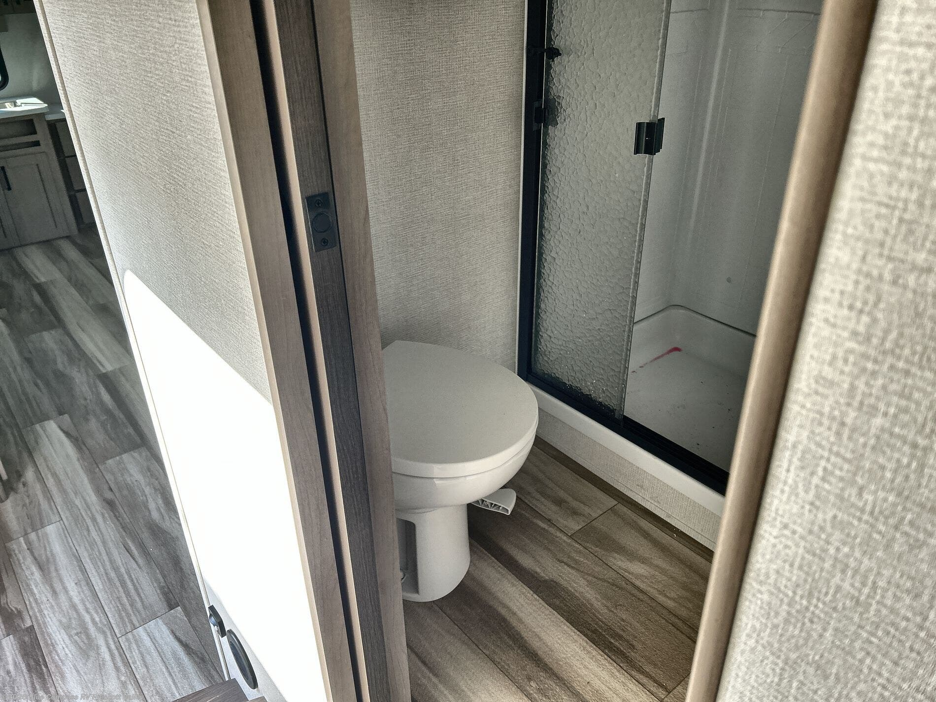 You will love this fifth wheel featuring a single slide for added interior living space and all the comforts and conveniences it provides you while you travel. The slide features a 78" theater seat plus there is a breakfast nook for more seating. Both can easily view the entertainment center with 40" TV. A rear kitchen indoors provides everything you need to create meals like home while on the road, and if you want to spend as much time outside as possible, then the outdoor griddle will certainly accommodate you for meals. Up front, a cozy private bedroom with queen bed, wardrobe, and overhead cabinets. Right next door, you will find a large walk-in shower, as well as a toilet, and a vanity with sink and linen cabinet for your towels and toiletries. You will also love the full unobstructed pass-through compartment for all of your gear, plus so much more!