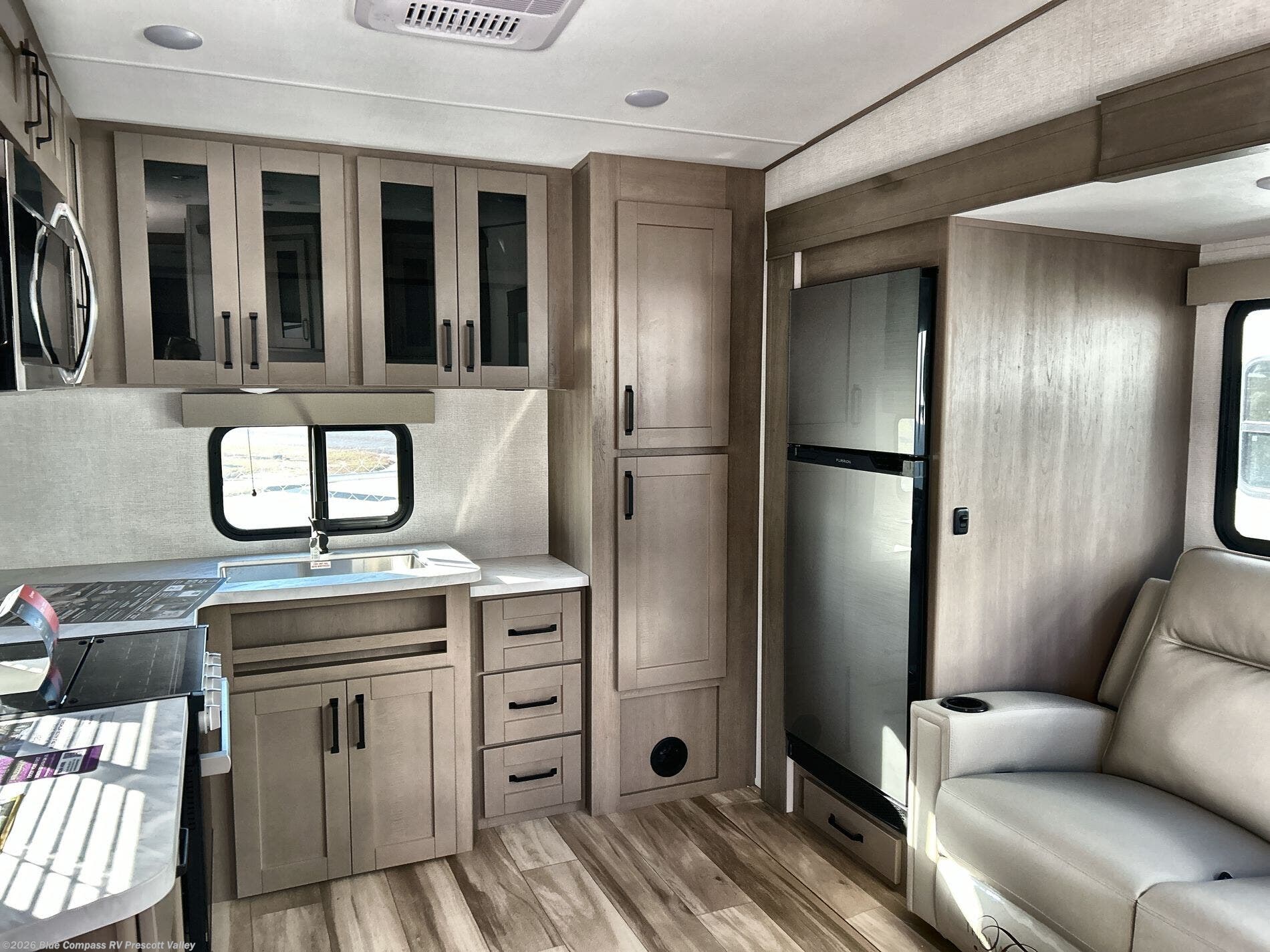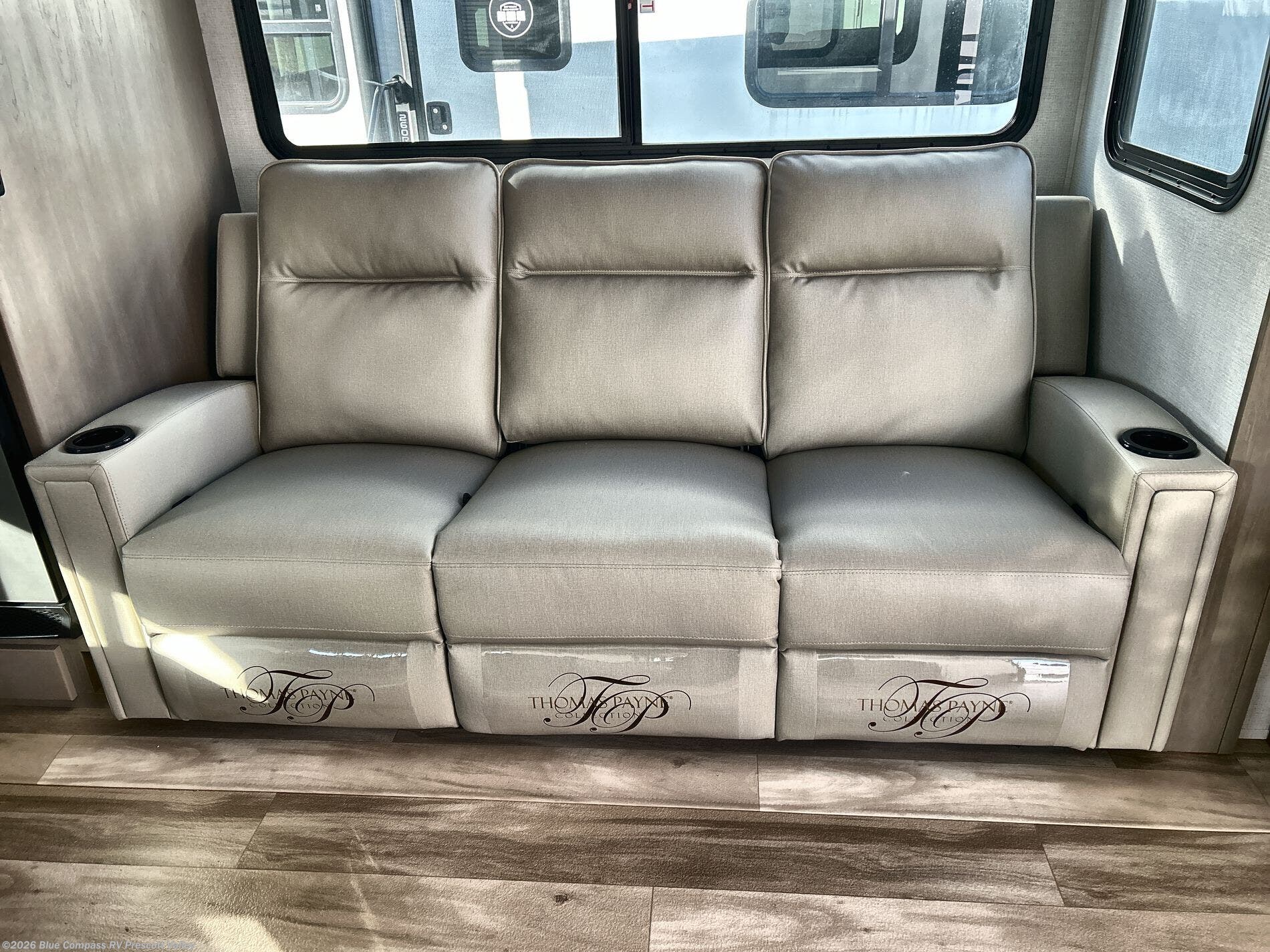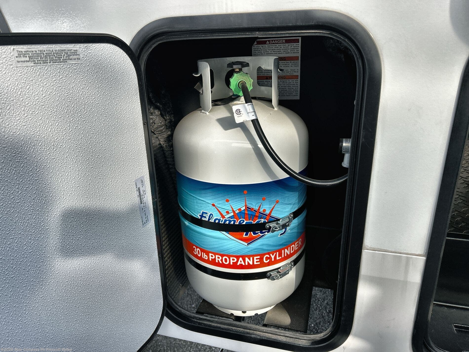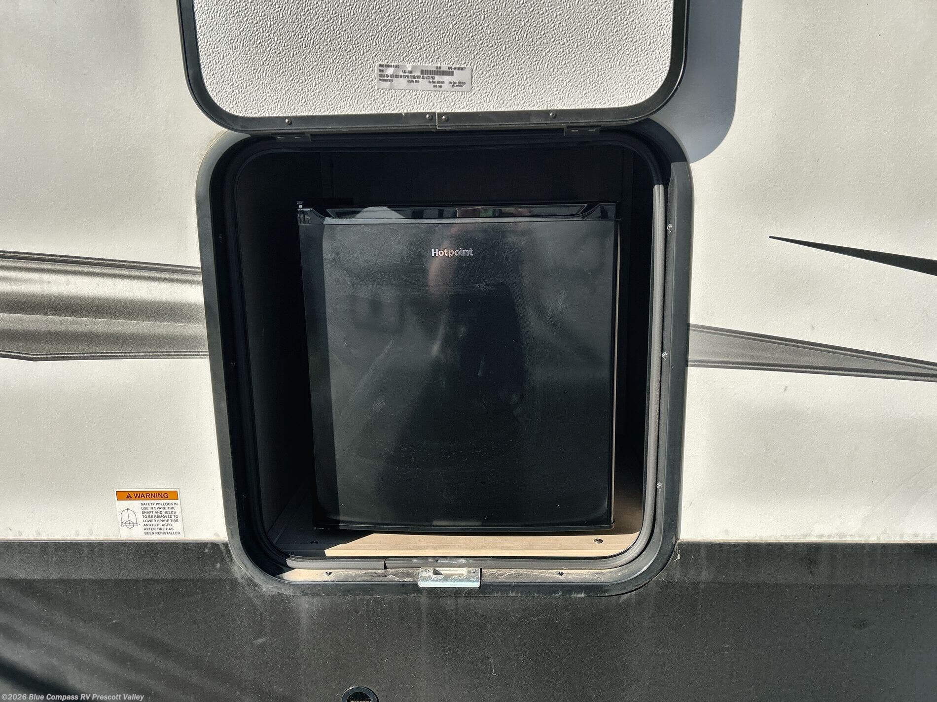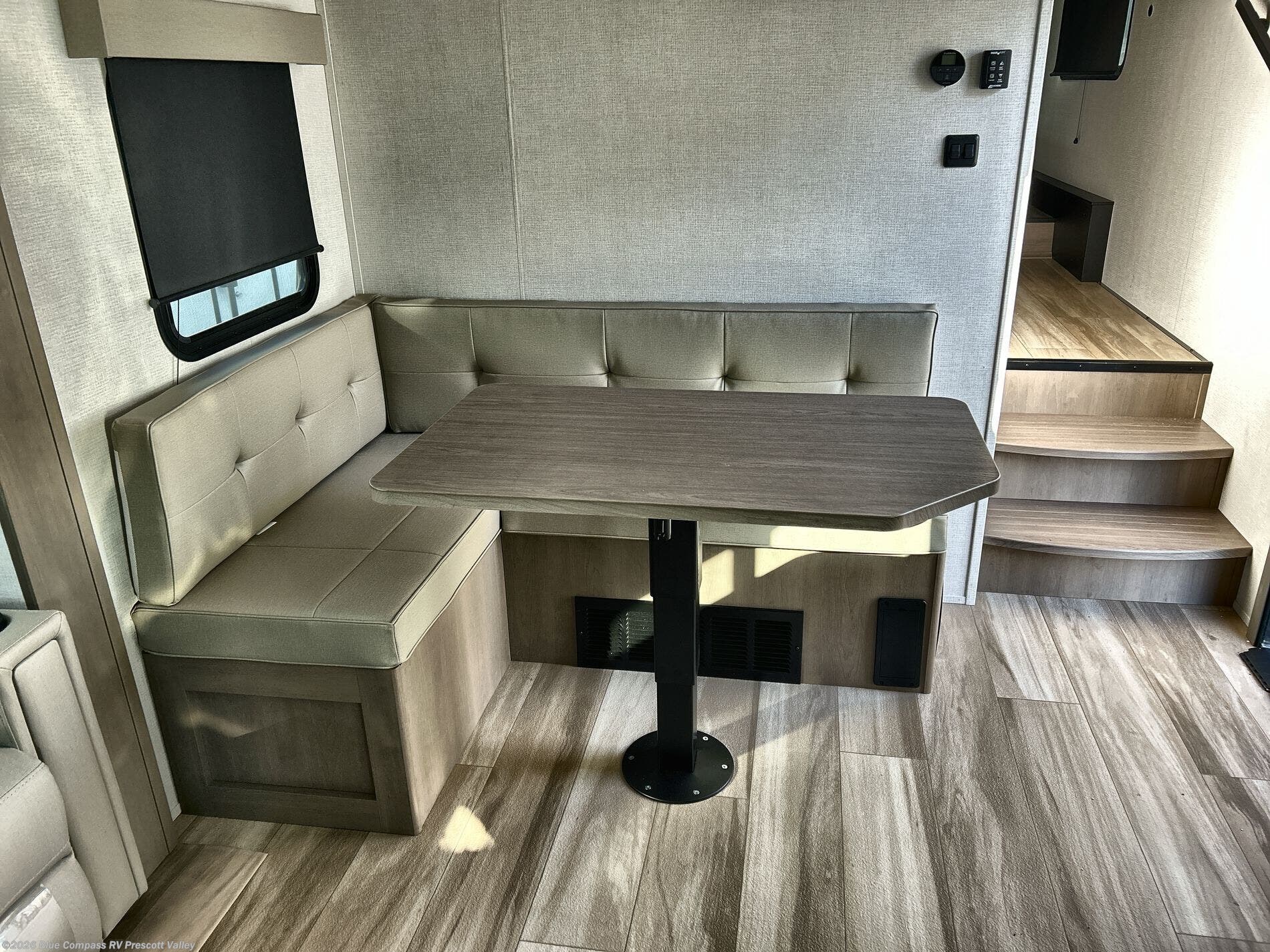 You will love this fifth wheel featuring a single slide for added interior living space and all the comforts and conveniences it provides you while you travel. The slide features a 78" theater seat plus there is a breakfast nook for more seating. Both can easily view the entertainment center with 40" TV. A rear kitchen indoors provides everything you need to create meals like home while on the road, and if you want to spend as much time outside as possible, then the outdoor griddle will certainly accommodate you for meals. Up front, a cozy private bedroom with queen bed, wardrobe, and overhead cabinets. Right next door, you will find a large walk-in shower, as well as a toilet, and a vanity with sink and linen cabinet for your towels and toiletries. You will also love the full unobstructed pass-through compartment for all of your gear, plus so much more!