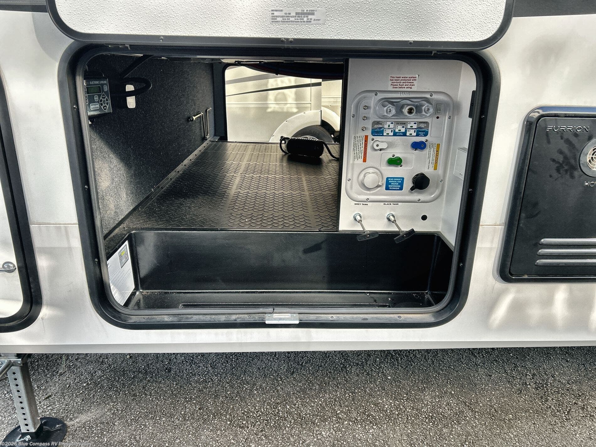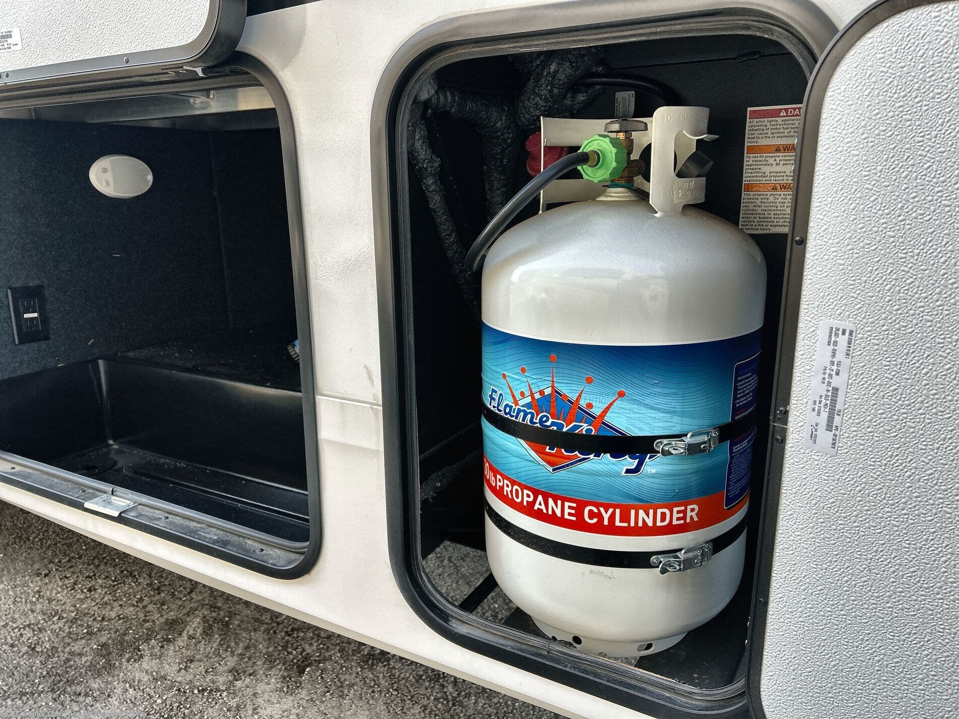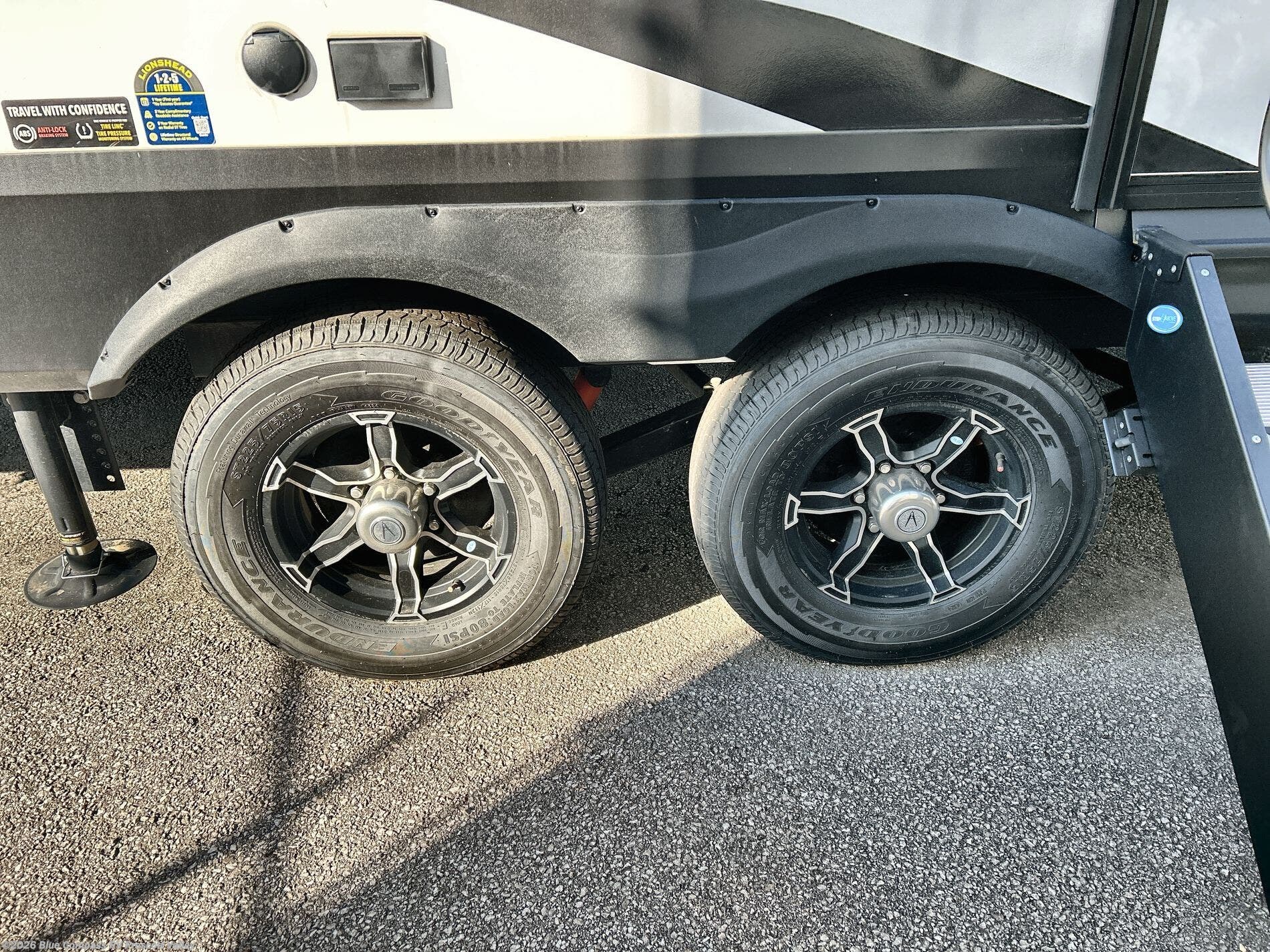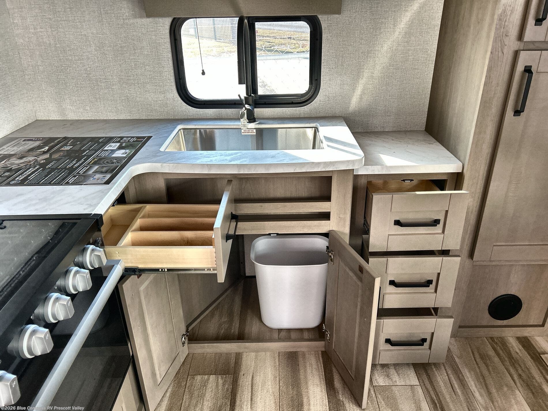 You will love this fifth wheel featuring a single slide for added interior living space and all the comforts and conveniences it provides you while you travel. The slide features a 78" theater seat plus there is a breakfast nook for more seating. Both can easily view the entertainment center with 40" TV. A rear kitchen indoors provides everything you need to create meals like home while on the road, and if you want to spend as much time outside as possible, then the outdoor griddle will certainly accommodate you for meals. Up front, a cozy private bedroom with queen bed, wardrobe, and overhead cabinets. Right next door, you will find a large walk-in shower, as well as a toilet, and a vanity with sink and linen cabinet for your towels and toiletries. You will also love the full unobstructed pass-through compartment for all of your gear, plus so much more!